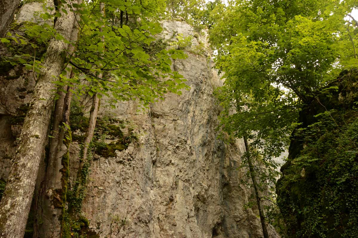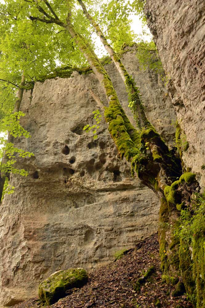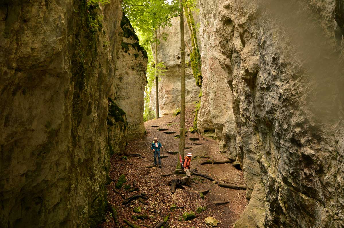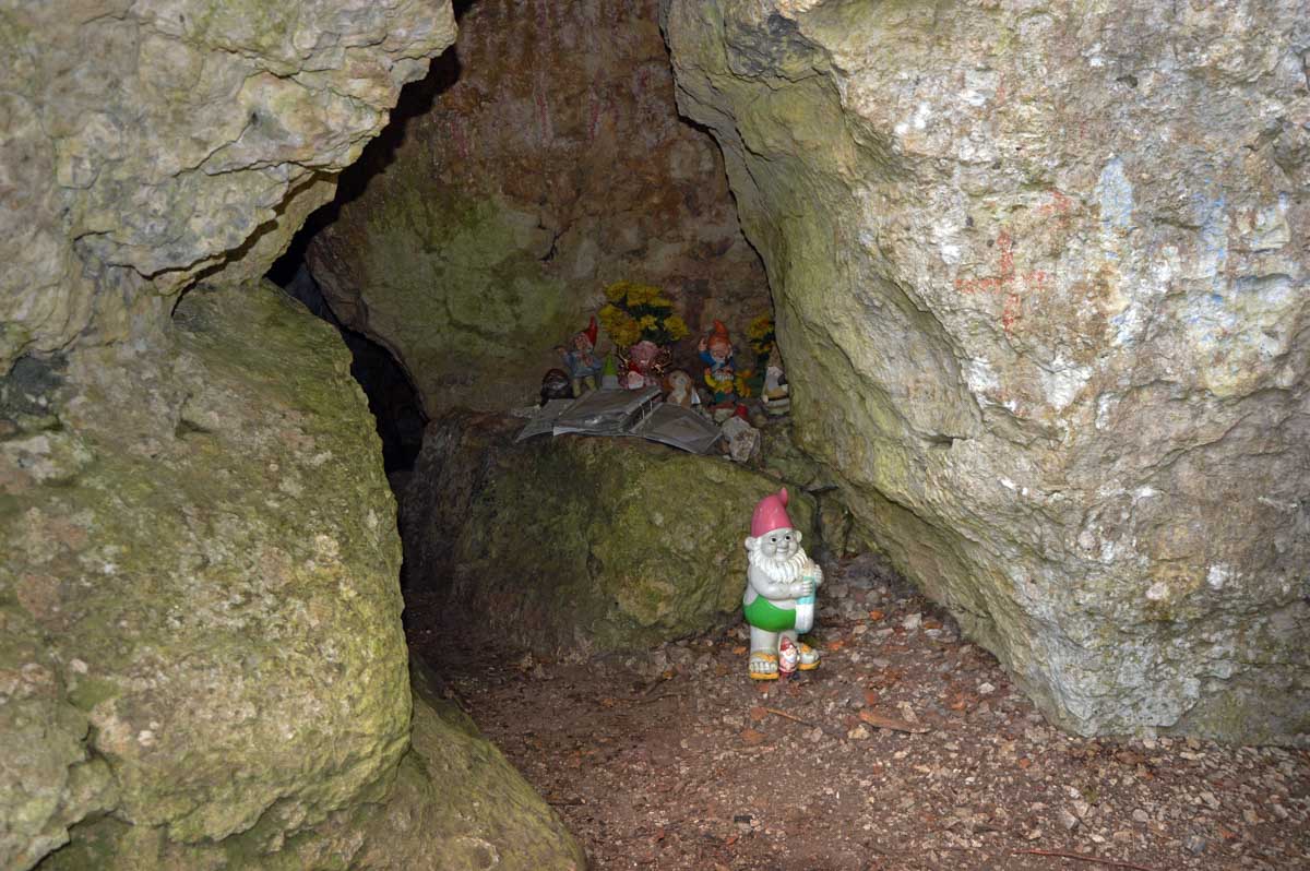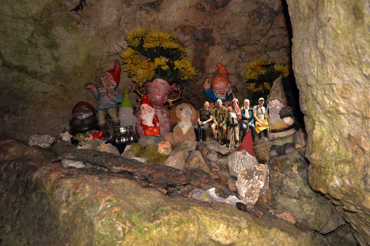 Tu me croyais zau bout de mes zémotions ? Que nenni ! Voici un canyon, une fêlure tectonique, le Grand Rift Alsacien, la dérive d’incontinents, une faille tempo-spationnelle, un gouffre où s’engouffrer, un vertige calcaire, un néant derthalien, et tout le bazar, mon canard, ben il ne porte même pas de nom. On parle de l’Erdwiebelenfelsen, mais va placer ça dans une soirée ! Et là-dedans se trouve la Grotte des Nains. C’est joli comme coin, en quelques pas, t’es dans un décor de cinéma, tu t’attends juste à ce qu’Indiana Jones (le vrai) arrive sur son canasson et que son fouet dérape pour te claquer le postér… enfin revenons à nos… non, y’avait même pas de moutons. Ambiance colo au centre de vacances Don Bosco à Ferrette. Le charme des années soixante-dix, un accueil de qualité, des gens super sympas, j’ai a-do-ré. Et demain, je te parle de leur chapelle, elle te donne direct envie de te (con)fesser. Indie ! Reviens avec ton fouet !
