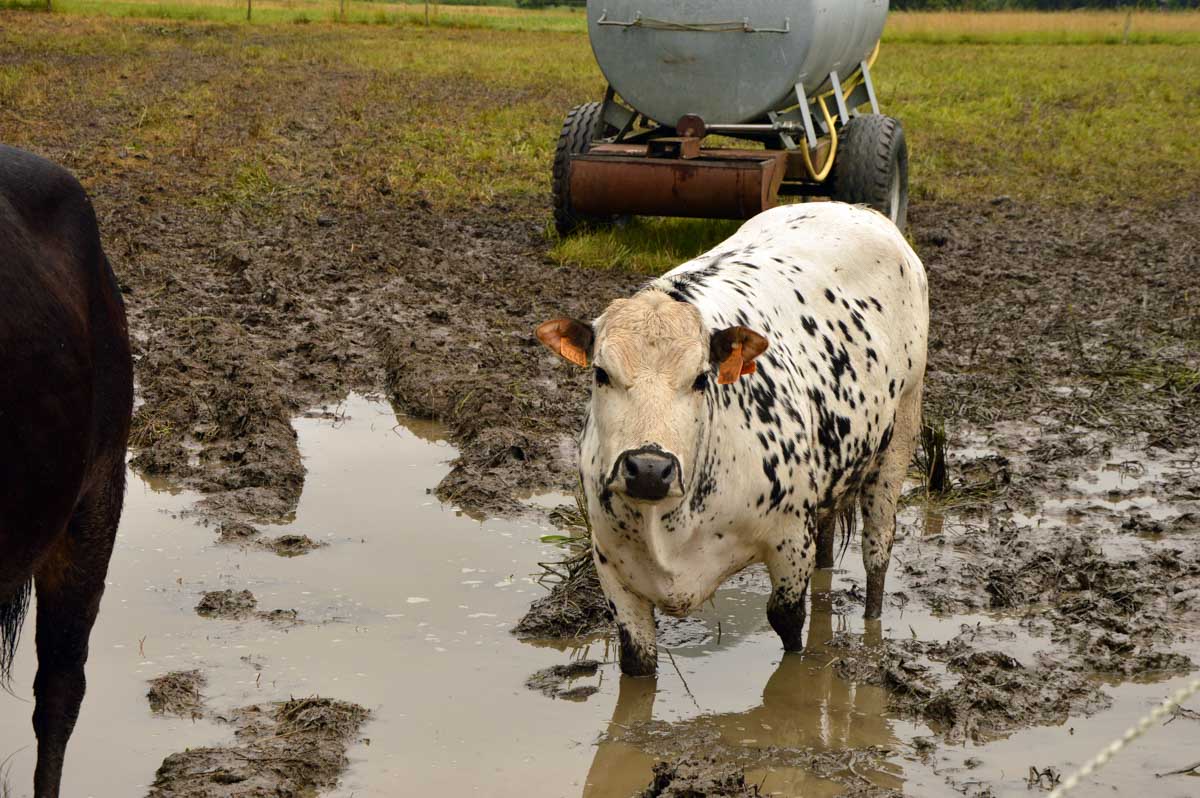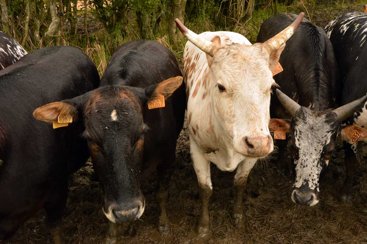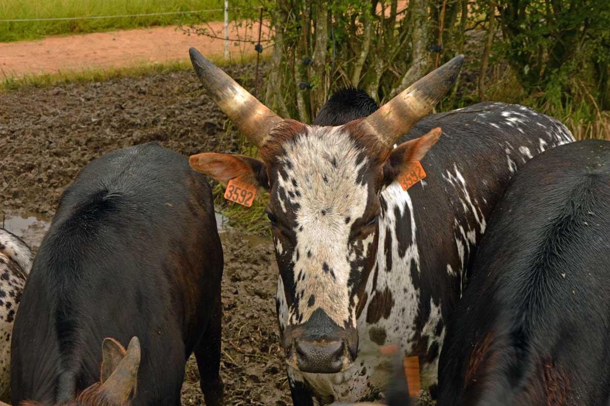 C’est là que c’est devenu vicieux et pas dans le sens où tu penses, Hortense (à supposer qu’il y ait une Hortense qui me lise). Chemin plat, large, à peine plus boueux qu’une mare aux canards à demi sèche, et tout à coup, comment dire : je vais te tenter une onomatopée (on se calme, c’est pas une insulte). Ça donne un truc du genre : splltch… wfllrgglp… et ça se termine toujours par « oh merde ». La flaque d’eau que tu estimais à 2 centimètres de profondeur se révèle un trou d’eau aussi profond que mes dernières pensées du soir, et là tu espères juste récupérer ta godasse même si elle s’est transformée en aquarium à tétards. Tu jures, tu pestes, tu maudis, tu détestes, mais le mal est fait. Et là, là, tu vois quoi ? Une apparition, un truc de malade. Sont là à te narguer tout en et à se demander pourquoi les bipèdes qui ont conquis la planète s’amusent à patauger dans le marécage et à les prendre en photo. Zébu mais z’avais pas encore bu pourtant ! Mais non, zé pas bu ! Et pourtant me voilà en pleine savane ! Eh oui, des zébus, ou du moins des bestioles qui leur ressemblaient ! Pu… euh non, bor… non plus… saleté de réchauffement climatique ! Atmosphère moite, je me croyais en Afrique ! On voit de ces trucs dans cette asso, tu viendrais, t’y croirais pas !