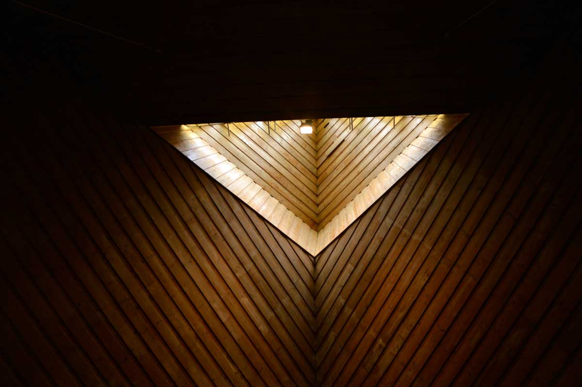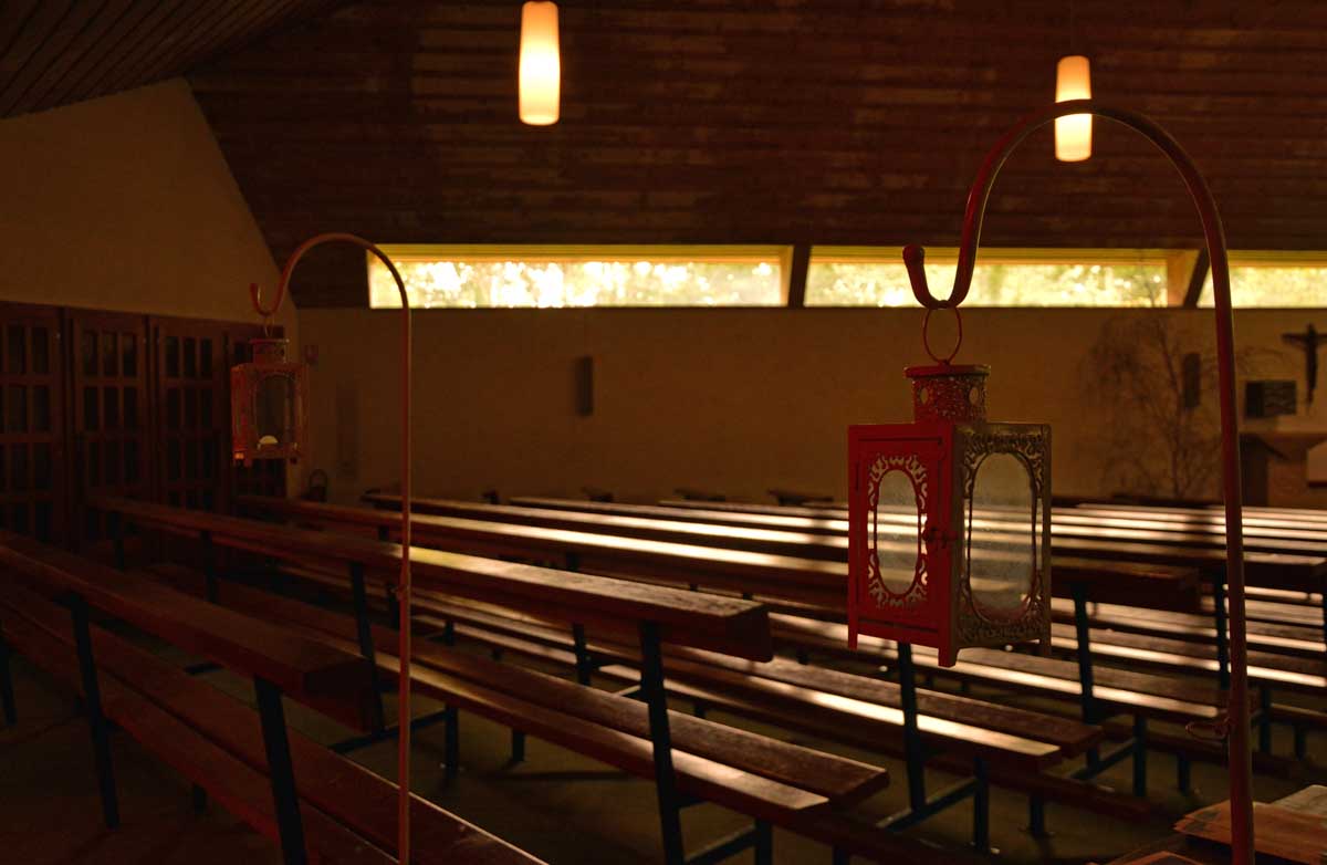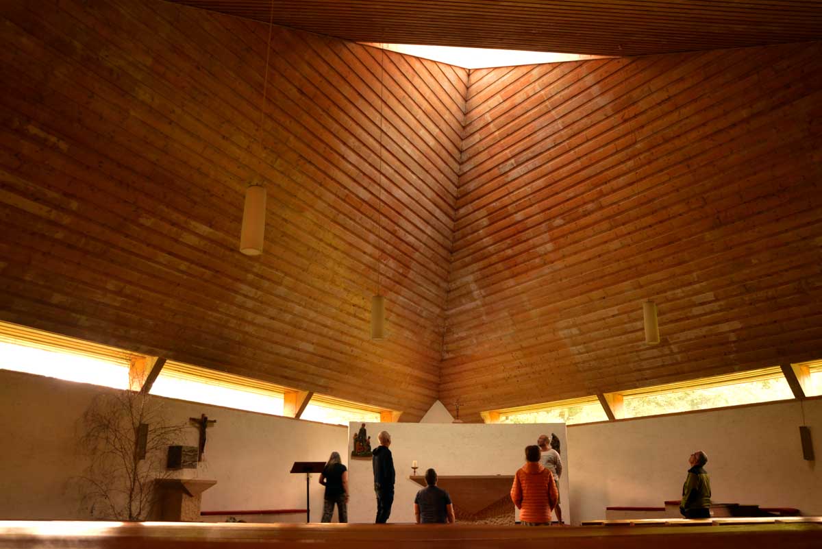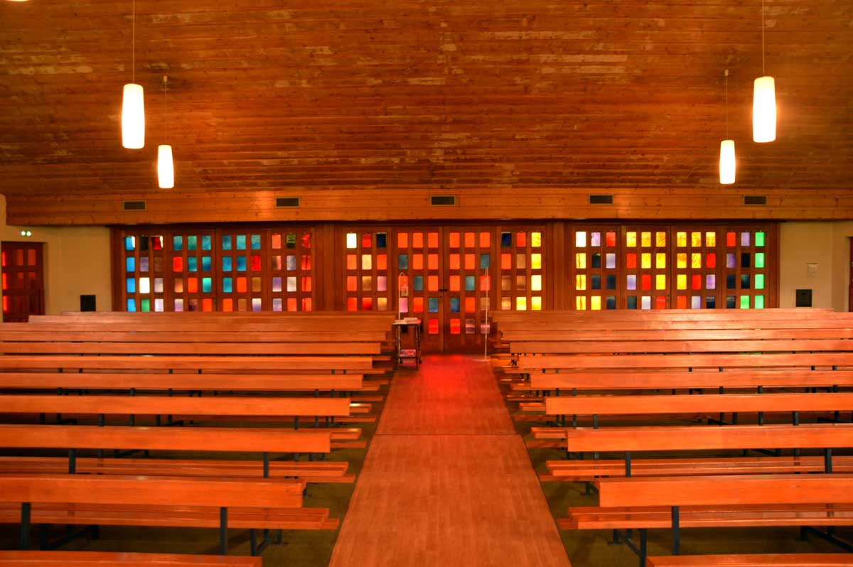 Ici pareil, on t’annonce une chapelle, tu vois une construction étrange quelque part entre un prototype de bibliothèque municipale et un truc de fin d’études d’un architecte sans avenir, pourtant tu vois une croix dessus et tu te dis que bon, ça doit être ça. Et à l’intérieur, quelle merveille ! Ah oui j’ai déjà mis « merveille ». Je reprends : à l’intérieur, quel ébahissement ! Ouh il est beau, celui-là. Je fus subjuguée, envoûtée, séduite, enchantée telle une parenthèse, et même conquite ! Oui OK, c’est pas correct, mais celui-là j’ai jamais su le conjuguer, aussi subjuguée que je sois. Drôles de carreaux de verre qui te font voir à la fois l’hiver et l’été dehors. Sacrée architecture sacrée de 1967 !
