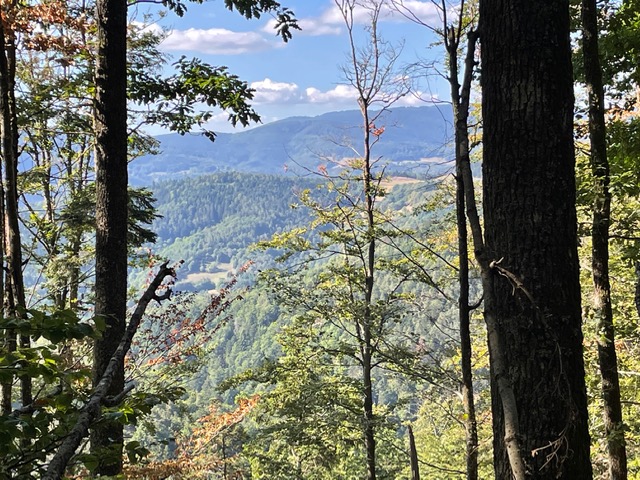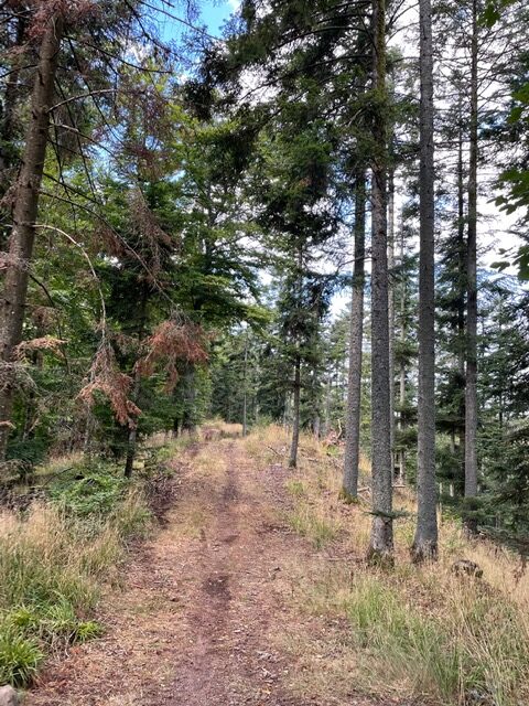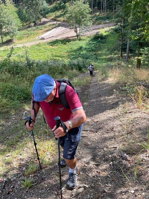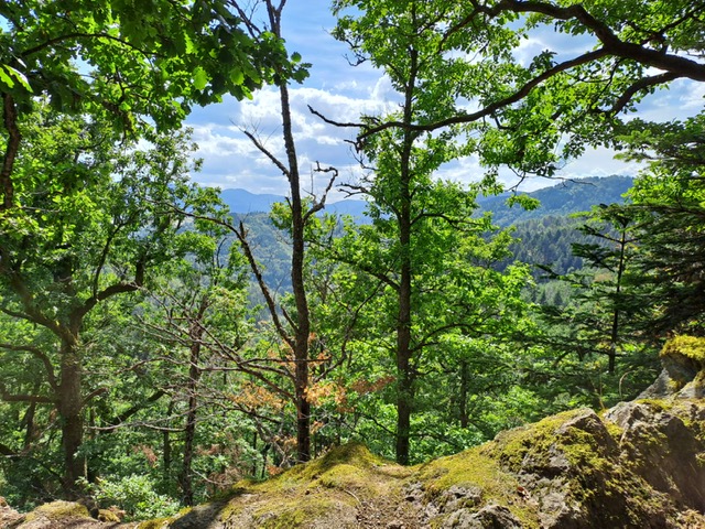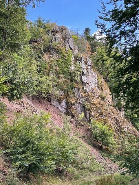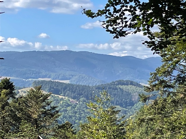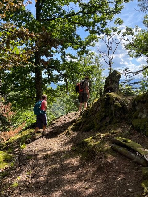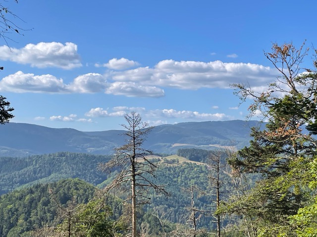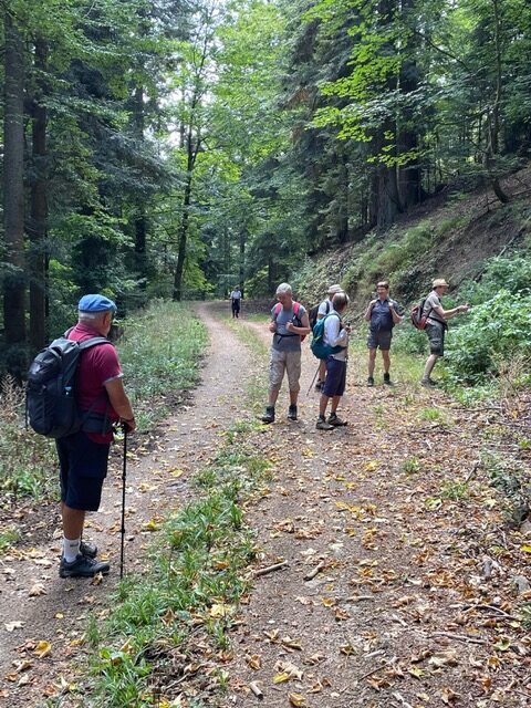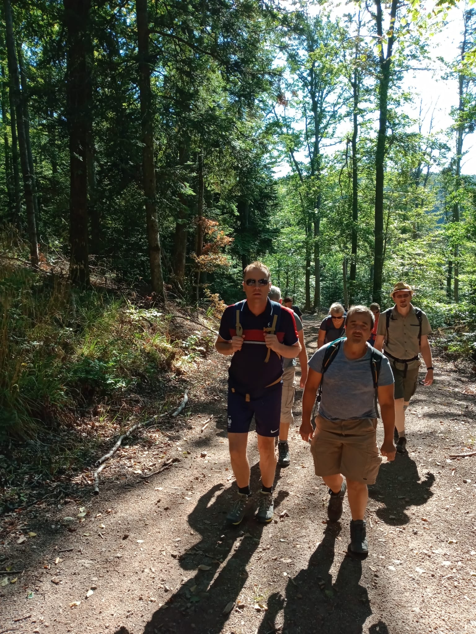 Ensuite, nous avions deux choix pour atteindre le Col de la Hingrie (non, non, nous ne sommes pas allés en Hongrie !). Evidemment, en marcheurs aguerris que nous sommes, nous nous sommes collégialement collés à la solution la plus dure : une (collet) montée à 25% sans colimaçon pendant deux-cents mètres pour atteindre les crêtes. Bon, les arbres ayant poussé et colonisé le coin, la vue depuis les crêtes n’était pas optimale mais sans colère ni disposer d’un col de cygne, nous avons pu admirer au loin le château du Haut-Koenigsbourg et l’antenne du Coucou, hélas sans voir ni colombes ni colverts.