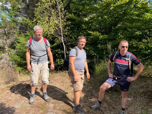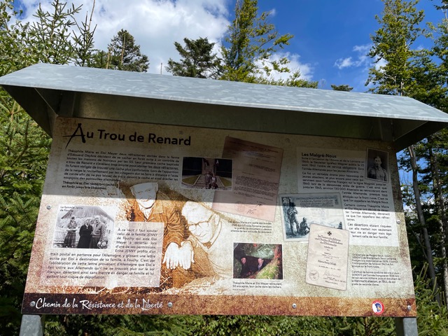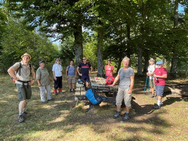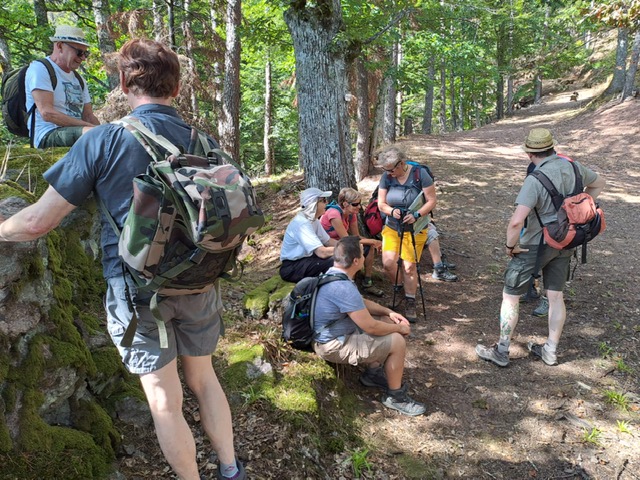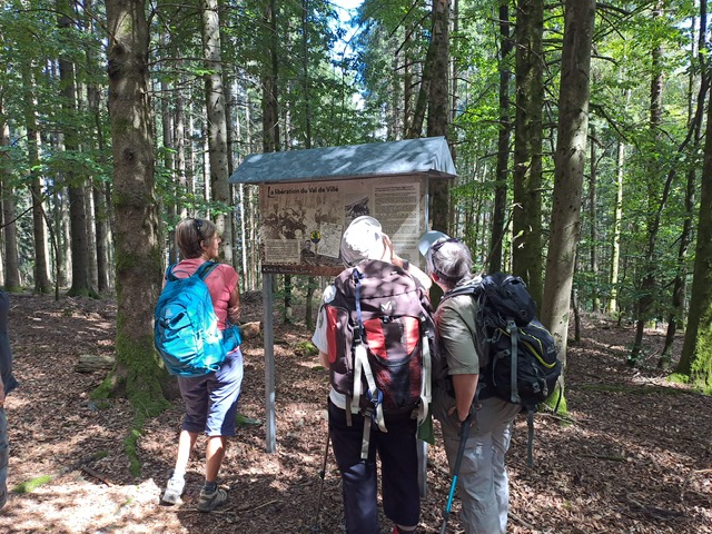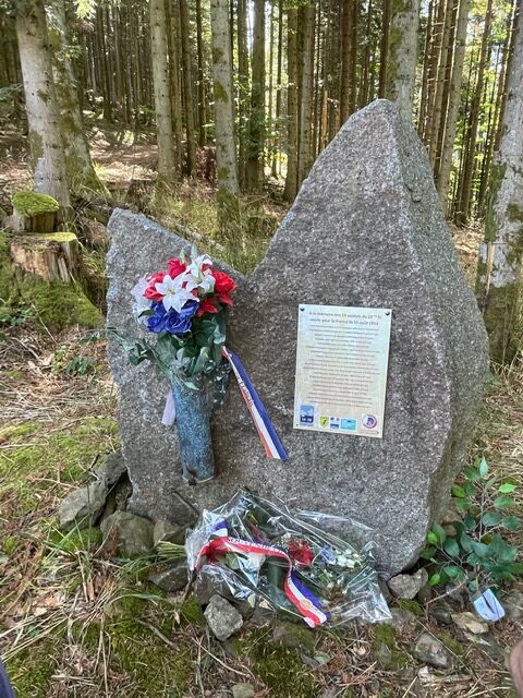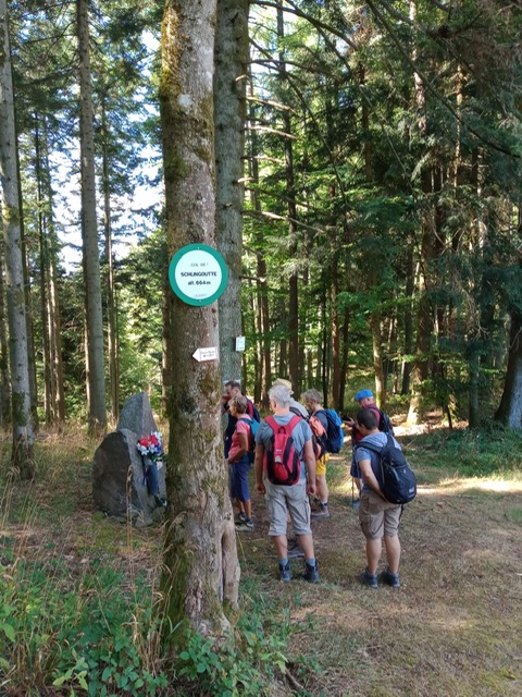 Après avoir démarré non à Colmar mais au Col de Fouchy, nous avons atteint le Col de Noirceux où nous avons pris une collation sous forme de pause crêpes sans alcool grâce à notre ami et collègue breton, et avons pu apprécier la belle vue dégagée sur les montagnes avoisinantes. Nous avons poursuivi notre ascension vers le Col de Schlingoutte où heureusement ça n’a pas schlingué. Nous nous y sommes recueillis devant une stèle à la mémoire de dix-neuf soldats morts pour la France en 1914.