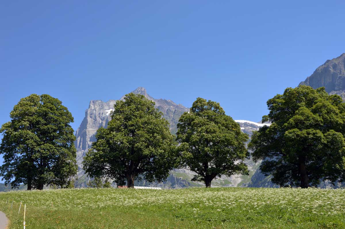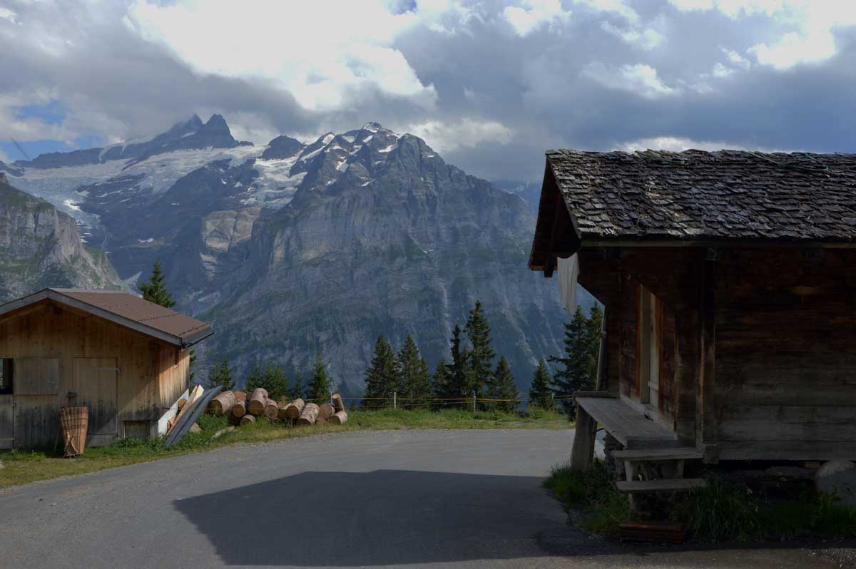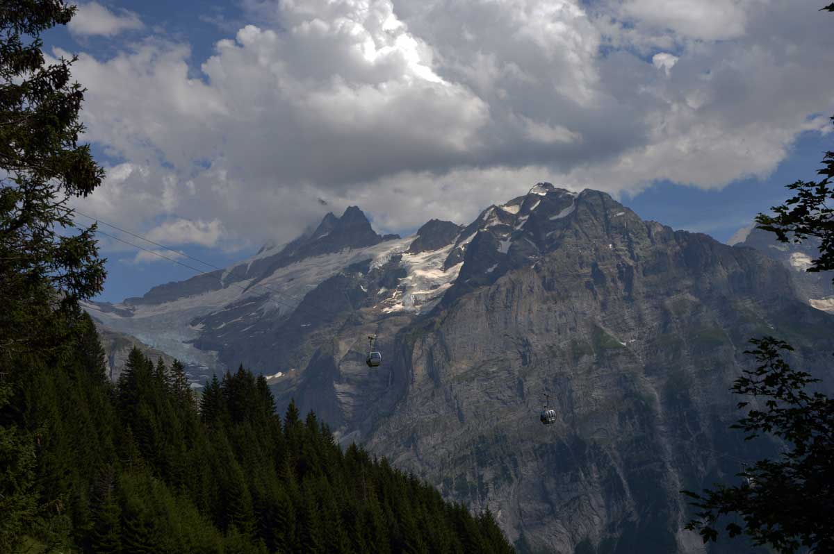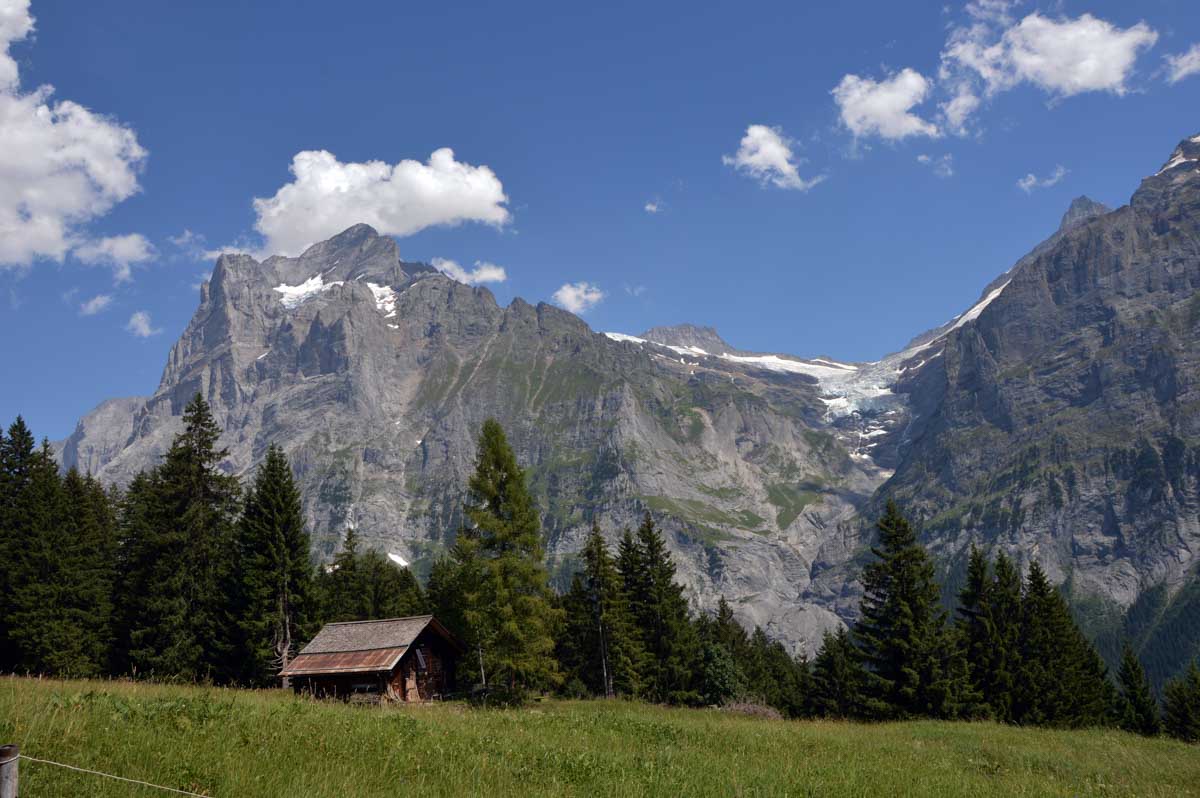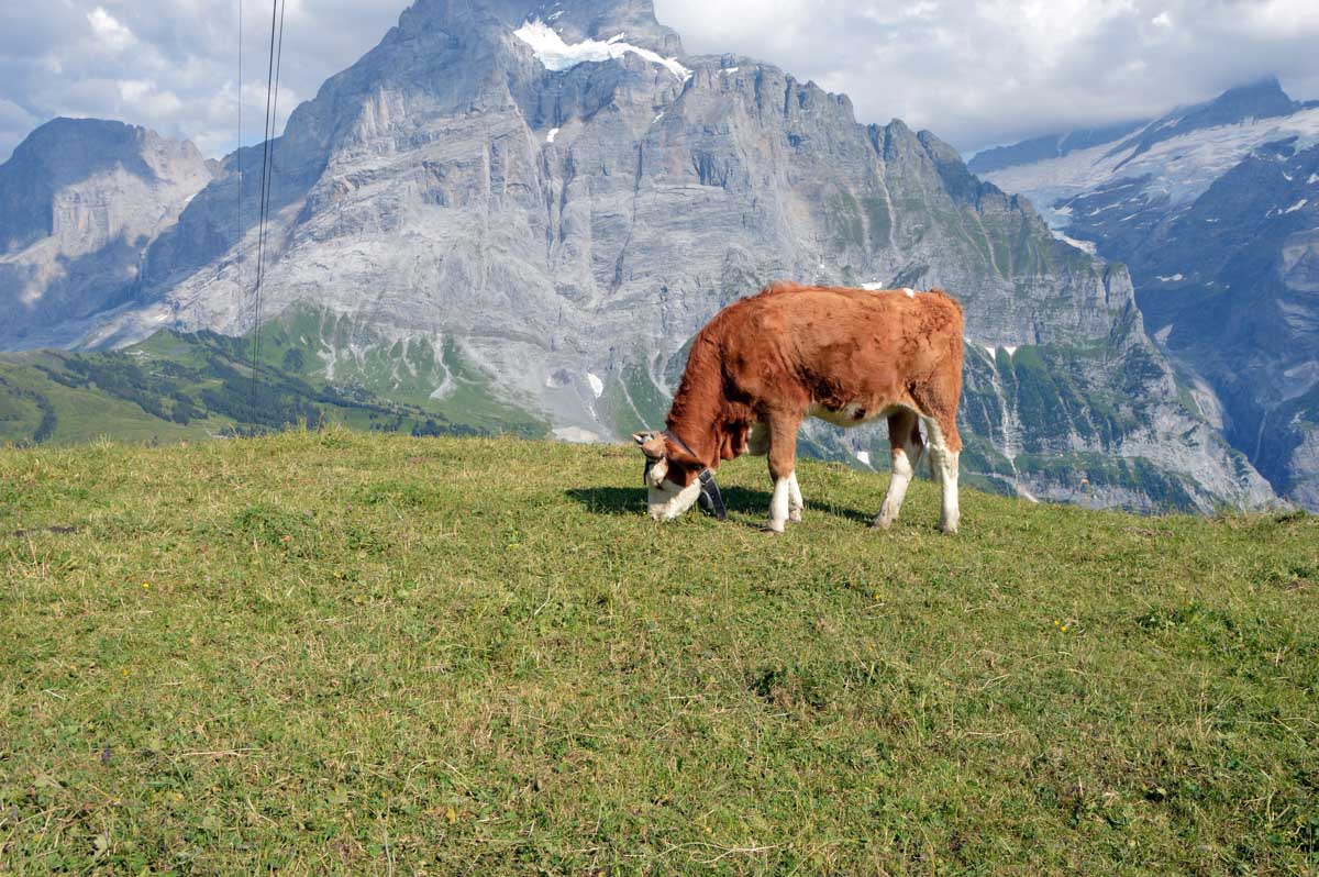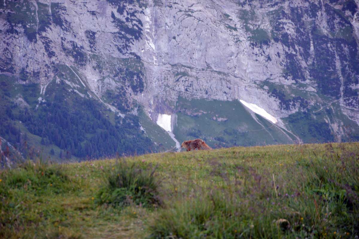 D’abord, il faut passer la touristique Grindelwald dans la chaleur et sous le soleil, puis là vous commencez à grimper en suivant à peu près la voie du téléphérique. Pas de notre faute, si vous êtes un peu zinzins… Meuh si, vous l’êtes, vous les humains ! Vous restez soigneusement sous le soleil en contournant la forêt par tous les moyens pour échapper à l’ombre ! Ben oui, c’est le chemin qui veut ça, bon on la prend comme explication.