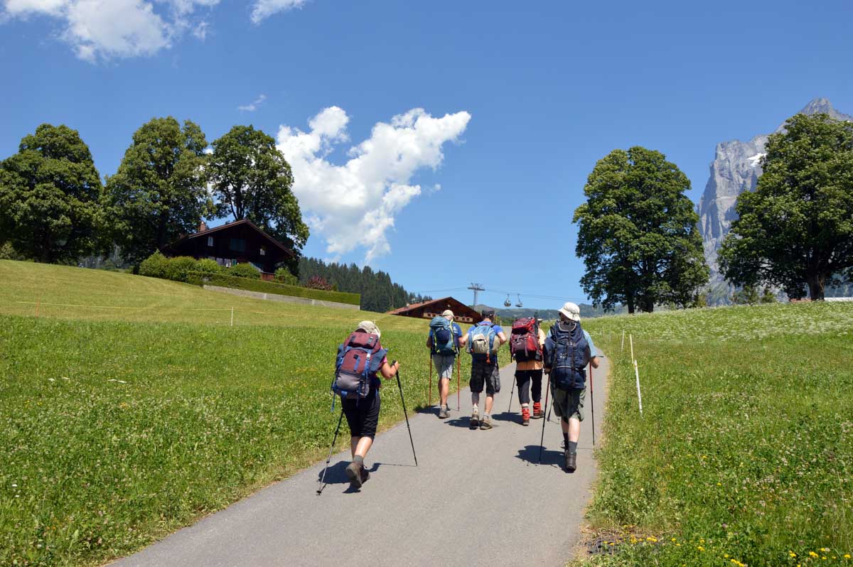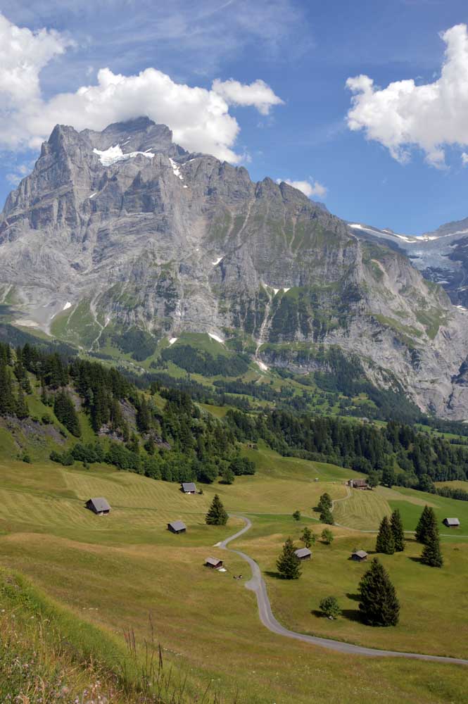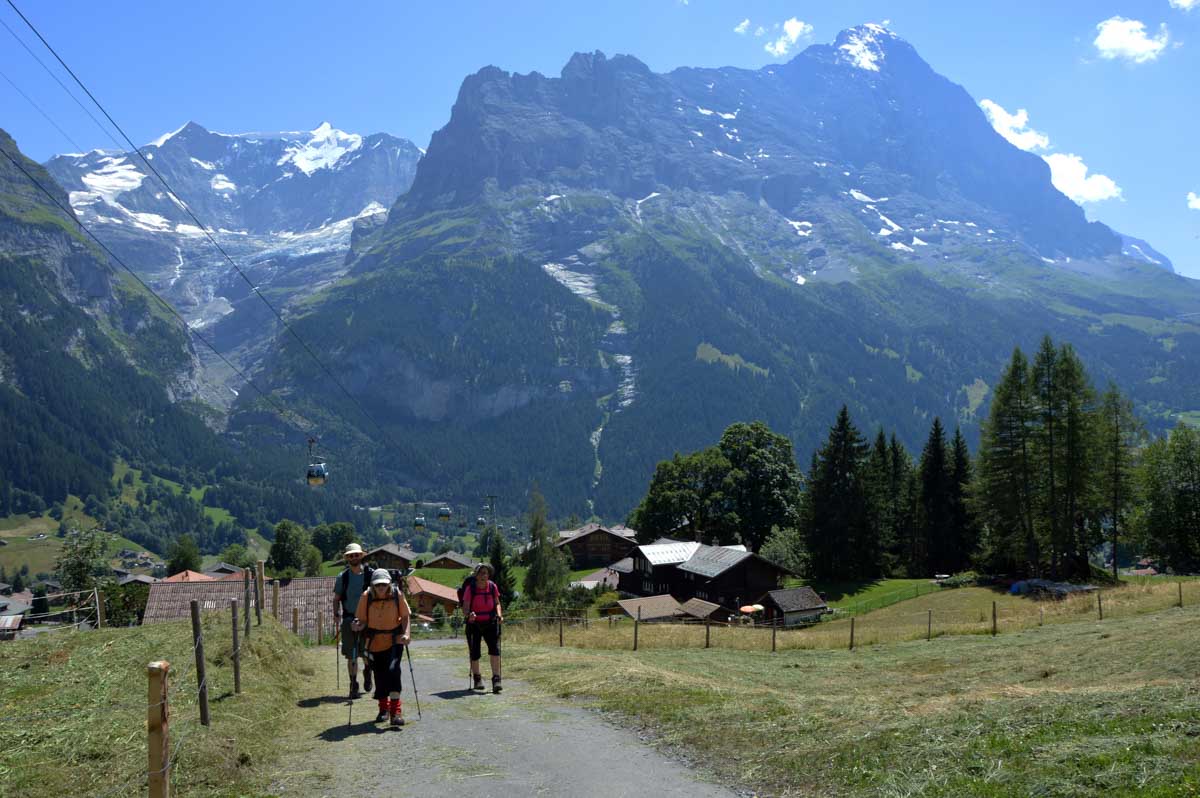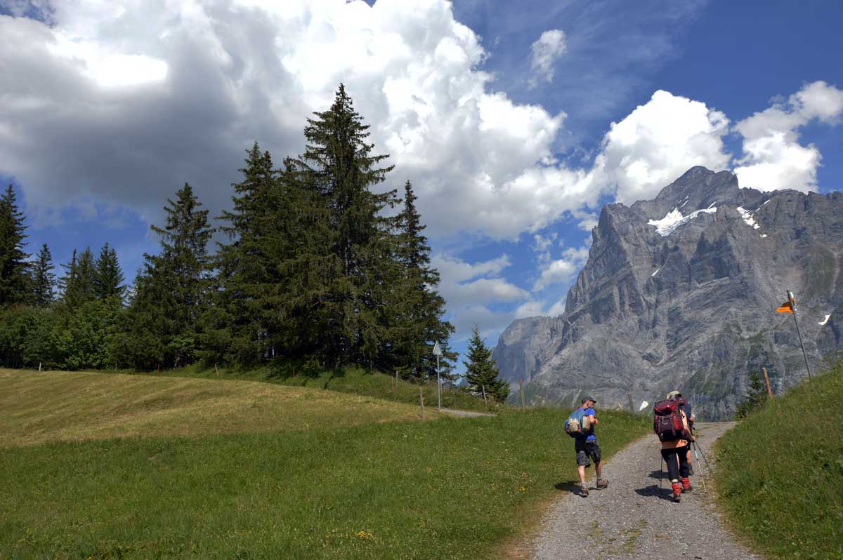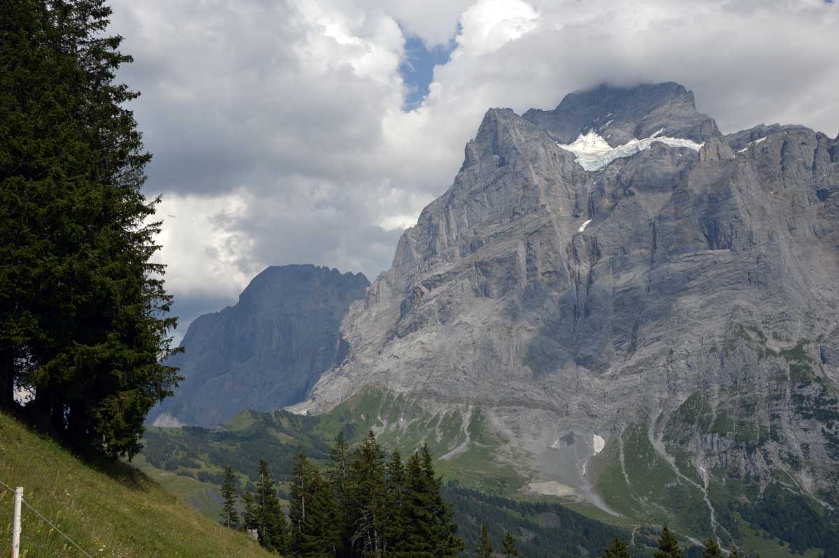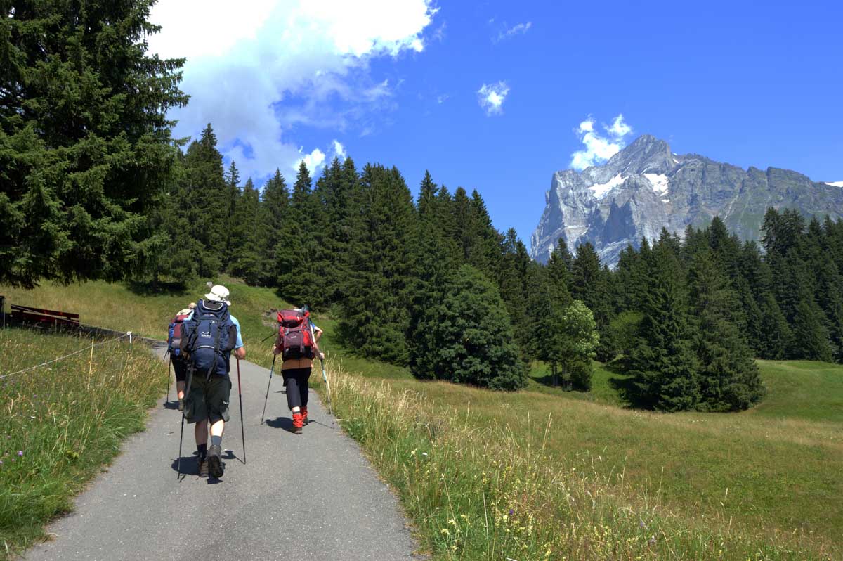 D’abord, il faut passer la touristique Grindelwald dans la chaleur et sous le soleil, puis là vous commencez à grimper en suivant à peu près la voie du téléphérique. Pas de notre faute, si vous êtes un peu zinzins… Meuh si, vous l’êtes, vous les humains ! Vous restez soigneusement sous le soleil en contournant la forêt par tous les moyens pour échapper à l’ombre ! Ben oui, c’est le chemin qui veut ça, bon on la prend comme explication.