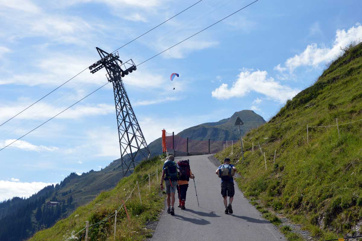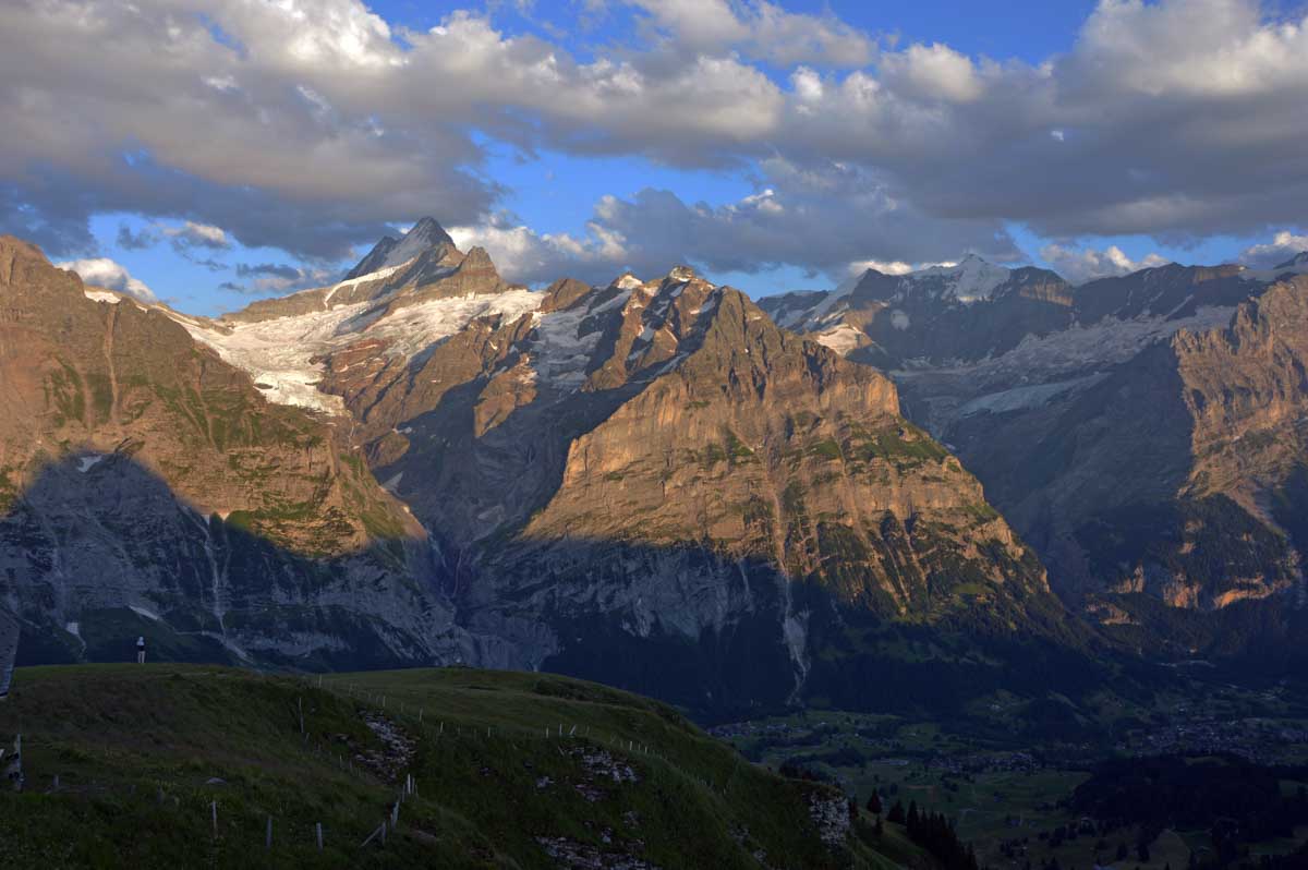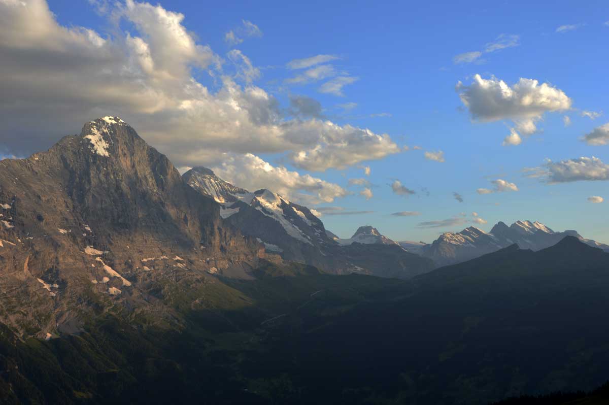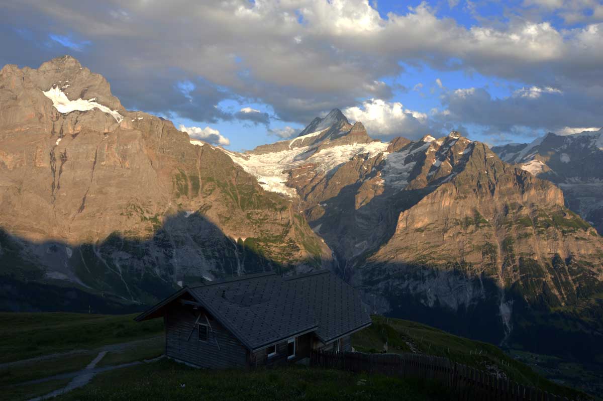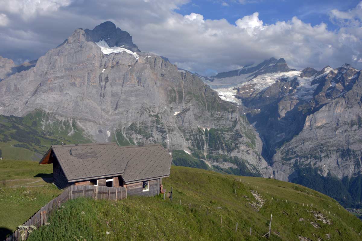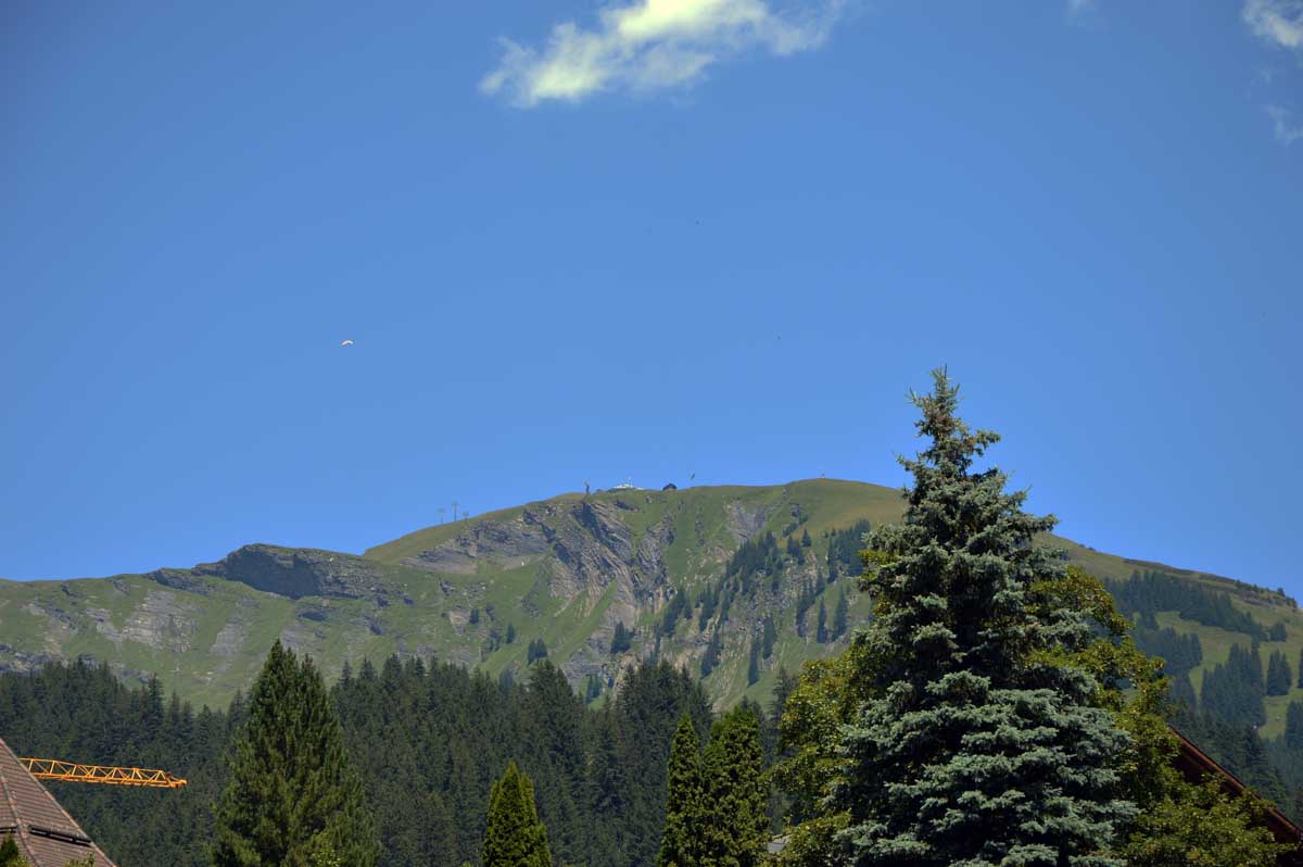 D’abord, il faut passer la touristique Grindelwald dans la chaleur et sous le soleil, puis là vous commencez à grimper en suivant à peu près la voie du téléphérique. Pas de notre faute, si vous êtes un peu zinzins… Meuh si, vous l’êtes, vous les humains ! Vous restez soigneusement sous le soleil en contournant la forêt par tous les moyens pour échapper à l’ombre ! Ben oui, c’est le chemin qui veut ça, bon on la prend comme explication.