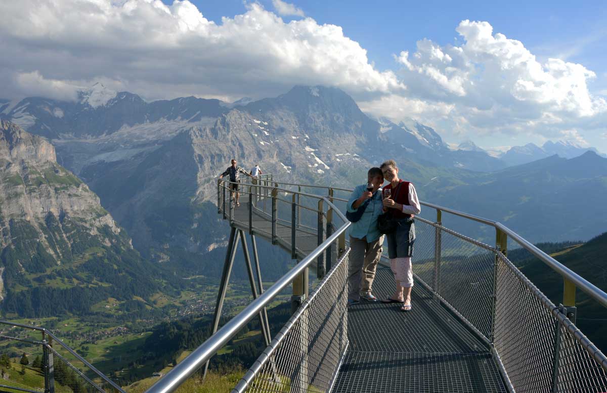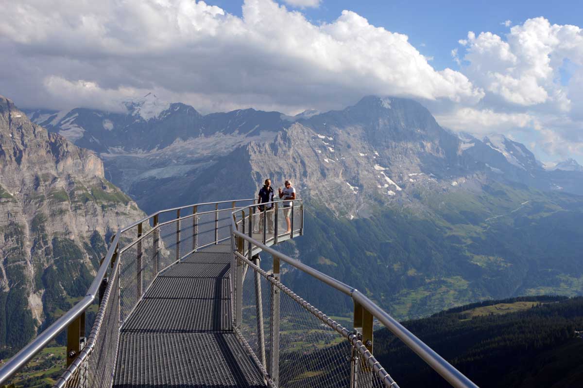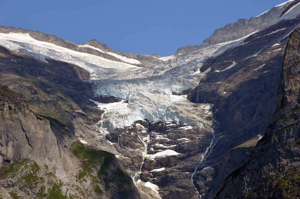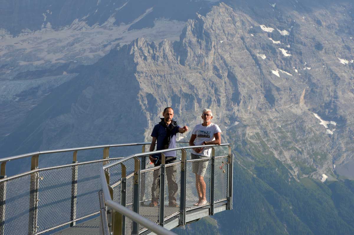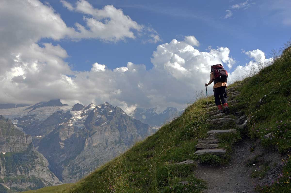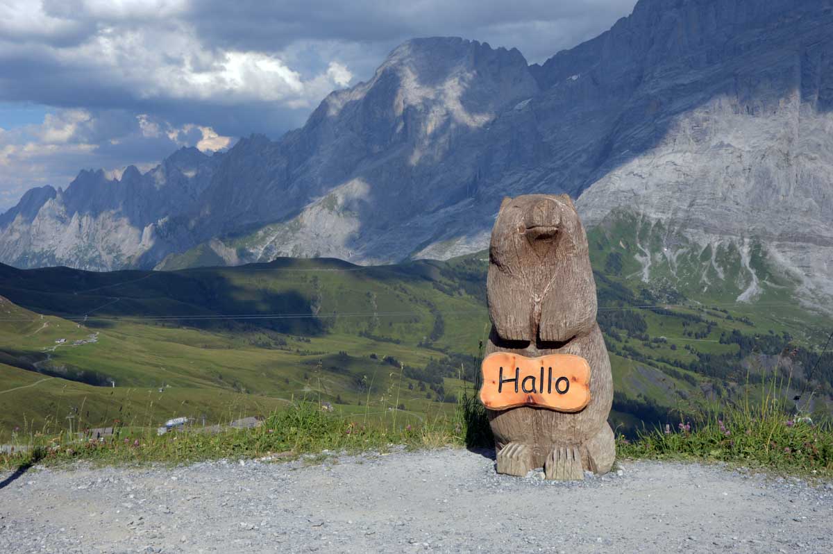 D’abord, il faut passer la touristique Grindelwald dans la chaleur et sous le soleil, puis là vous commencez à grimper en suivant à peu près la voie du téléphérique. Pas de notre faute, si vous êtes un peu zinzins… Meuh si, vous l’êtes, vous les humains ! Vous restez soigneusement sous le soleil en contournant la forêt par tous les moyens pour échapper à l’ombre ! Ben oui, c’est le chemin qui veut ça, bon on la prend comme explication.