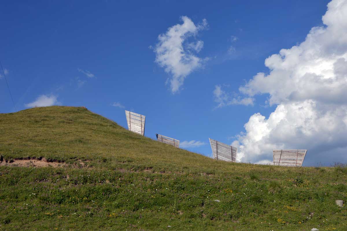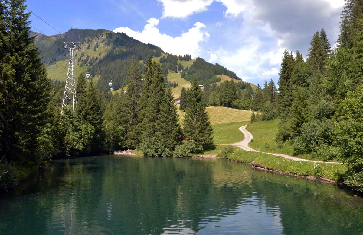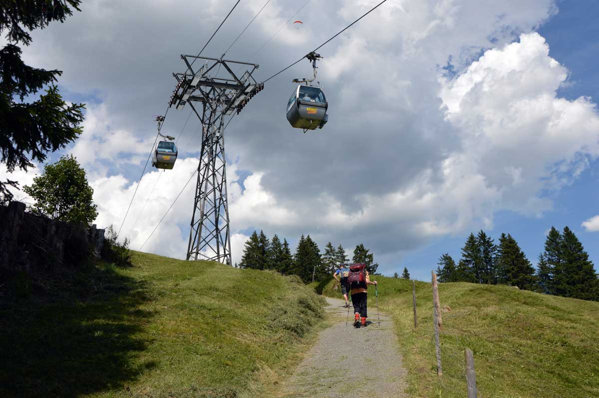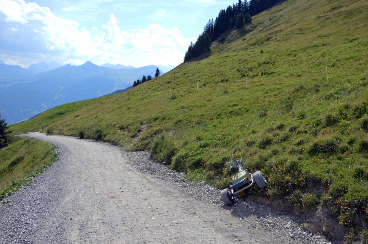 Donc de 1056 mètres d’altitude, vous atteignez d’abord Dirrlichen, là où les œufs aériens du téléphérique décrivent un coude, à 1245 m. Ensuite à 1561 m, à Bort, vous avez l’occasion de sauter dans une cabine… Penses-tu ! Vous voilà à vous farcir encore de la montée et à croiser maintenant des trottinettes tout-terrains puis plus haut, des karts lancés dans la descente et qui vous envoient de la poussière. La montagne est devenue un gigantesque parc d’attrations.