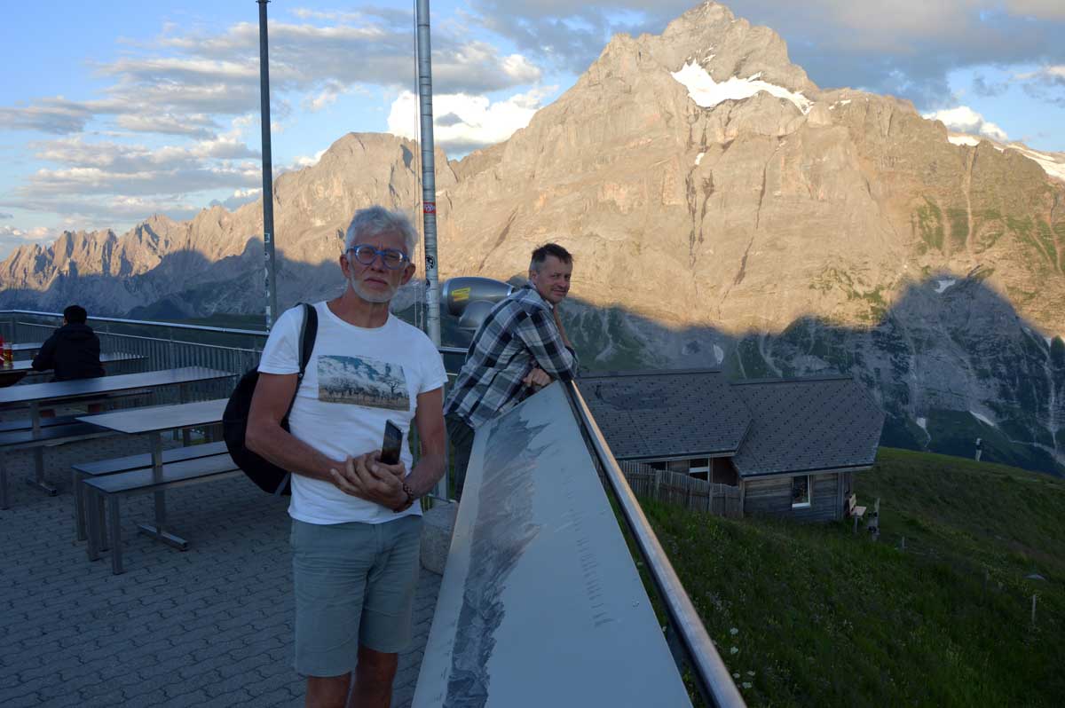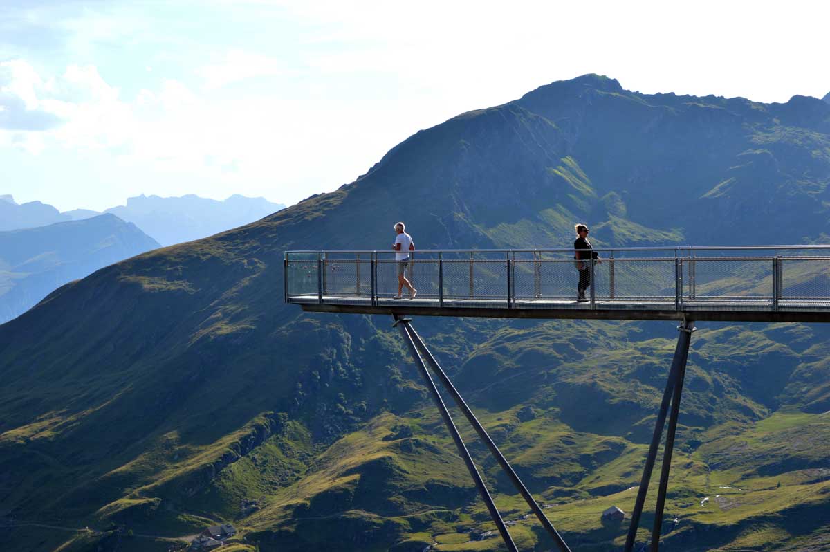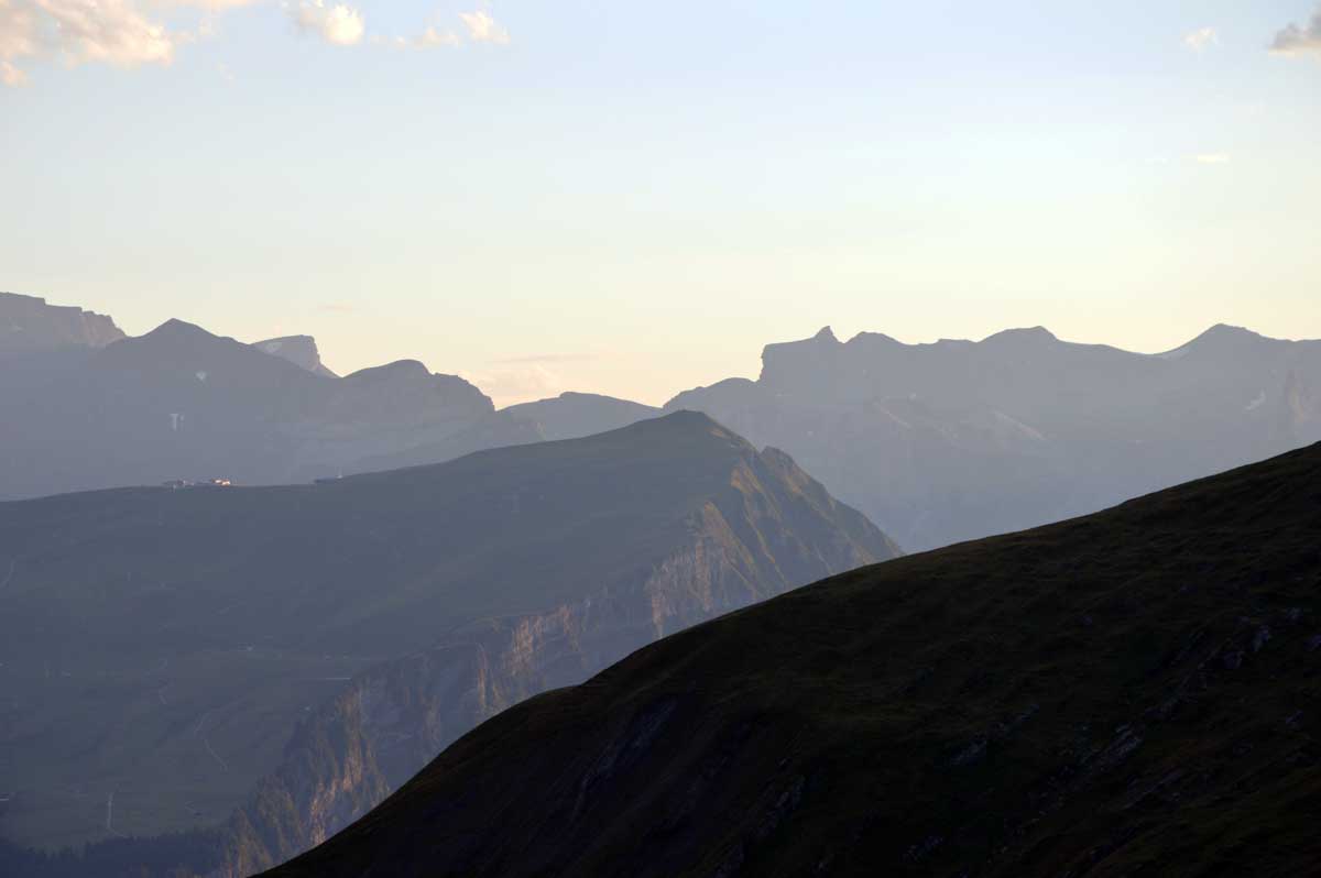 Là, c’est plus zinzin, non c’est carrément maso, même si la chaleur devient moins insupportable : Schreckfeld, 1979 m, et vous refusez toujours de voyager par les airs ? Bon, là on veut bien comprendre car c’est à partir d’ici que vous nous rencontrez enfin, nous vos meuh préférées. Allez un dernier effort, et vous voici enfin à First, qui se trouve selon les versions à 2164 ou 2186 mètres d’altitude. On admet que vous avez mérité le panorama qui se transforme à mesure que le soleil se couche. Oui on peut le dire, c’est magnifique, grandiose, merveilleux, d’ailleurs c’est pour ça que First, c’est fameuhhh !