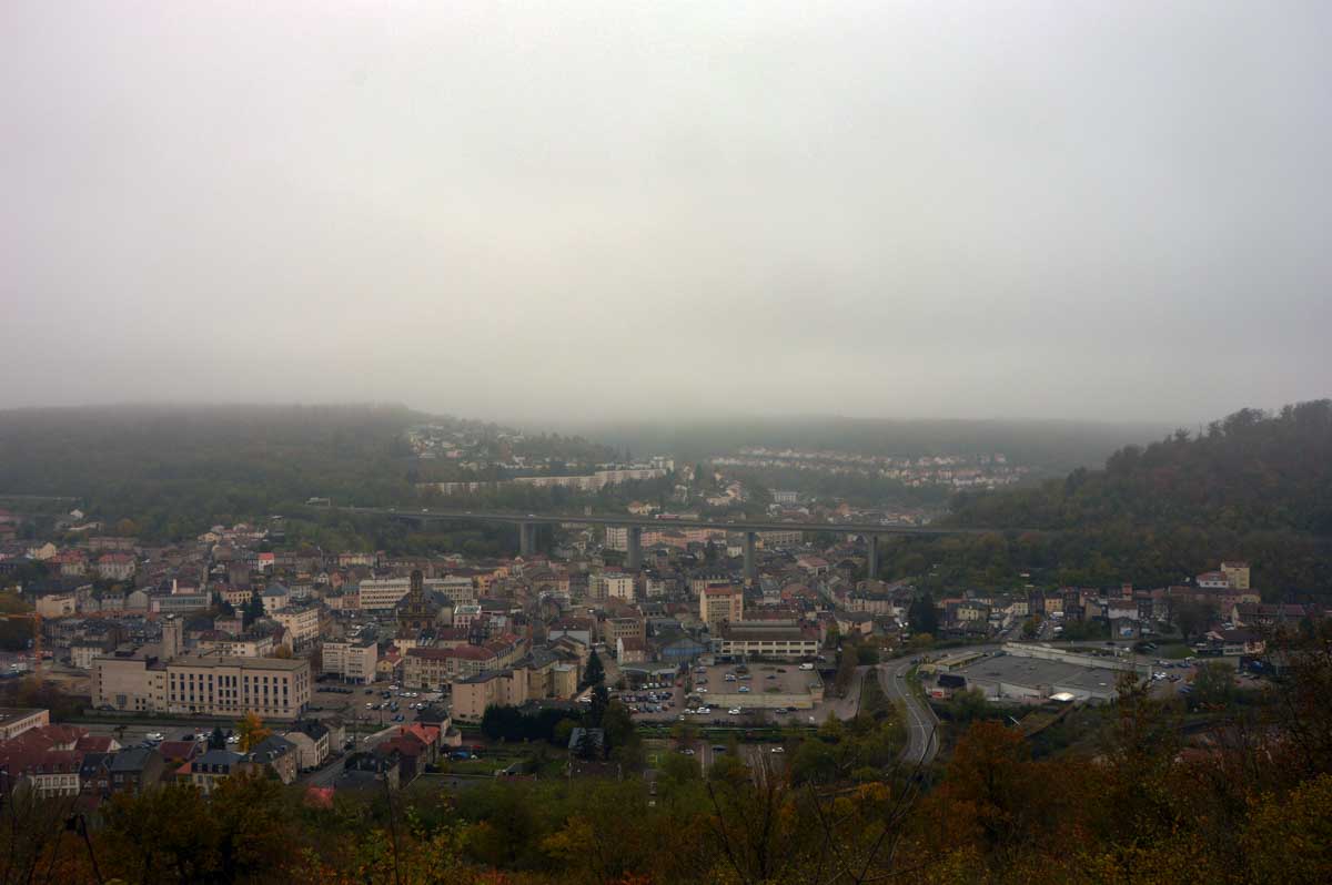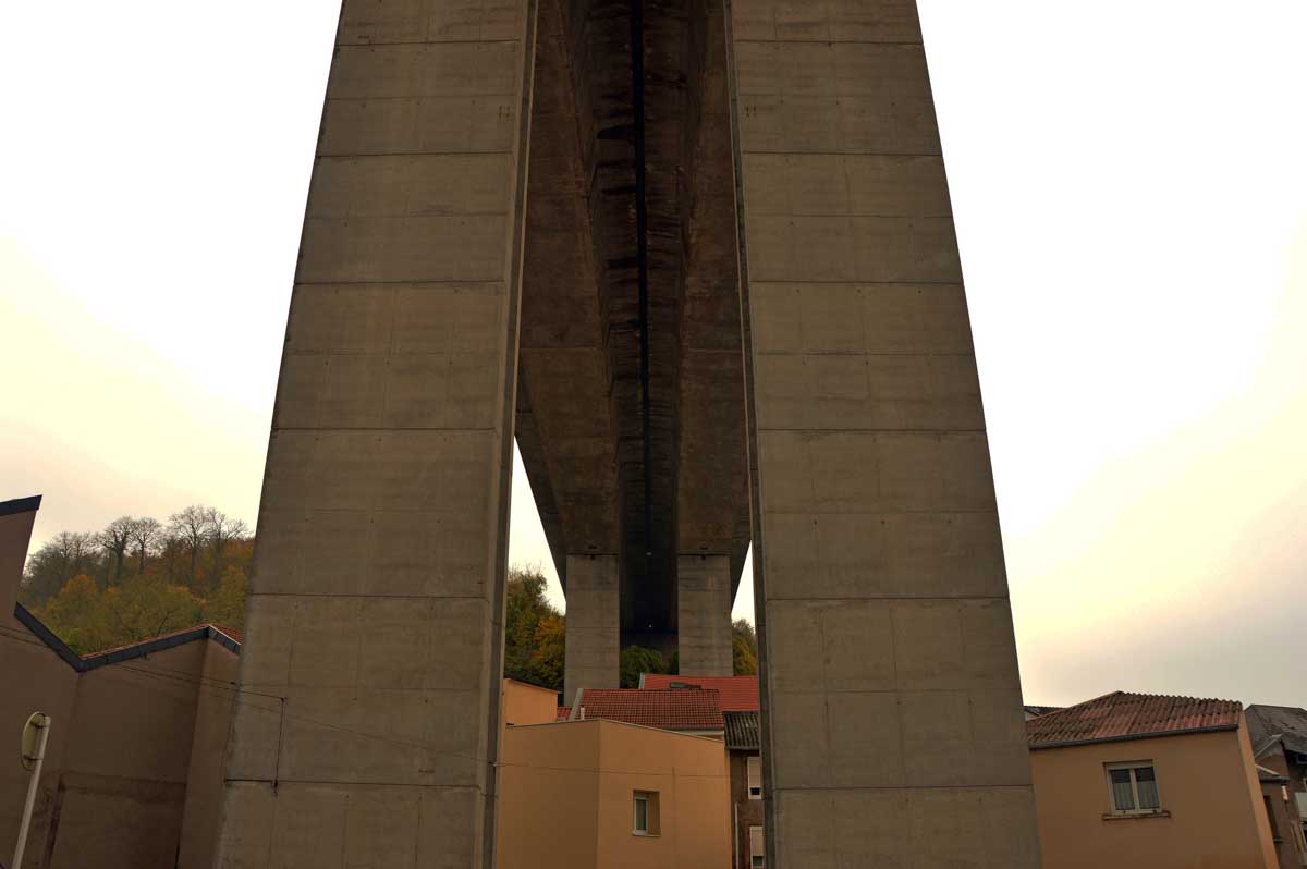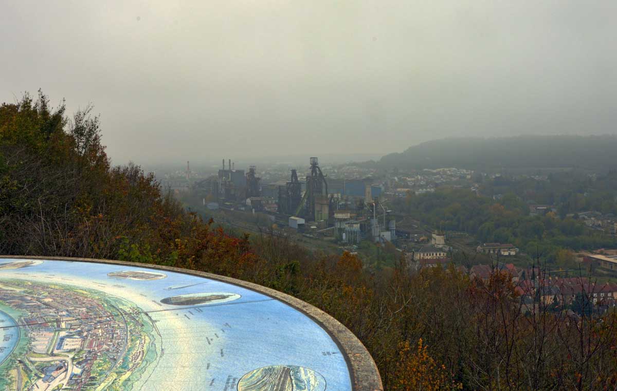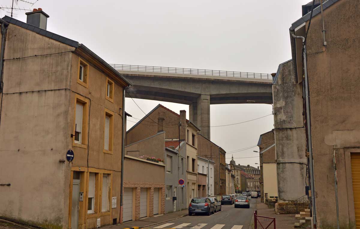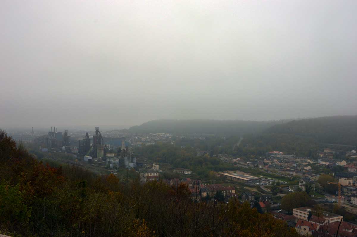 Hayange c’est sympa, bien que l’A30 passe au-dessus sur un pont qu’est même pas artistique. On aurait pu demander à Eiffel de le construire avec le fer qu’on a extrait en-dessous, non ? Pas bonne, mon idée ? Hm ? Eiffel est mort en 1923 et l’autoroute de la Fensch n’a été construite que dans les années 1990 pour relier Thionville à Longwy ? Ouais à 70 ans près, ça le faisait, non ? Puis Hayange ça dépayse, quand tu vois la mairie tu te crois revenu en Union Soviétique. Et surtout, le paysage industriel des hauts-fourneaux, j’en avais des frissons.