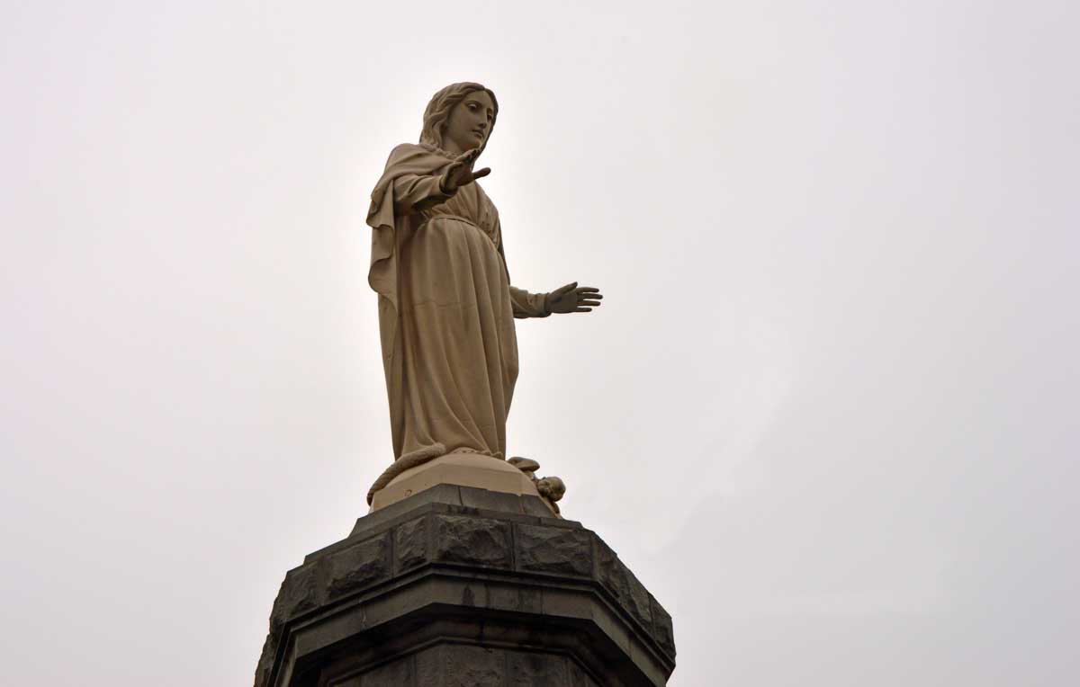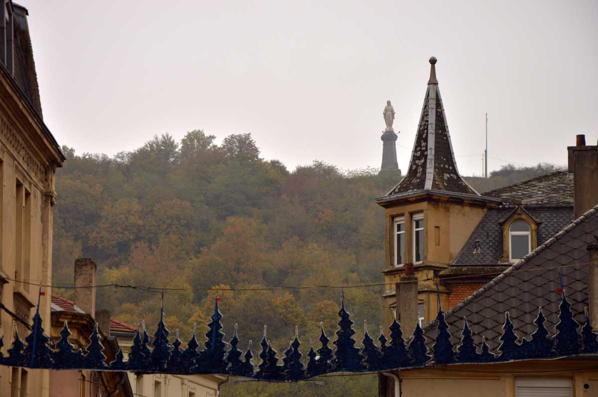 Donc c’est vers la fin du 19ème siècle qu’on a installé des hauts fourneaux (qu’on n’aurait pas eu dans le Bas-Rhin… et toc), pour affiner le minerai et produire du fer. Là on rejoint l’Histoire de la Moselle, on a les mineurs, les aciéries, les accidents,… il a bien fallu une Vierge pour protéger tous ces gens. Inaugurée en 1904, elle fait sept mètres de haut sur un socle qui en mesure douze. En fonte, elle pèse huit tonnes, est montée sur des fondations en rails de huit mètres, bref c’est pas une Vierge de p… enfin de… de… En tous les cas, elle a œuvré pendant quatre-vingt-dix ans jusqu’à ce qu’on trouve dans le monde un minerai plus riche en fer. Et là, tu connais la suite : fermetures, licenciements, faillites, pauvreté, la fin d’une époque, la fin d’une histoire.