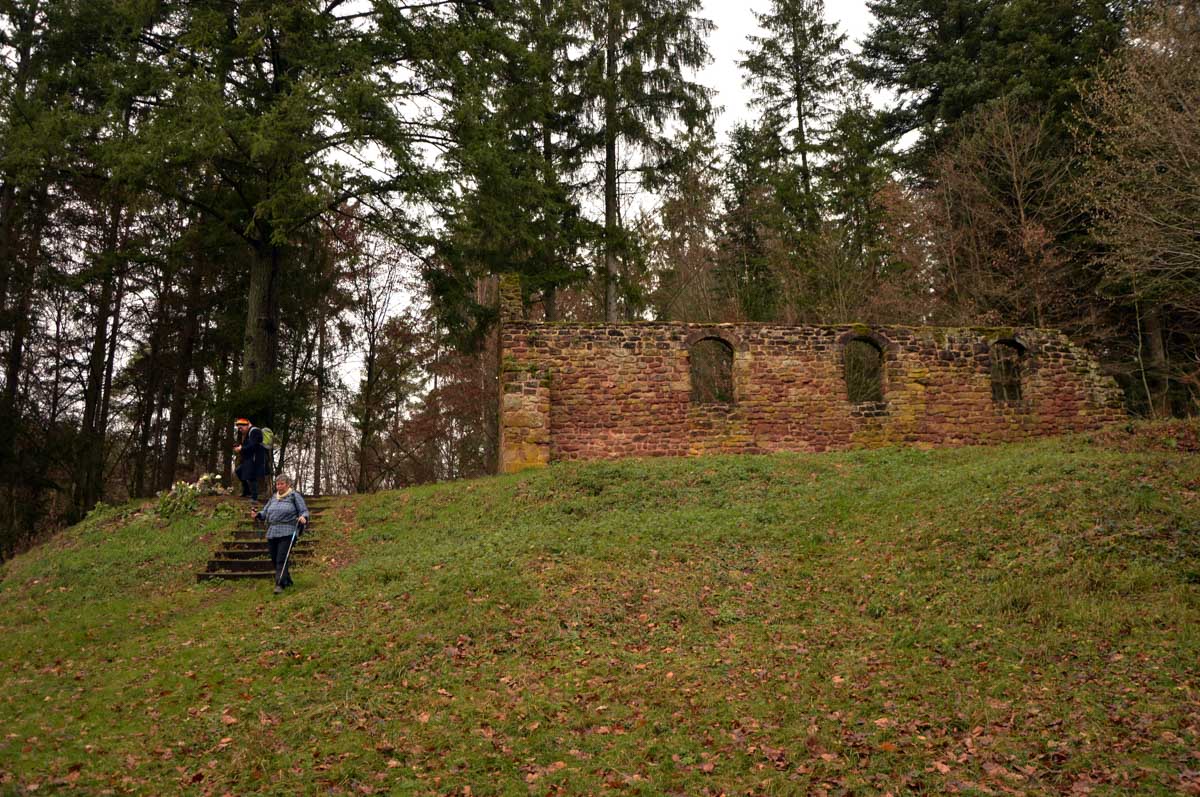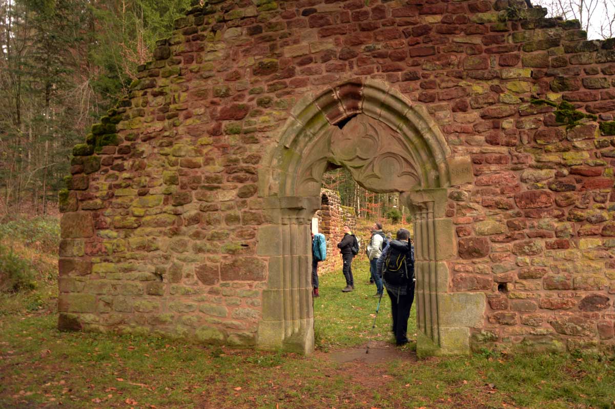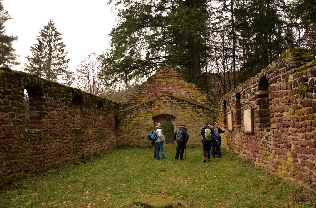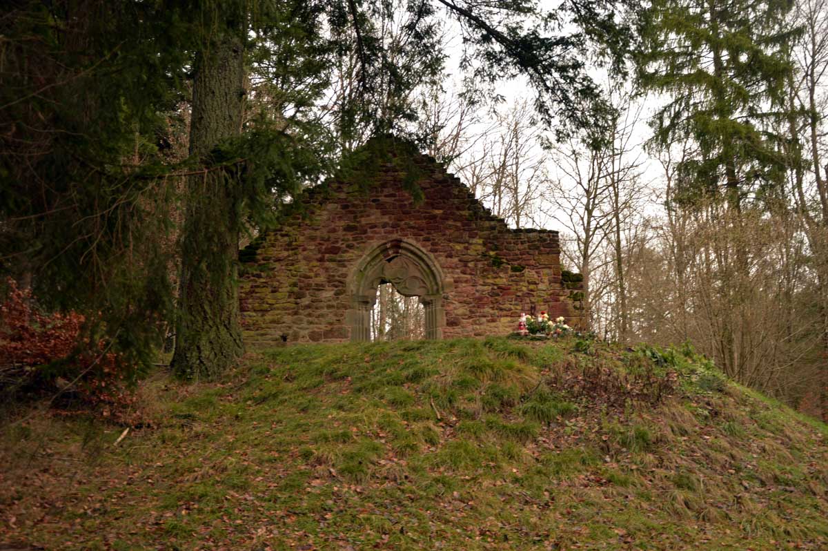Abri déjeuner au sec (pas compris l’intérêt vu qu’il pleuvait pas), Fontaine de Nassau (ne rêvez pas des Bahamas, c’est juste une source par chez nous), le tout entre Moselle et Bas-Rhin, et hop, direction la Heidenkirche. Alors là, le pompon, on m’annonce une église construite et agrandie entre le 14ème et le 15ème siècle. Chouette, qu’elle se dit, votre rédactrice, on va voir des vitraux, des statues et tout le bigntz, on prendra des photos, on dira « ouah, pas mal », enfin comme dans une église, quoi. Macache ! Tu sais ce qu’ils m’ont montré ? Rien que de l’évoquer je me sens cocotte-minute (et je cocottais la sueur mais c’est une autre histoire…)… Une ruine ! Oui tu as bien lu : une ruine !
