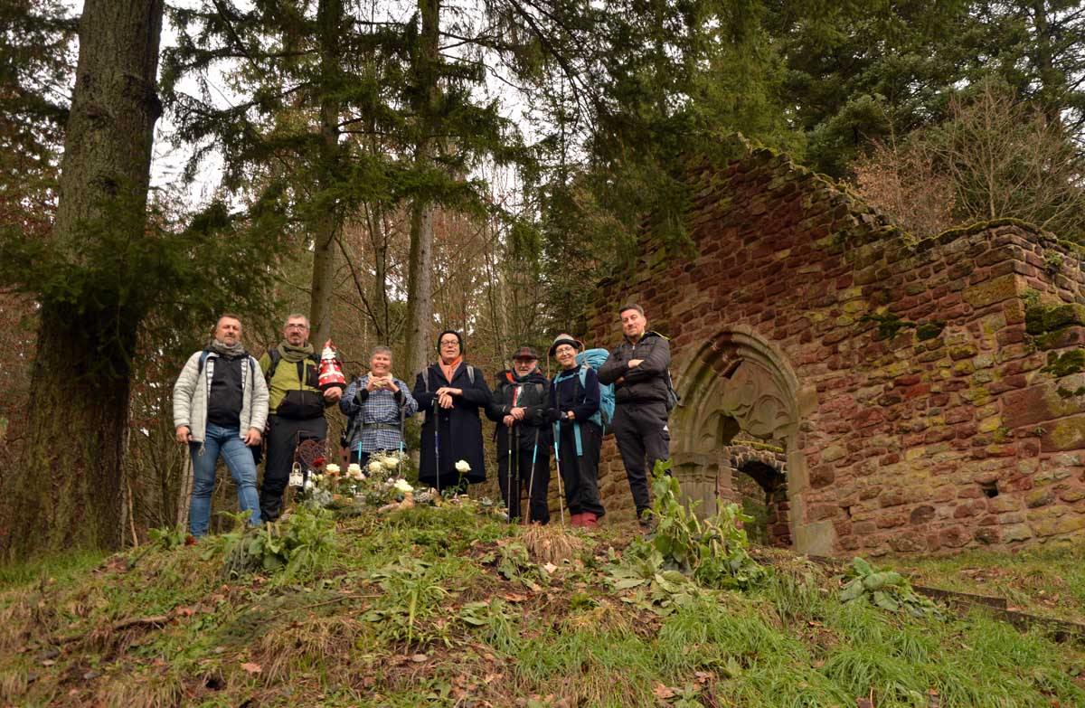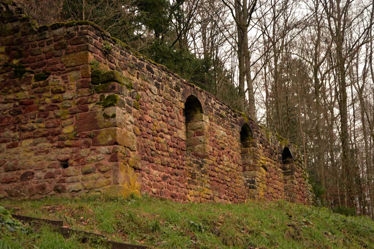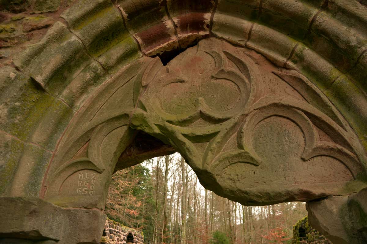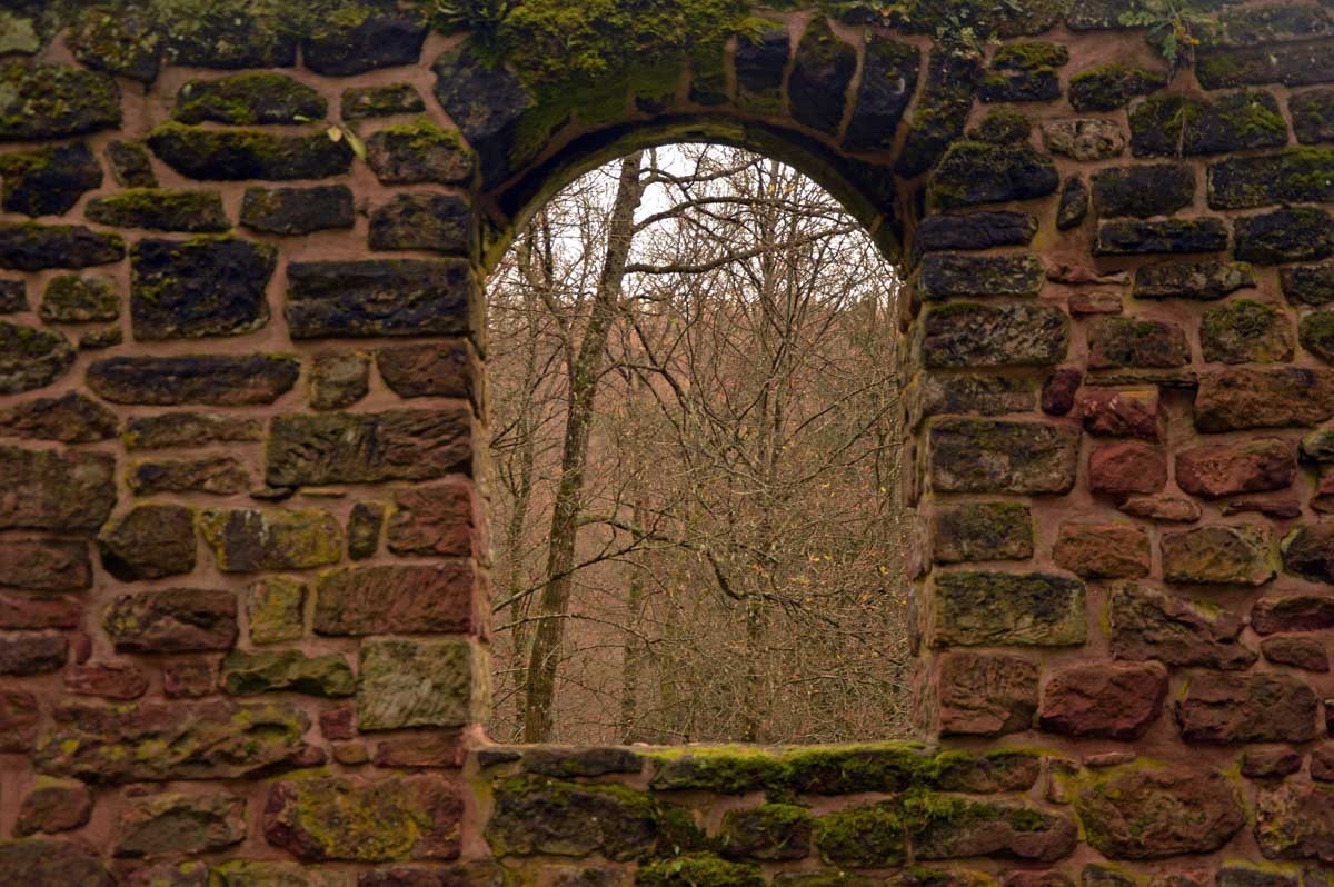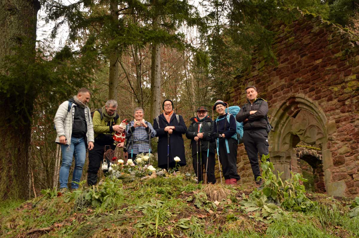 Abri déjeuner au sec (pas compris l’intérêt vu qu’il pleuvait pas), Fontaine de Nassau (ne rêvez pas des Bahamas, c’est juste une source par chez nous), le tout entre Moselle et Bas-Rhin, et hop, direction la Heidenkirche. Alors là, le pompon, on m’annonce une église construite et agrandie entre le 14ème et le 15ème siècle. Chouette, qu’elle se dit, votre rédactrice, on va voir des vitraux, des statues et tout le bigntz, on prendra des photos, on dira « ouah, pas mal », enfin comme dans une église, quoi. Macache ! Tu sais ce qu’ils m’ont montré ? Rien que de l’évoquer je me sens cocotte-minute (et je cocottais la sueur mais c’est une autre histoire…)… Une ruine ! Oui tu as bien lu : une ruine !