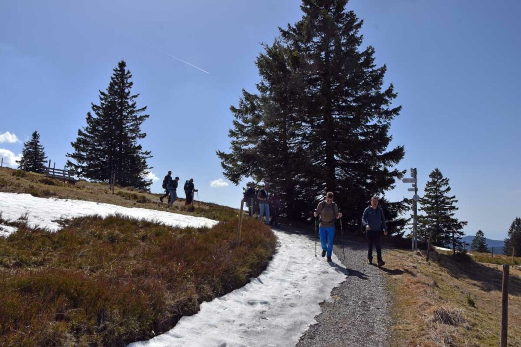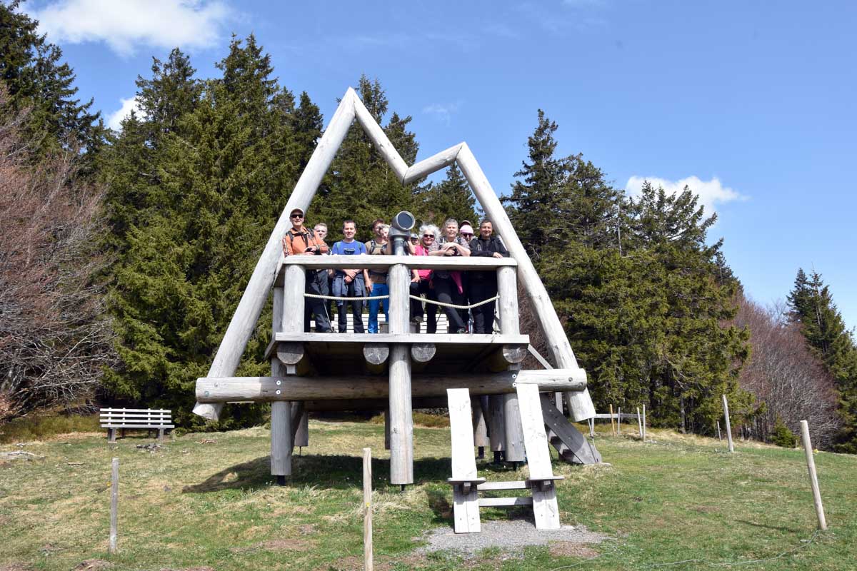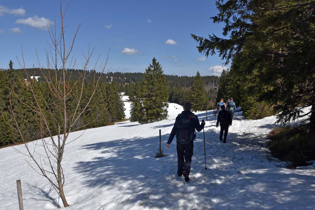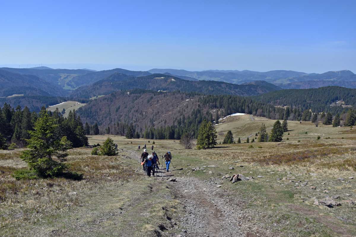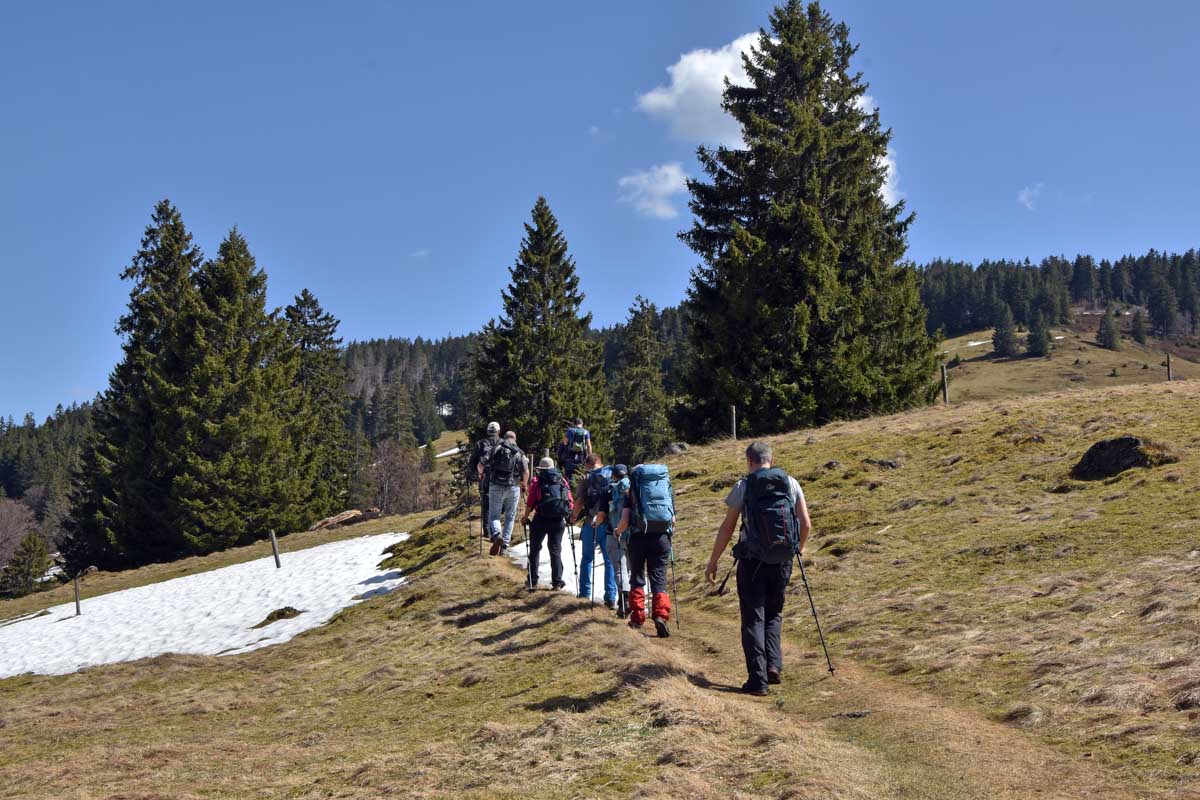 Au départ de Bernau-Hof, montée dans un décor alpin vers le Herzogenhorn (1414m) en profitant du grand soleil pour une vue sur les Alpes et sur la Forêt-Noire, dont le Belchen. Après la descente dans la neige, montée au Spiesshorn puis au Petit Spiesshorn, pour de nouvelles vues sur le dôme de Saint-Blaise et les Alpes, avant la plateforme d’observation.