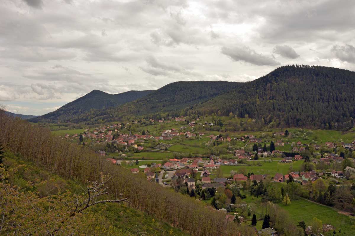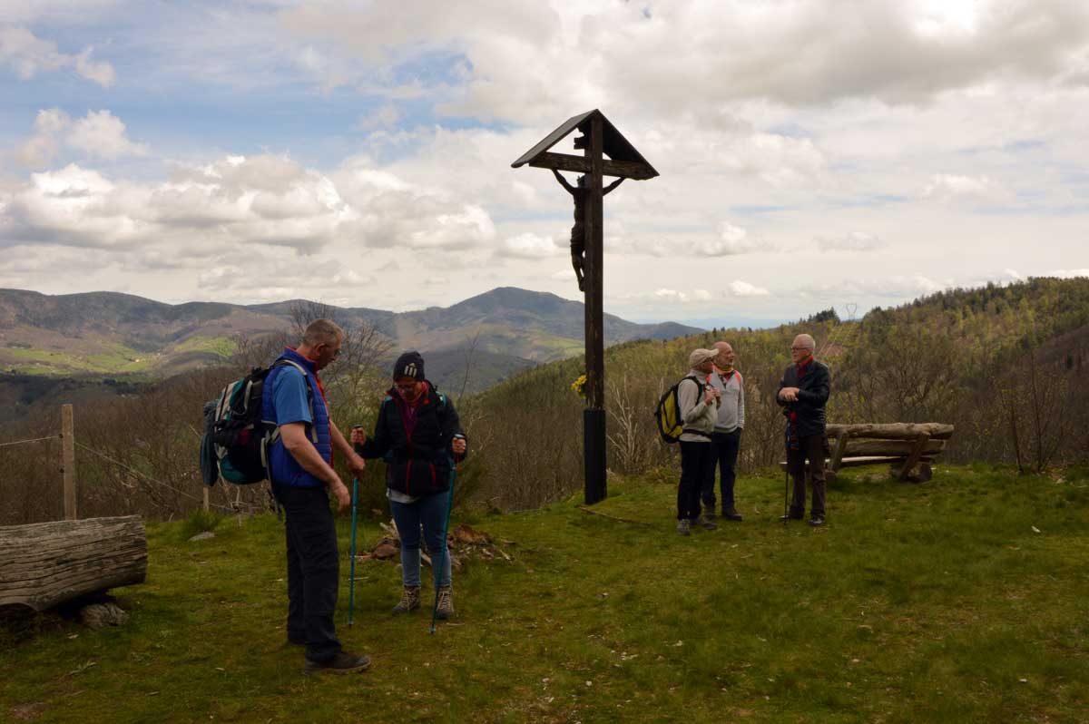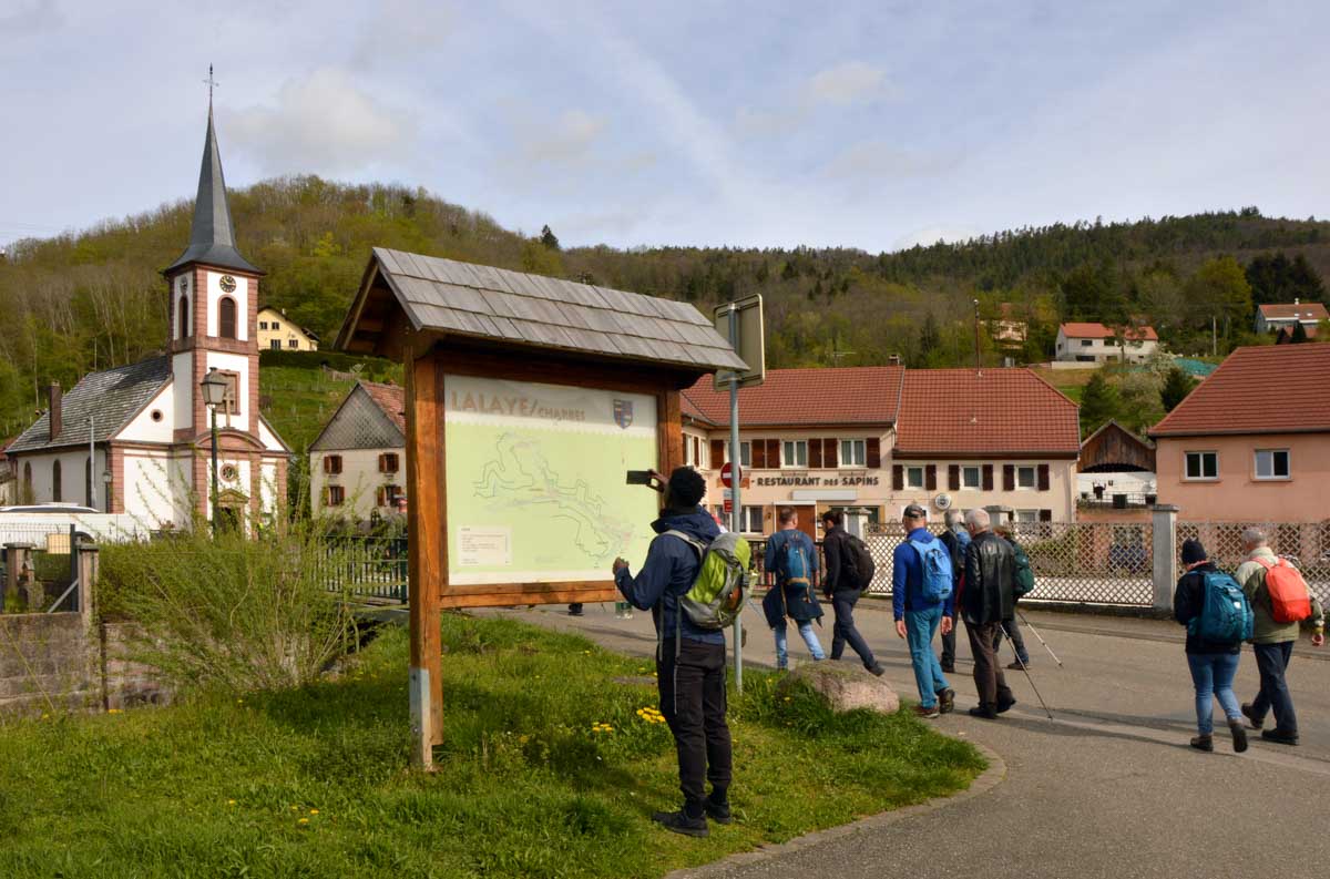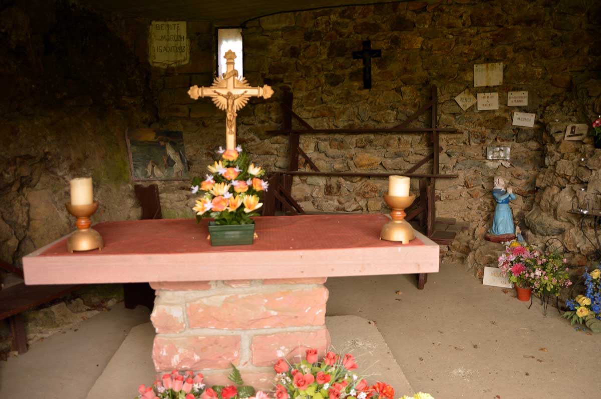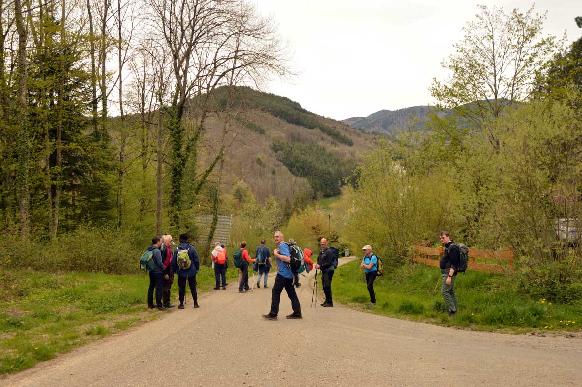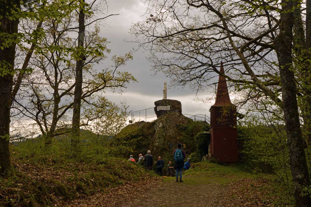 On m’a dit que Sainte-Aurélie patronnant la paroisse, en 1865 le curé de Lalaye commanda une statue de l’Aurélie en question et quelle ne fut pas sa surprise lorsqu’il reçut en retour une statue de la Vierge ! Il remarqua tout de suite la différence, après tout c’était son boulot. Pas rancunier, il a dû se dire que pour protéger le village, ce n’était pas mal non plus, et sitôt pensé, il installa la Vierge sur un rocher dominant toute la Vallée du Giessen. En 1933, on ajouta une chapelle en forme de grotte de Lourdes, mais construite en béton armé, et voilà le travail ! Vous me direz enfin que pour une fois, nous avons laissé les capes de pluie au fond des sacs. Oui, du soleil et aussi des nuages qui, juste après notre pot final à Villé, ont donné des averses. On s’en fouta… pardon : nous n’en avions cure puisque nous nous trouvions déjà dans nos véhicules.