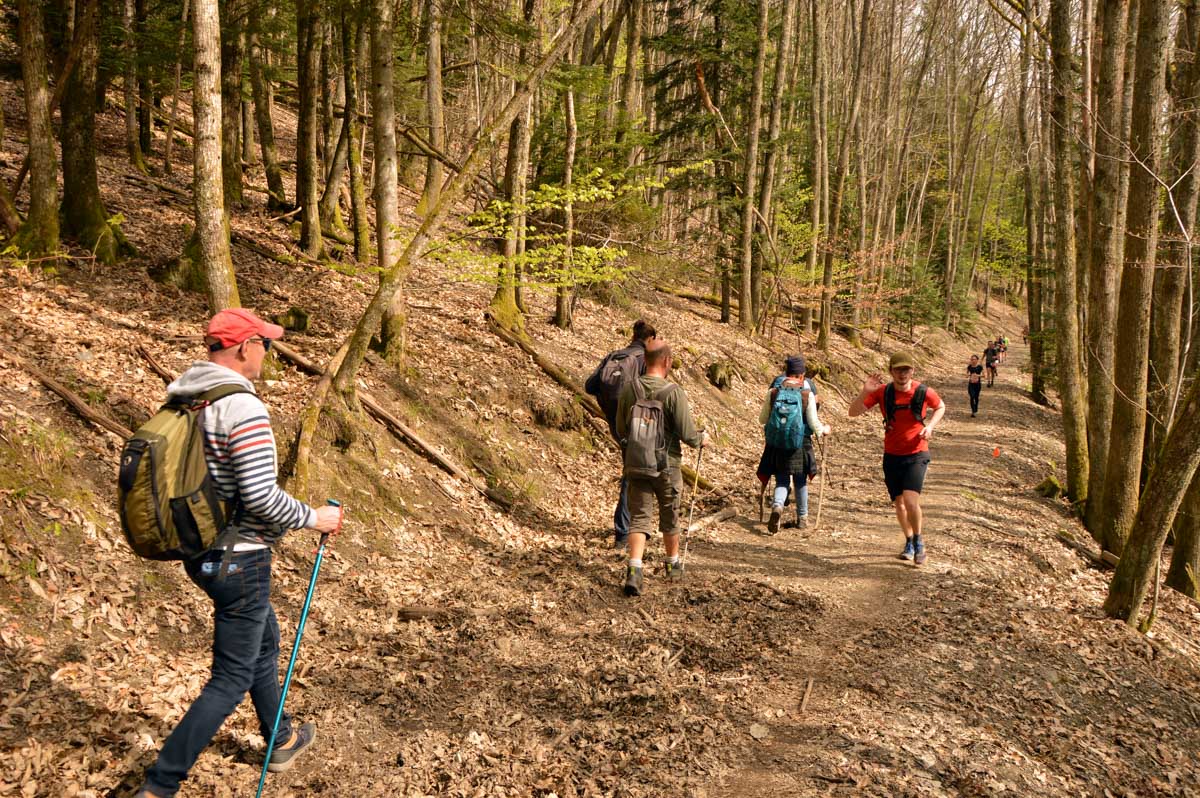 Je vous dirais qu’aujourd’hui, on a trouvé plus schtarbés que nous ! Nous croisâtes… non c’est pas celui-là, alors c’est l’autre… Nous croisâmes des coureuses et des coureurs de tous âges, ahanant dans les montées, sprintant dans les descentes, en longues colonnes transpirantes, pour comprendre que tout ce bazar semblait plutôt organisé. Et il l’était, puisqu’il s’agissait de la onzième édition du trail du Wurzel, autrement dit huit-cents personnes s’élançant pour treize, vingt-six ou cinquante-deux kilomètres, et j’vous épargne le dénivelé. Et puis non tiens : minimum 900 mètres et jusqu’à 2450 mètres !