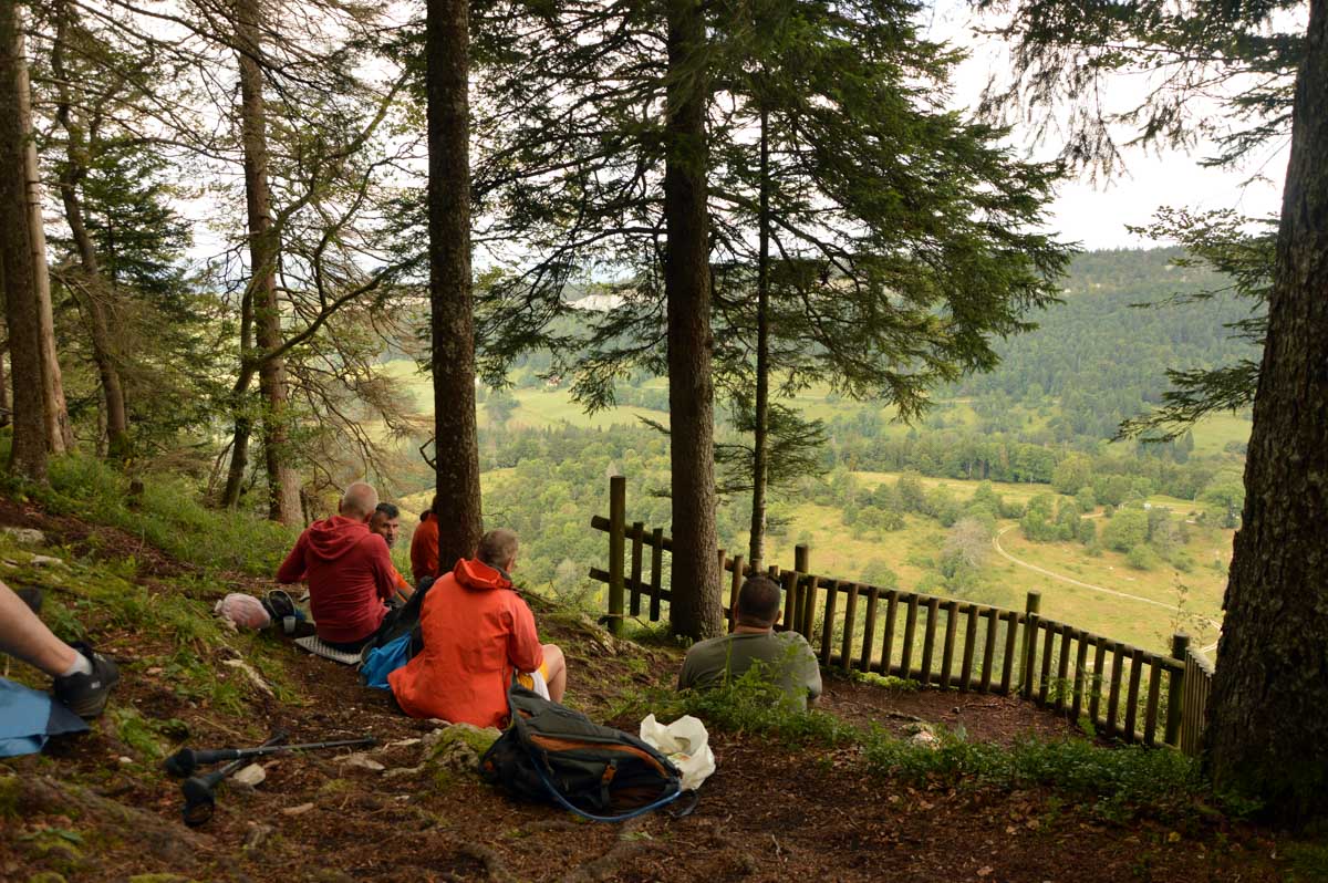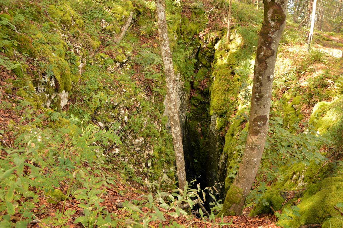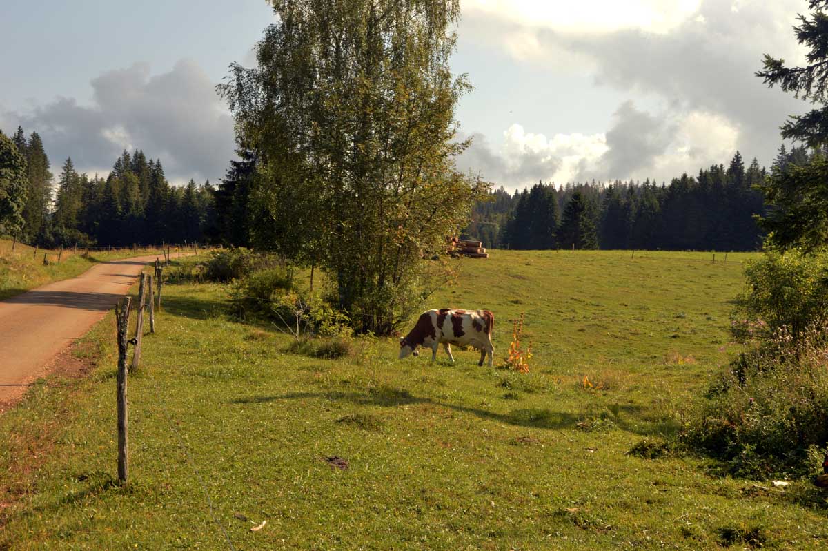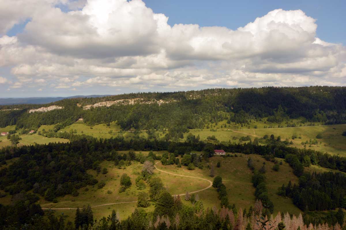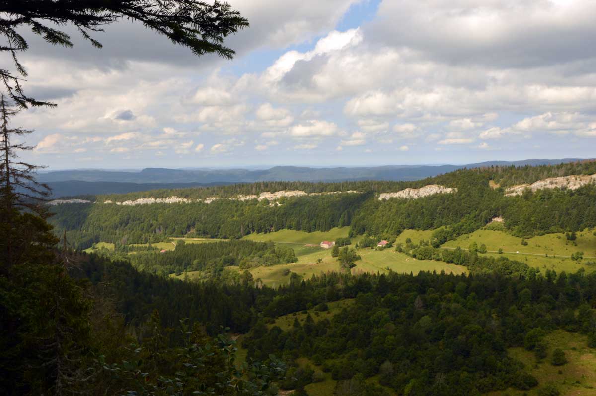 Lamoura la montagne… Hm, commence bien cet article, mais je fais ce que je veux avec ce que j’ai ! Et voilà ta rédactrice lancée dans le paysage haut-jurassien. Entre le lendemain de la fête de l’Abonde à Lamoura (je sentais encore les effluves des jeunes paysans charpentés) et les œuvres du sympathique charpentier des Eterpets (je suis amoureuse, je le sens dans ma vieille charpente), j’ai pérégriné jusqu’à la grotte du Célary et sa fameuse cheminée, une sorte de gouffre, quoi. Et aussi un belvédère où j’ai cassé la croûte et pas qu’elle. Je te le dis, ça sentait le spéléologue en rut là-dedans ! Ou alors c’étaient mes chaussures ? Je sais pas.