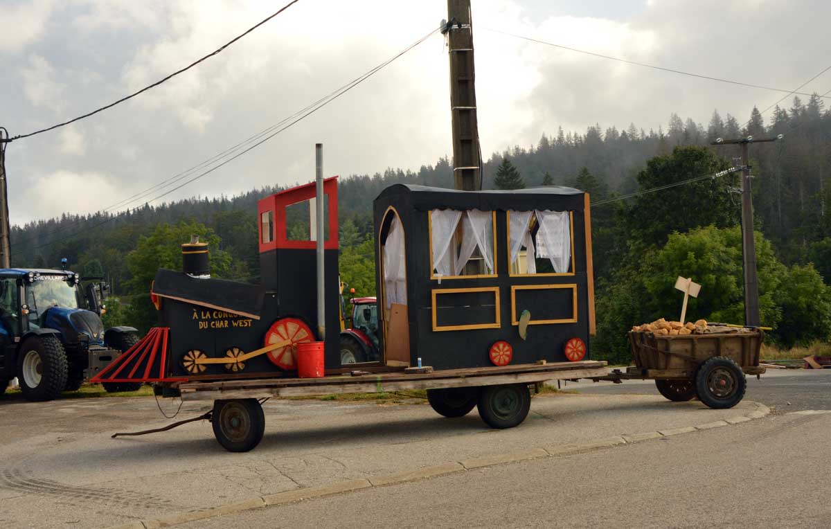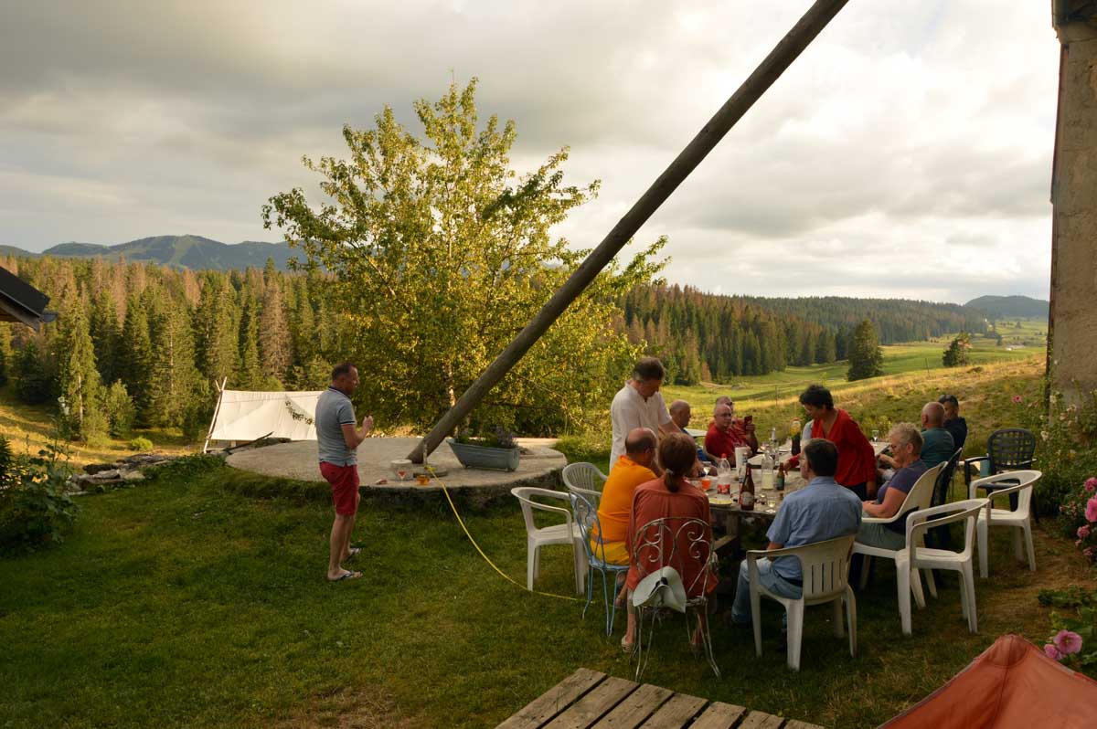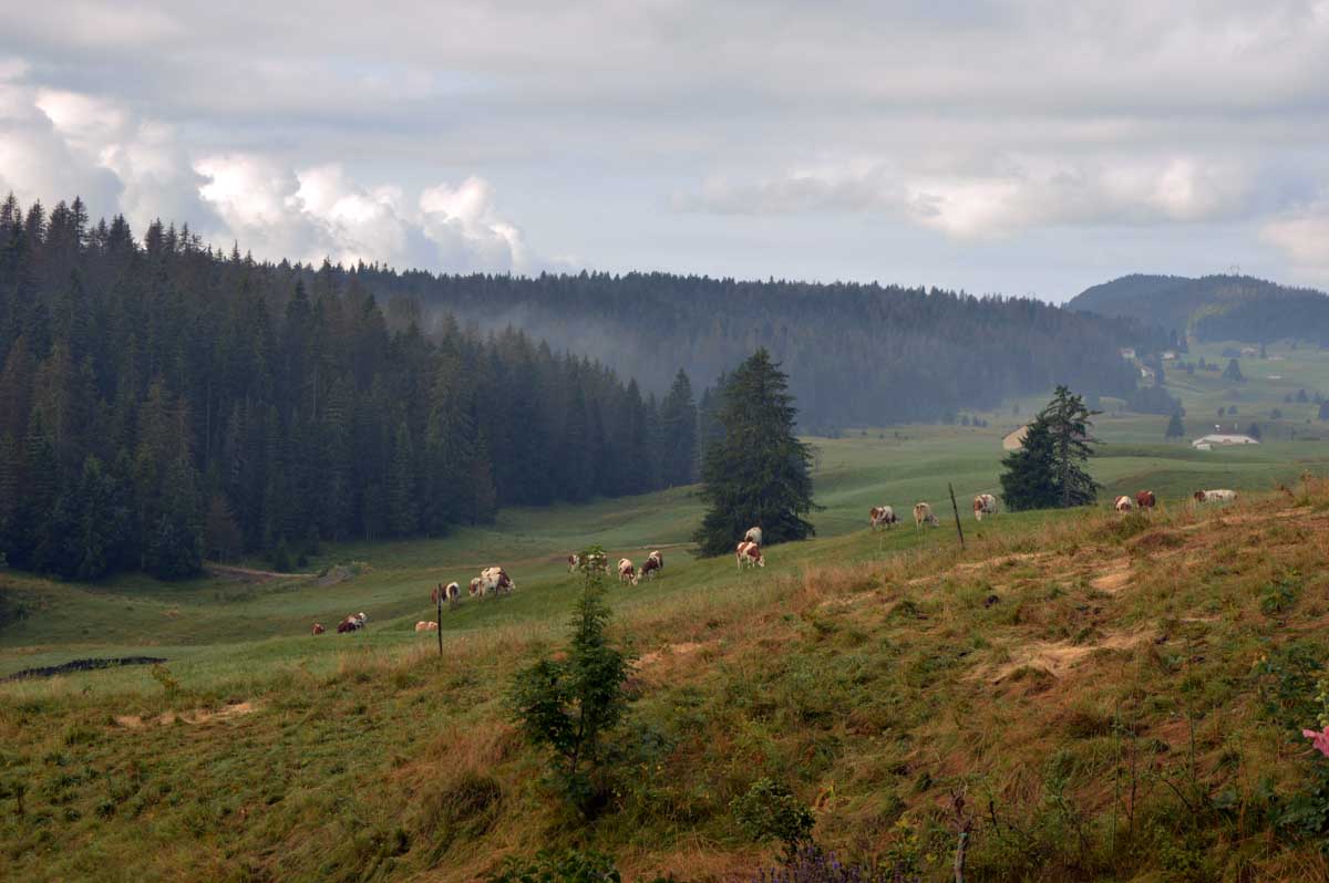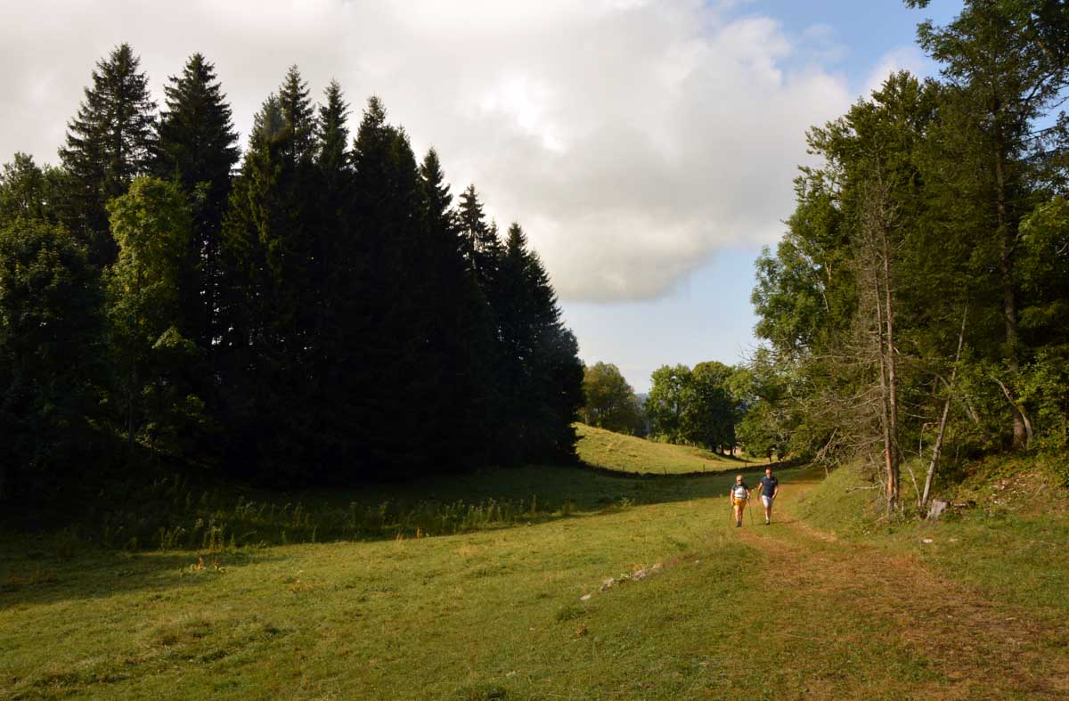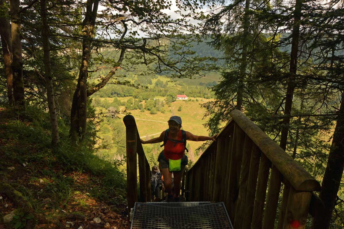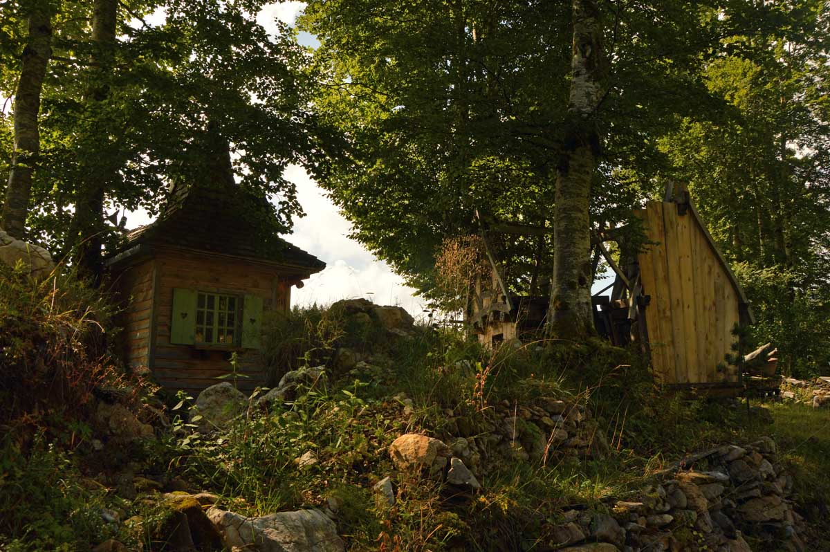 Lamoura la montagne… Hm, commence bien cet article, mais je fais ce que je veux avec ce que j’ai ! Et voilà ta rédactrice lancée dans le paysage haut-jurassien. Entre le lendemain de la fête de l’Abonde à Lamoura (je sentais encore les effluves des jeunes paysans charpentés) et les œuvres du sympathique charpentier des Eterpets (je suis amoureuse, je le sens dans ma vieille charpente), j’ai pérégriné jusqu’à la grotte du Célary et sa fameuse cheminée, une sorte de gouffre, quoi. Et aussi un belvédère où j’ai cassé la croûte et pas qu’elle. Je te le dis, ça sentait le spéléologue en rut là-dedans ! Ou alors c’étaient mes chaussures ? Je sais pas.