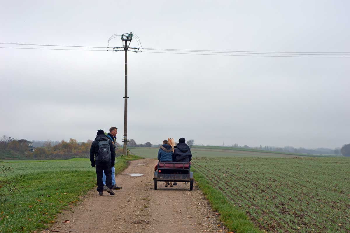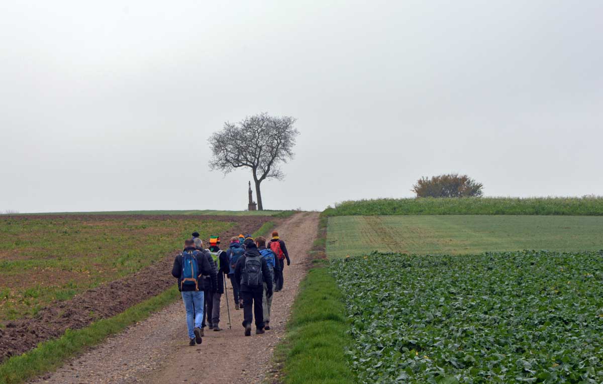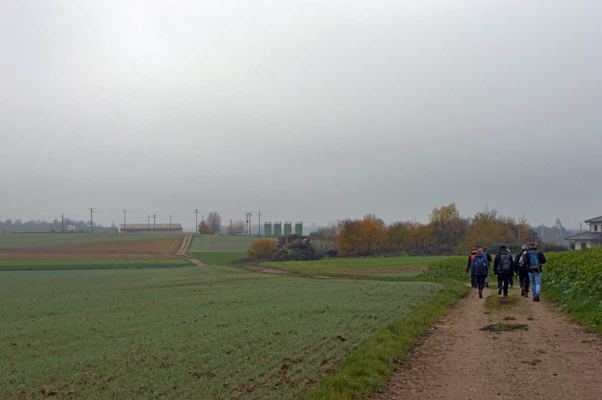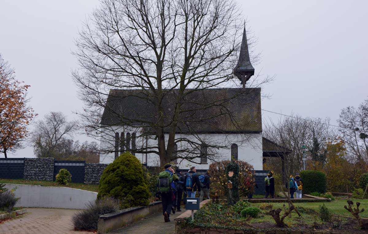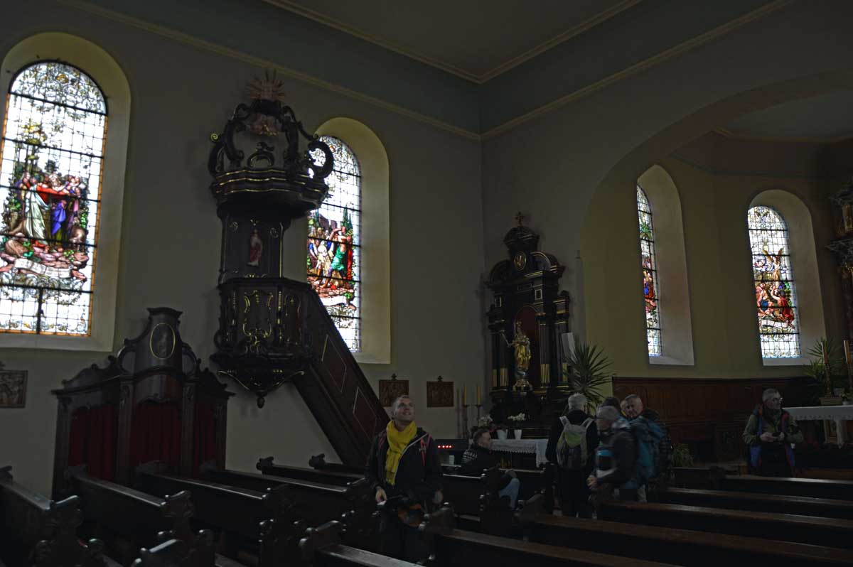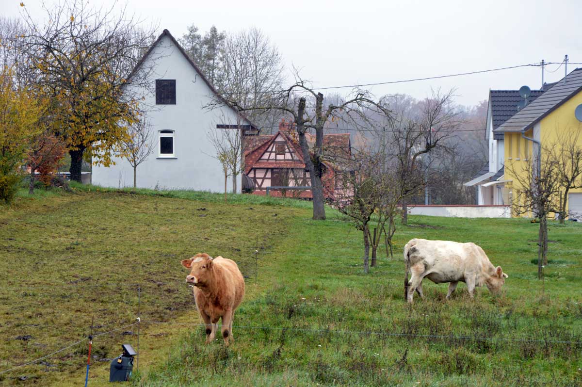 Détruite en 1940, l’ancienne Chapelle Notre-Dame du Chêne à Niederlauterbach, a été reconstruite en 1962 et nous invite à admirer les superbes vitraux de Tristan Ruhlmann. C’est aussi dans le parc qui l’entoure que nous avons expédié le déjeuner, si vite que Don Camillo n’a pas eu le temps de venir nous bénir entre deux films ! Nous avons croisé des vaches (sans prisonniers heureusement) et des chevaux (que personne ne songe à achever, tant mieux). Le temps de les comprendre ces deux allusions-là, et nous voilà repartis à travers champs pour en admirer les ondulations de terrain dans la brume et revenir vers Lauterbourg. Pour y profiter d’une sympathique tradition allemande, le Kaffee-Kuchen ! Ben tiens, on n’allait pas se priver avant de rentrer nous poser sur nos canapés et peut-être rejoindre l’Inspecteur Barnaby et, après cette journée au grand air, ne pas s’endormir avant la fin !