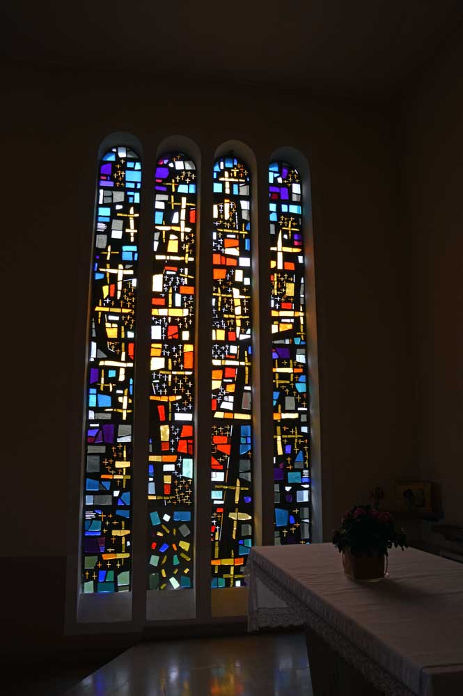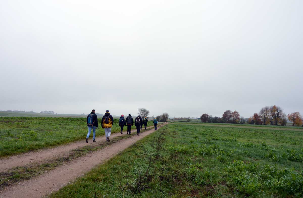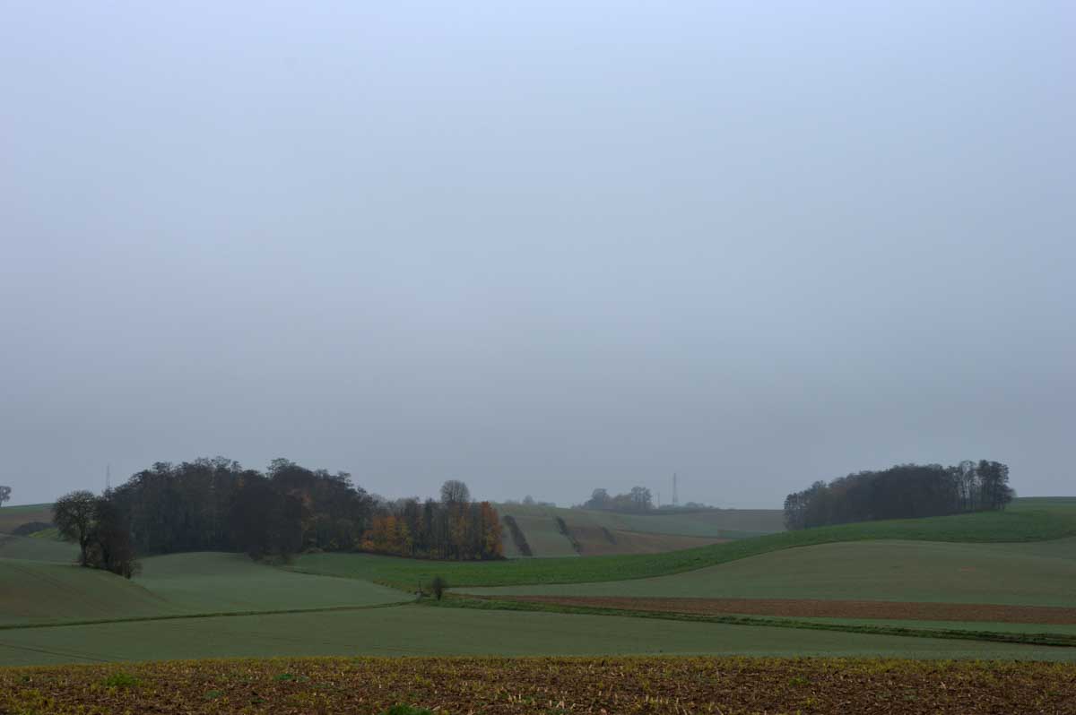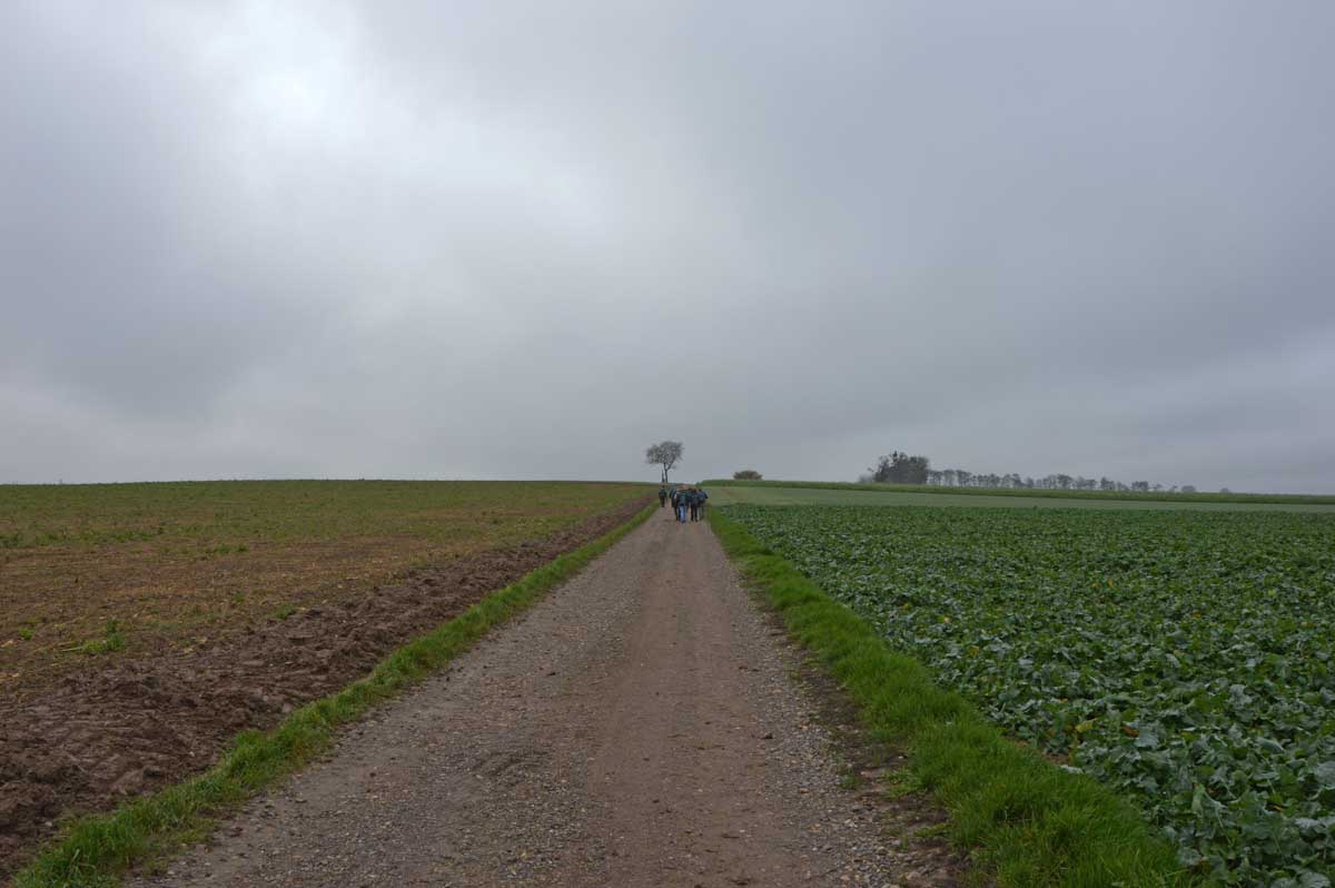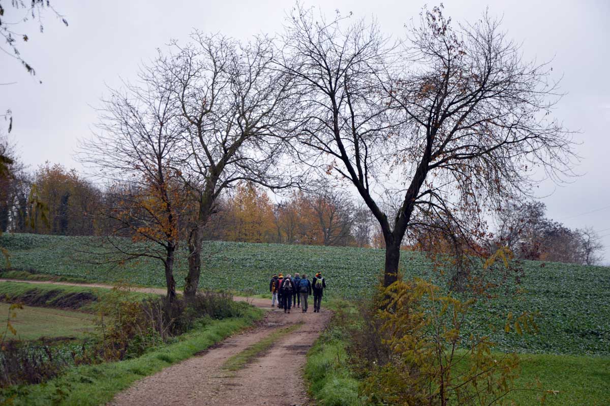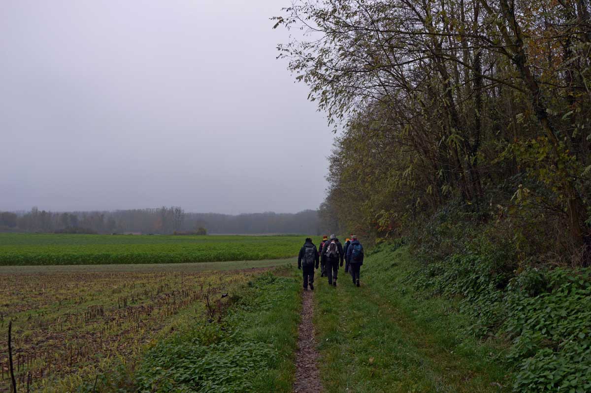 Détruite en 1940, l’ancienne Chapelle Notre-Dame du Chêne à Niederlauterbach, a été reconstruite en 1962 et nous invite à admirer les superbes vitraux de Tristan Ruhlmann. C’est aussi dans le parc qui l’entoure que nous avons expédié le déjeuner, si vite que Don Camillo n’a pas eu le temps de venir nous bénir entre deux films ! Nous avons croisé des vaches (sans prisonniers heureusement) et des chevaux (que personne ne songe à achever, tant mieux). Le temps de les comprendre ces deux allusions-là, et nous voilà repartis à travers champs pour en admirer les ondulations de terrain dans la brume et revenir vers Lauterbourg. Pour y profiter d’une sympathique tradition allemande, le Kaffee-Kuchen ! Ben tiens, on n’allait pas se priver avant de rentrer nous poser sur nos canapés et peut-être rejoindre l’Inspecteur Barnaby et, après cette journée au grand air, ne pas s’endormir avant la fin !