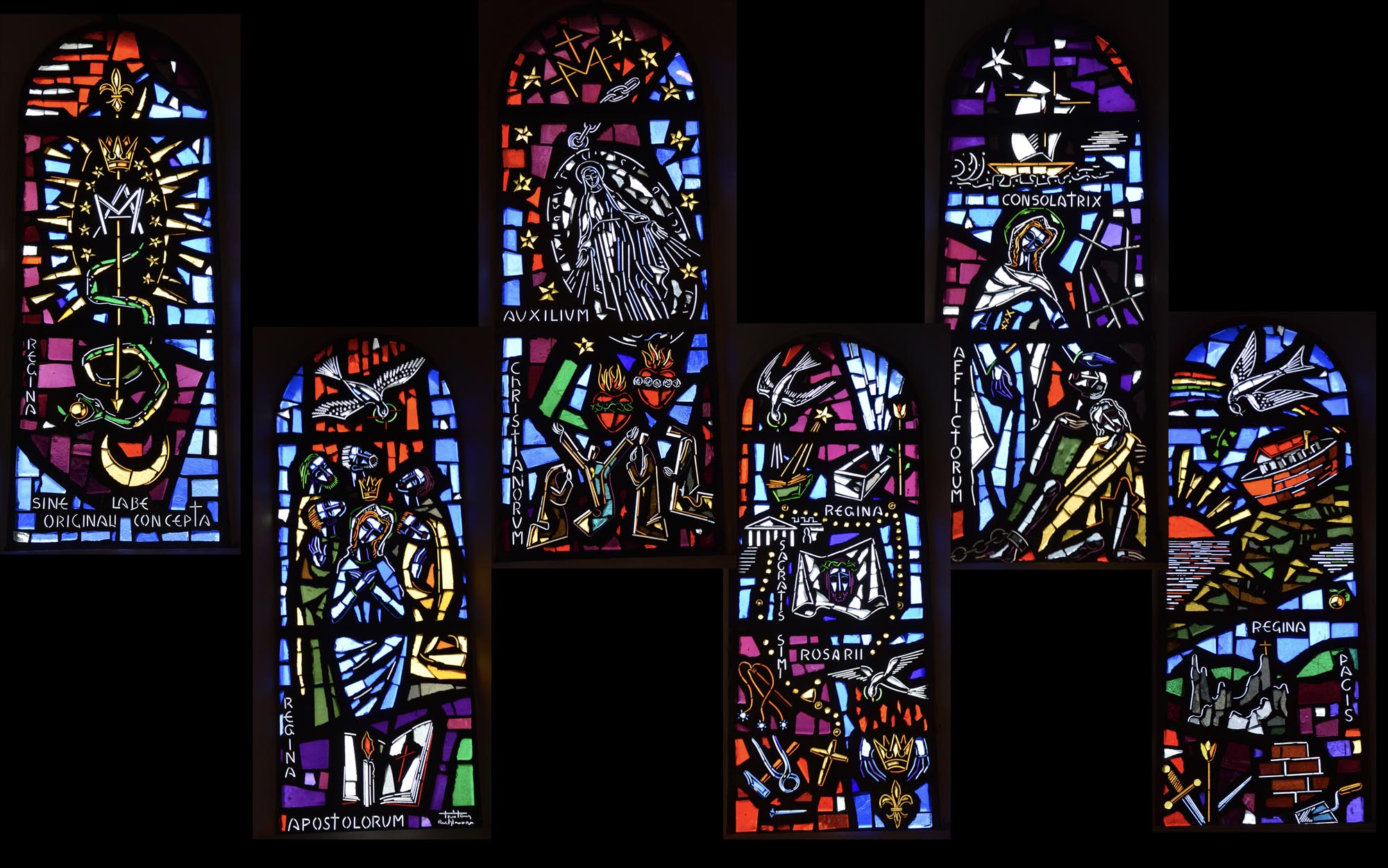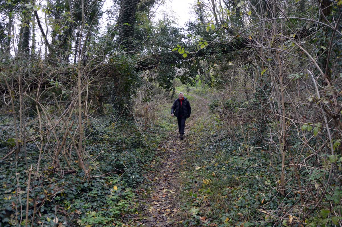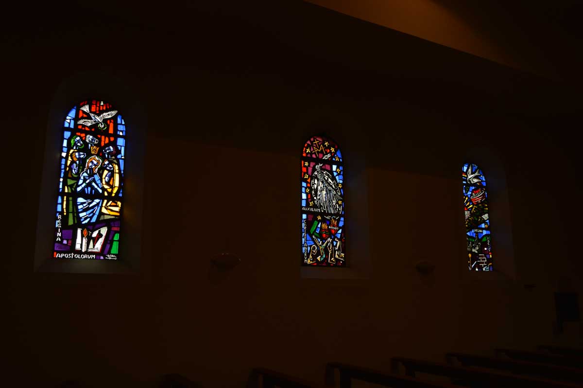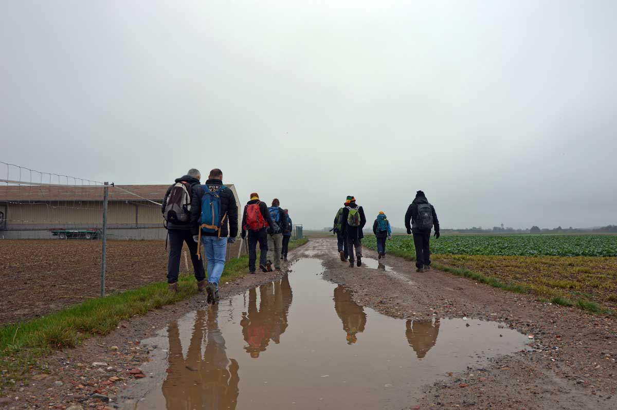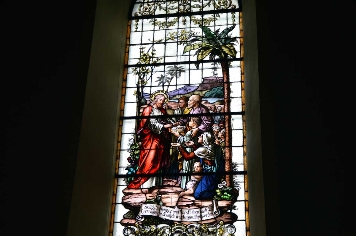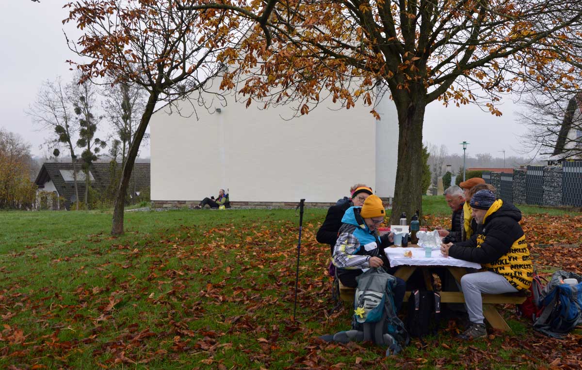 Détruite en 1940, l’ancienne Chapelle Notre-Dame du Chêne à Niederlauterbach, a été reconstruite en 1962 et nous invite à admirer les superbes vitraux de Tristan Ruhlmann. C’est aussi dans le parc qui l’entoure que nous avons expédié le déjeuner, si vite que Don Camillo n’a pas eu le temps de venir nous bénir entre deux films ! Nous avons croisé des vaches (sans prisonniers heureusement) et des chevaux (que personne ne songe à achever, tant mieux). Le temps de les comprendre ces deux allusions-là, et nous voilà repartis à travers champs pour en admirer les ondulations de terrain dans la brume et revenir vers Lauterbourg. Pour y profiter d’une sympathique tradition allemande, le Kaffee-Kuchen ! Ben tiens, on n’allait pas se priver avant de rentrer nous poser sur nos canapés et peut-être rejoindre l’Inspecteur Barnaby et, après cette journée au grand air, ne pas s’endormir avant la fin !