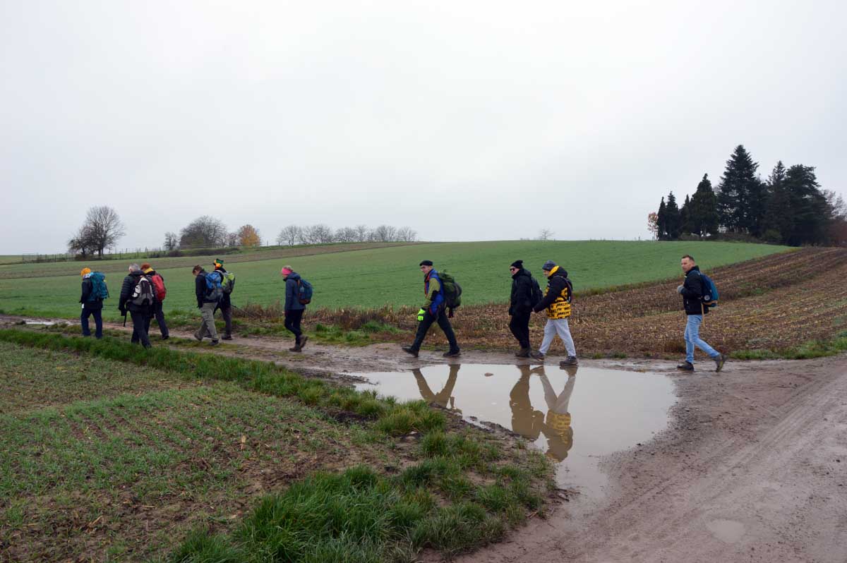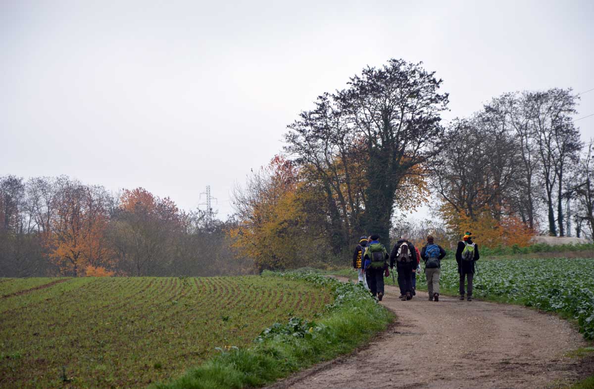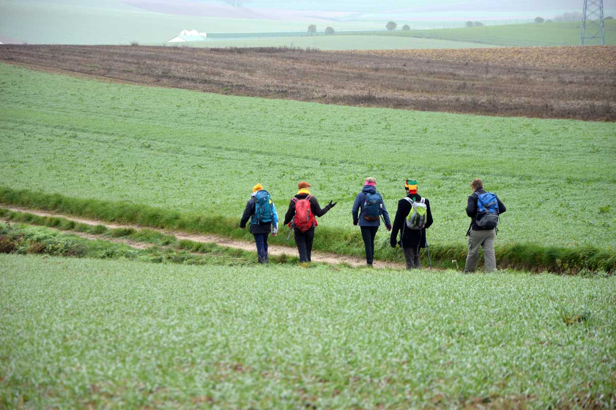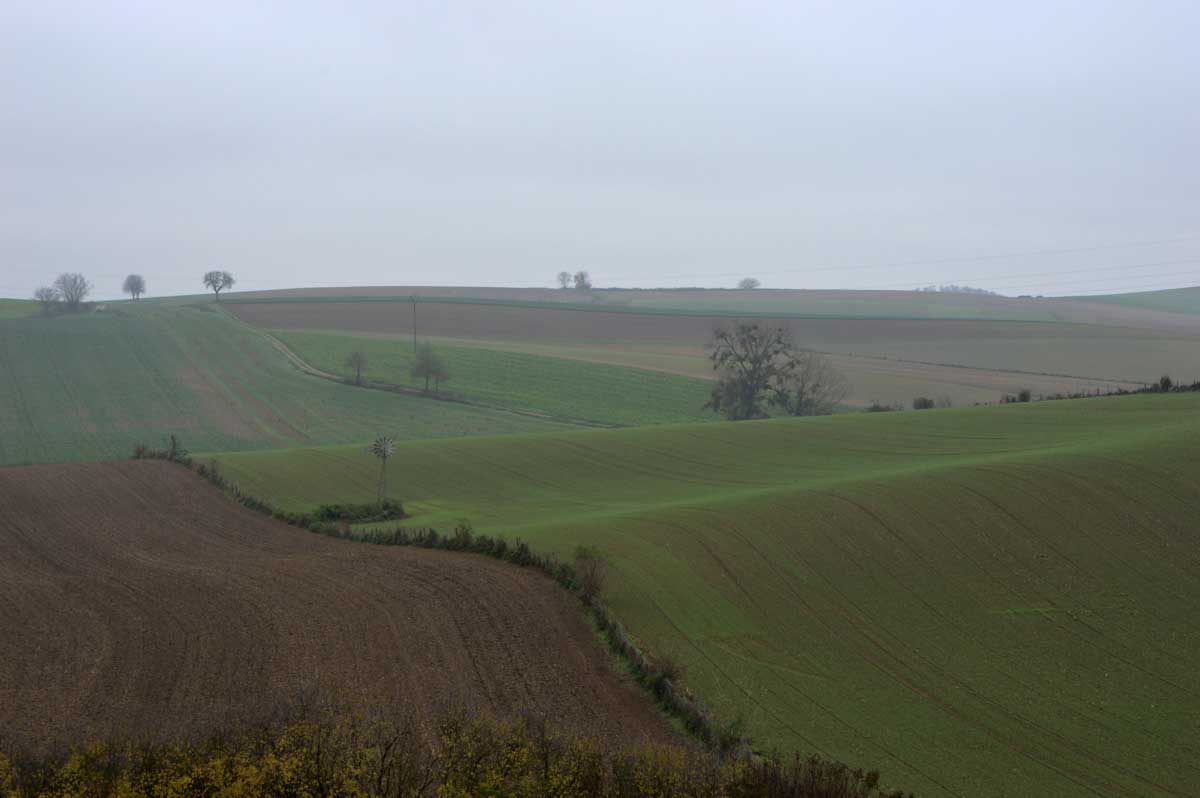 Pas d’univers impitoyable mais tout de même, un petit air de Dallas en ce dimanche, dans ce paysage embrumé où l’on se prenait volontiers à songer « j’y erre ». Voilà, celle-là il fallait la faire et nous passons aussitôt à la Sue Ellen de service incarnée à tour de rôle par nos randonneurs dégustant un petit rouge. Pas de derrick ici, mais… non pas de derrick, la tour de forage, pas le policier allemand, commencez pas sinon on n’en sortira pas…