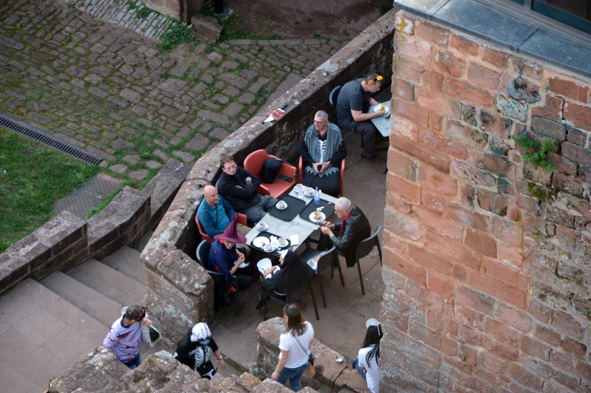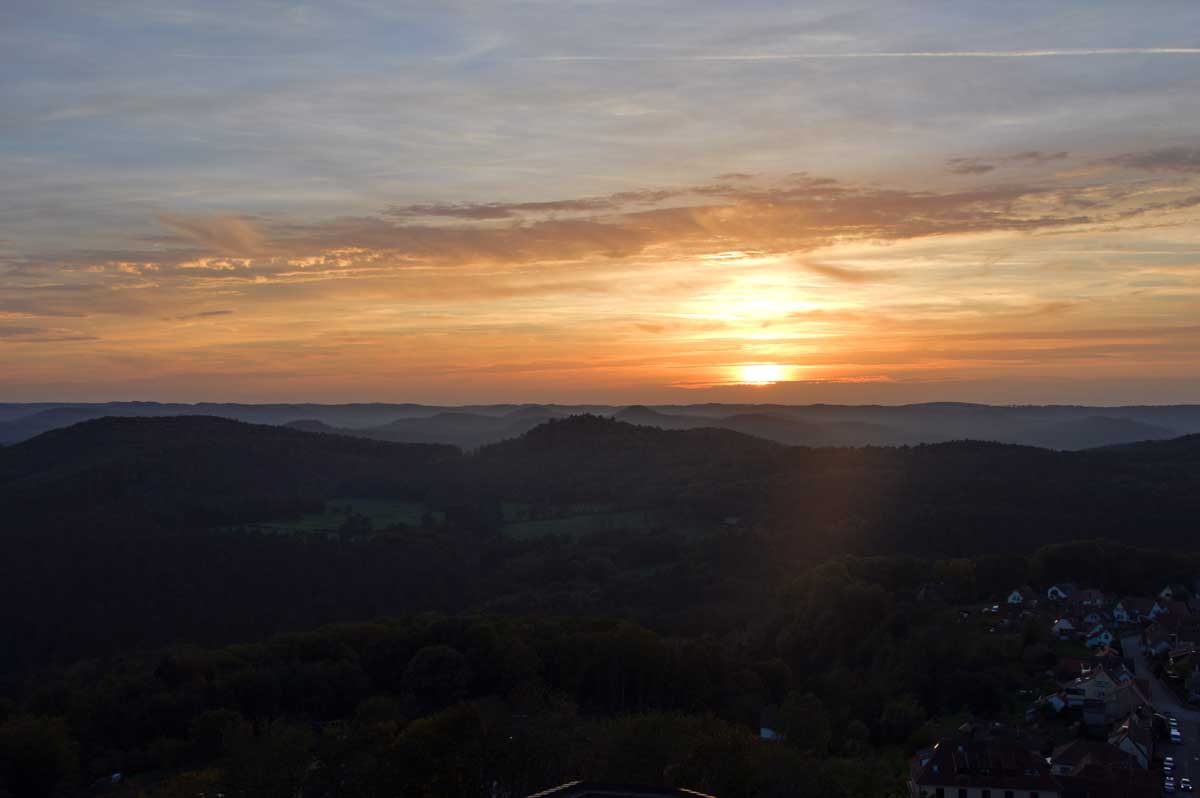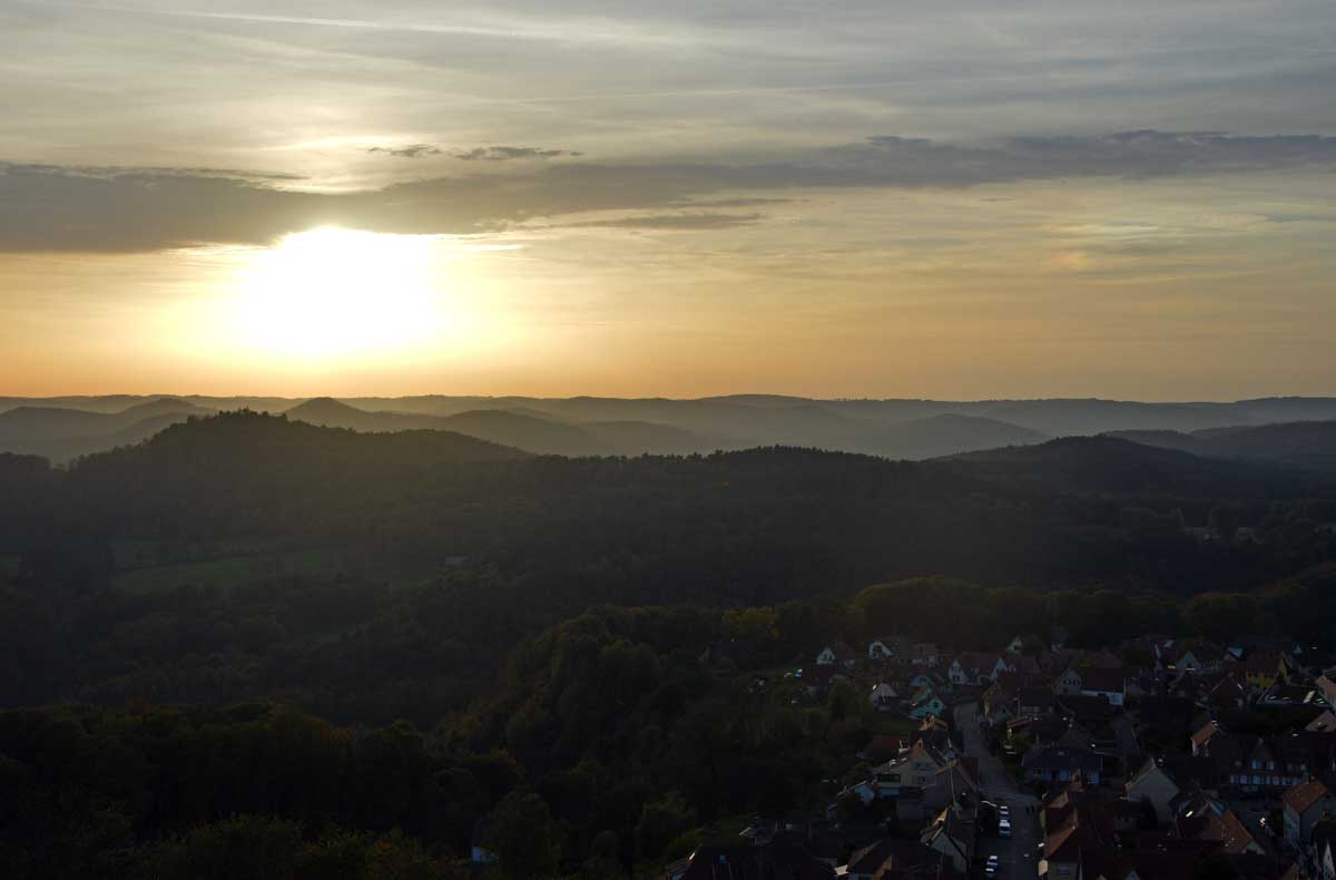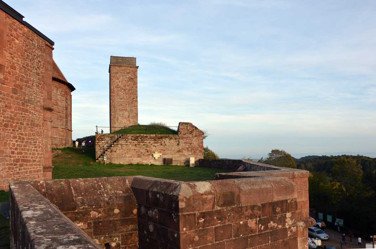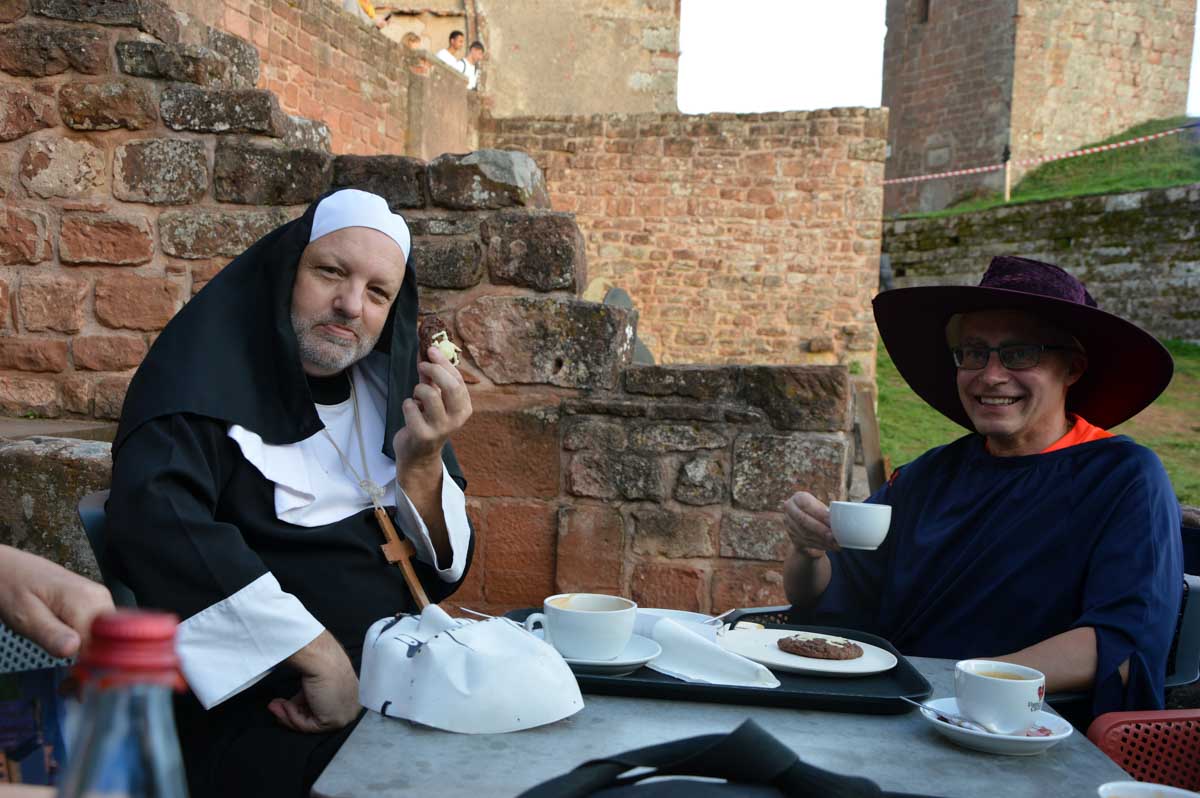 Et là, plantureuse, la robe relevée sur ses cuisses poilues, Sœur Marie-Grognasse s’élève dans son donjon pour en conquérir le sommet (après avoir loupé une marche) et embrasser de son regard concupiscent le coucher du soleil et la vue circulaire sur son territoire des Vosges du Nord. Le soleil disparaissant derrière le doux relief est pour la Sœur un signal : celui de son inapaisable estomac qui, en pleine absorption de douceurs pâtissières, lui rappelle le dîner à venir.