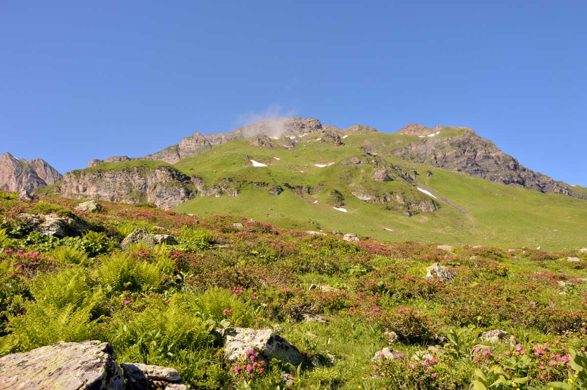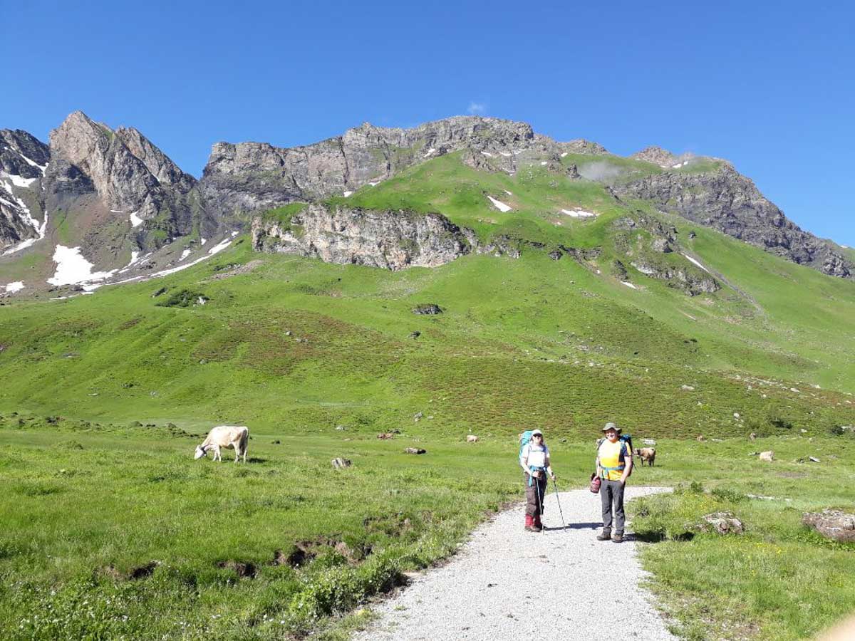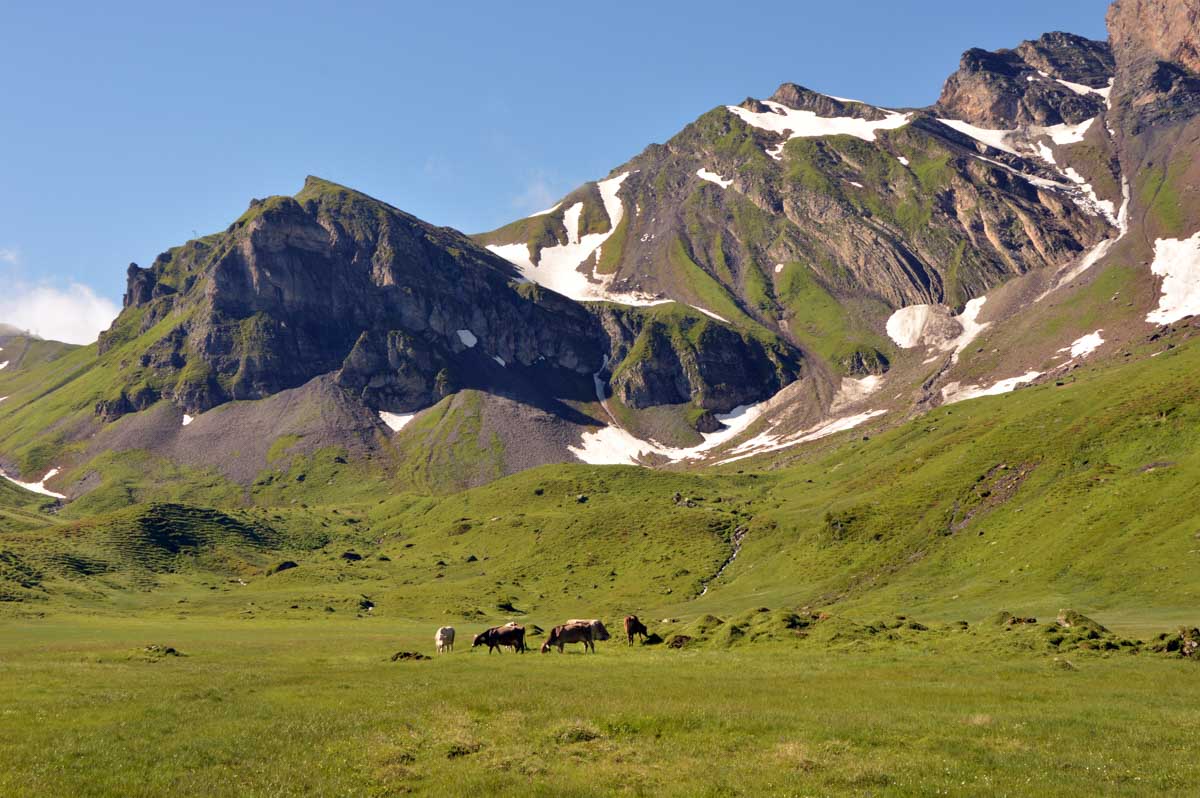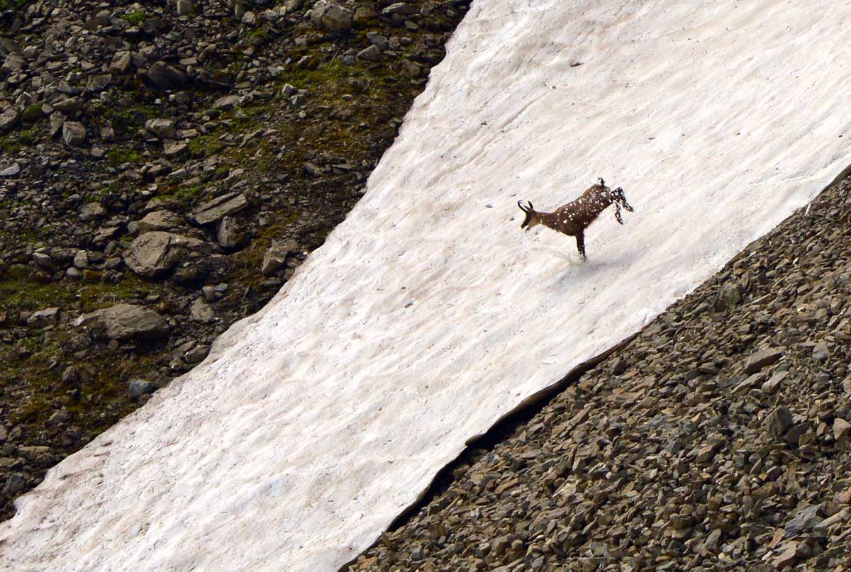 Sacrés acrobates, les chamois ! Ca te sautille de rocher en névé, tout en légèreté et finesse. Comme moi dans ma jeunesse quand je sautillais dans les prés, un peu Heidi, un peu Laura Ingalls poursuivie par l’autre là, la moche avec les boucles… Enfin donc oui, j’ai vu des chamois. Des vaches aussi, tu t’en doutes !