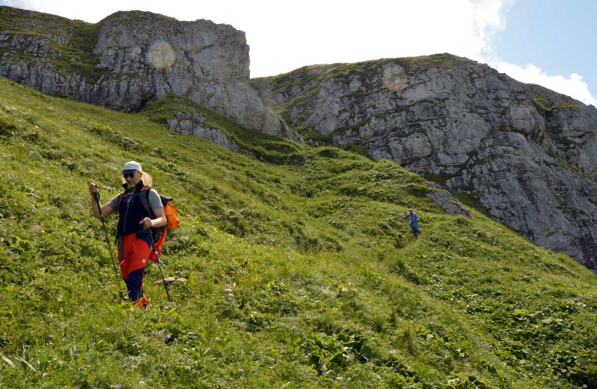 Et là, la descente d’enfer (et non aux enfers), 1300 mètres jusqu’au parking ! Là tu te cramponnes à ce que tu peux, bâtons, racines, branches, arbres entiers, tu dérapes sur les rochers glissants, tu glisses dans la boue dérapante, tu perds tout : l’altitude, l’équilibre, la boussole, le sens des réalités. T’aurais bien pris une gentiane mais tu sais pas comment la distiller.