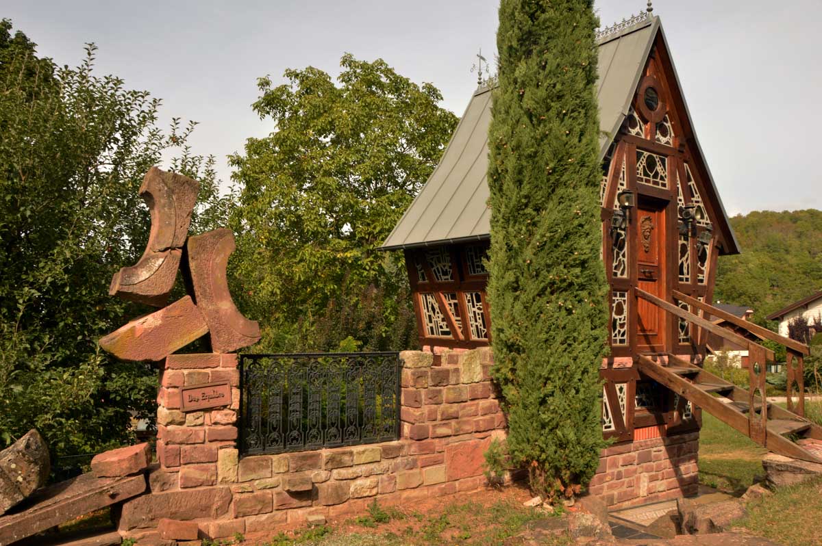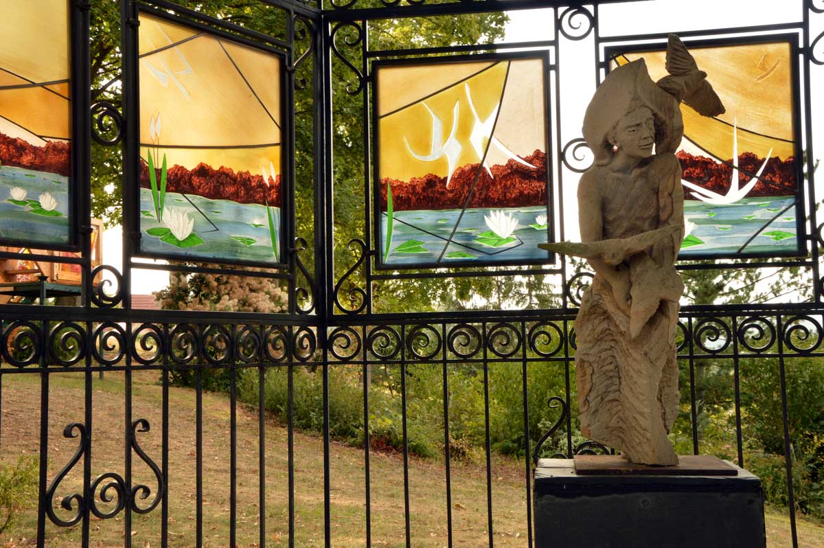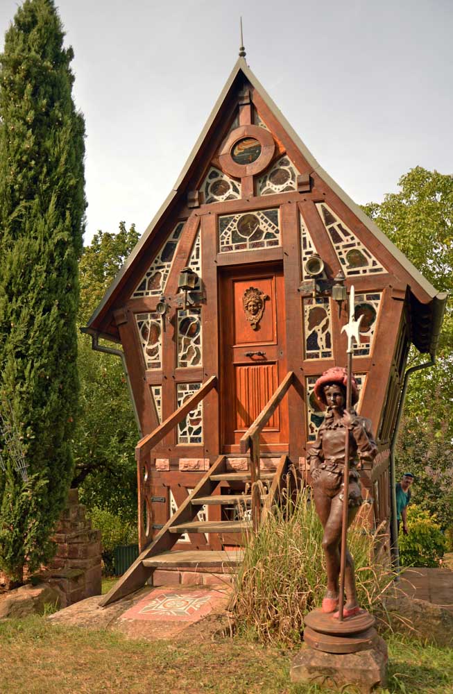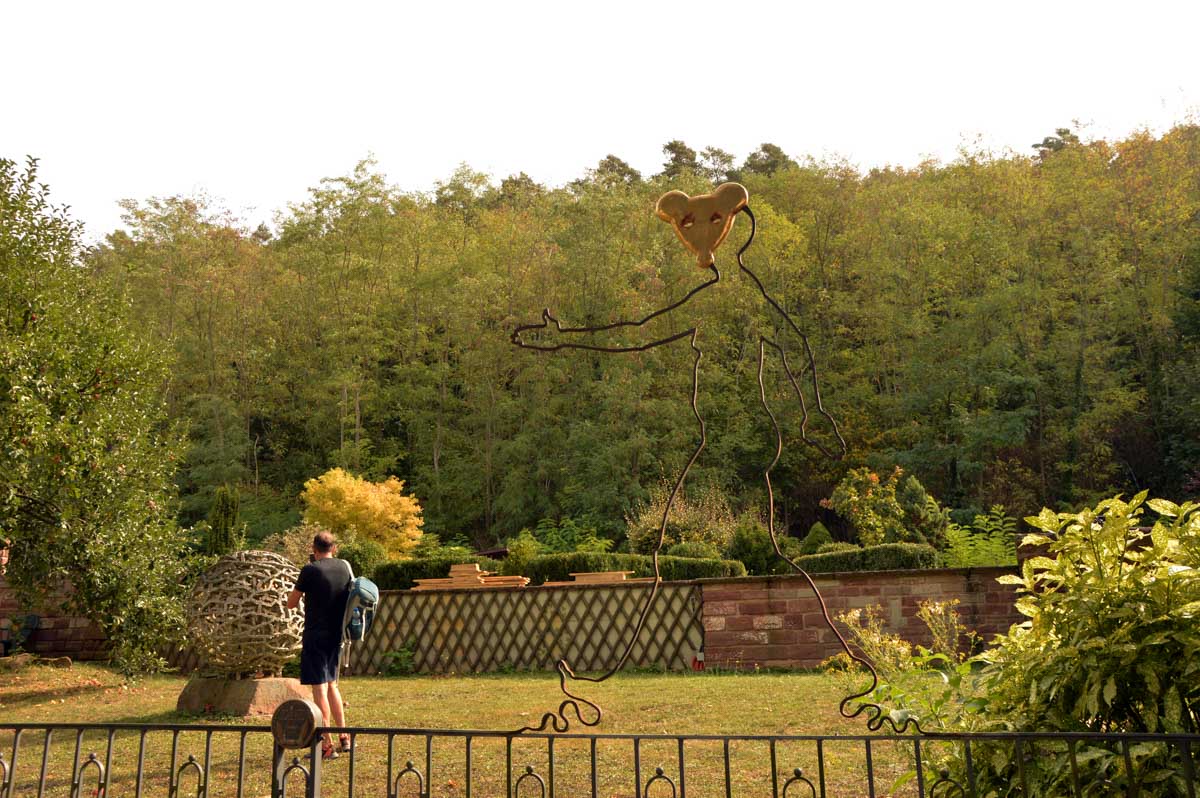 Moi tu me montres un truc avec des vitraux, je réponds chapelle, mais là je me suis fait avoir. C’était une drôle de maisonnette dans le Jardin Folâtre, un espace artistique en plein air. J’ai pas tout compris, mais c’est joli et vachement romantique. Bon, il y a quand même quelqu’un qui s’est amusé à sculpter un gars en train de… comment je vais t’expliquer ça… ben accroupi et pantalon baissé, il, euh… il pose, il démoule, enfin je vais pas te faire un dessin non plus, il y a déjà la sculpture, regarde la photo ! On me l’avait jamais faite, celle-là !