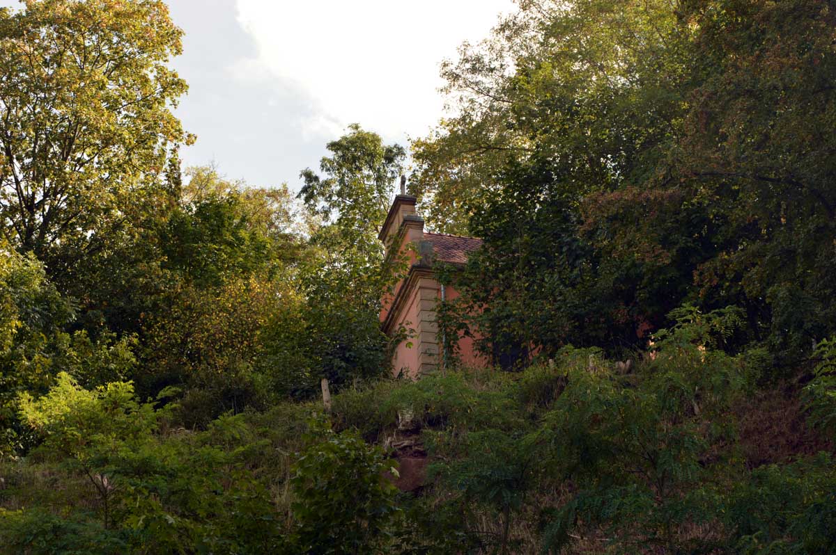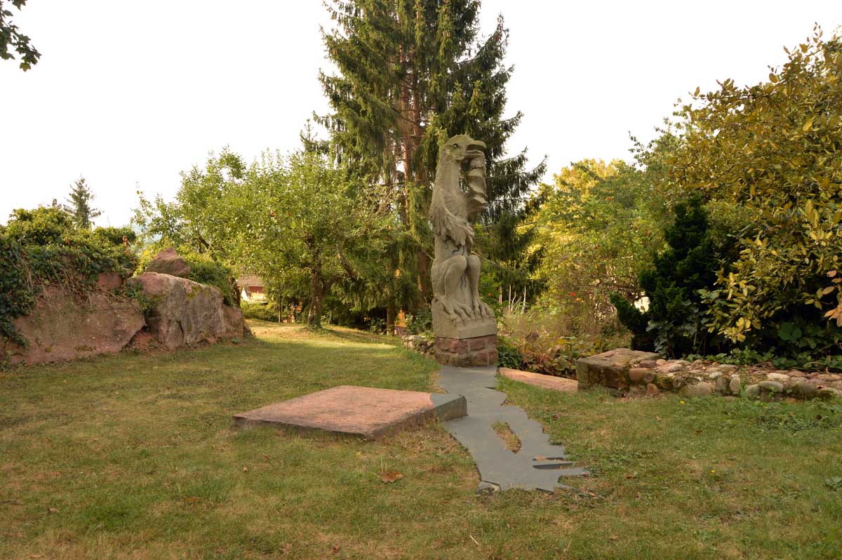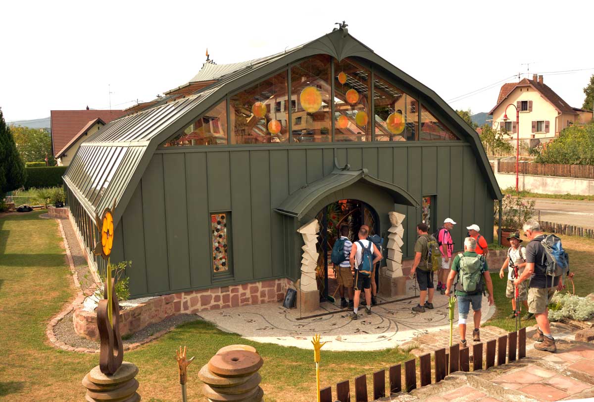 Moi tu me montres un truc avec des vitraux, je réponds chapelle, mais là je me suis fait avoir. C’était une drôle de maisonnette dans le Jardin Folâtre, un espace artistique en plein air. J’ai pas tout compris, mais c’est joli et vachement romantique. Bon, il y a quand même quelqu’un qui s’est amusé à sculpter un gars en train de… comment je vais t’expliquer ça… ben accroupi et pantalon baissé, il, euh… il pose, il démoule, enfin je vais pas te faire un dessin non plus, il y a déjà la sculpture, regarde la photo ! On me l’avait jamais faite, celle-là !