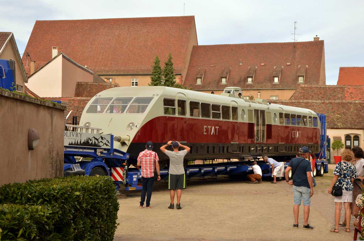 Retour sur Molsheim avec la journée Bugatti. L’autorail construit dans les années 1930 par le génial Italien devenu Alsacien, des fortunes sur roues alignées là, et moi qui me rêvais presqu’un siècle en arrière en flapper, tenue charleston, quelques mèches de cheveux aux vent, passagère fortunée d’une Bugatti Type 35, parcourant le pays avant mes folles nuits au manoir… Romantique en diable ! Bon, atterris ma grande, la folle nuit au manoir c’est plutôt douche, lessive et soirée télé avec les courbatures de cette drôle de randonnée. A propos d’atterrir, le doué Ettore s’était aussi lancé dans l’aéronautique et s’est mis à fabriquer des trains d’atterrissage à Molsheim. Messier-Bugatti, devenu Safran, d’où le train d’atterrissage du début posé là. J’ai bien fait de ne pas appeler les secours !