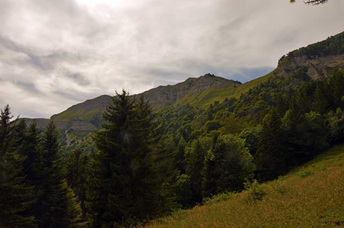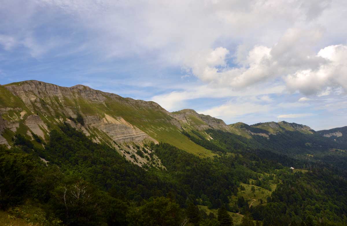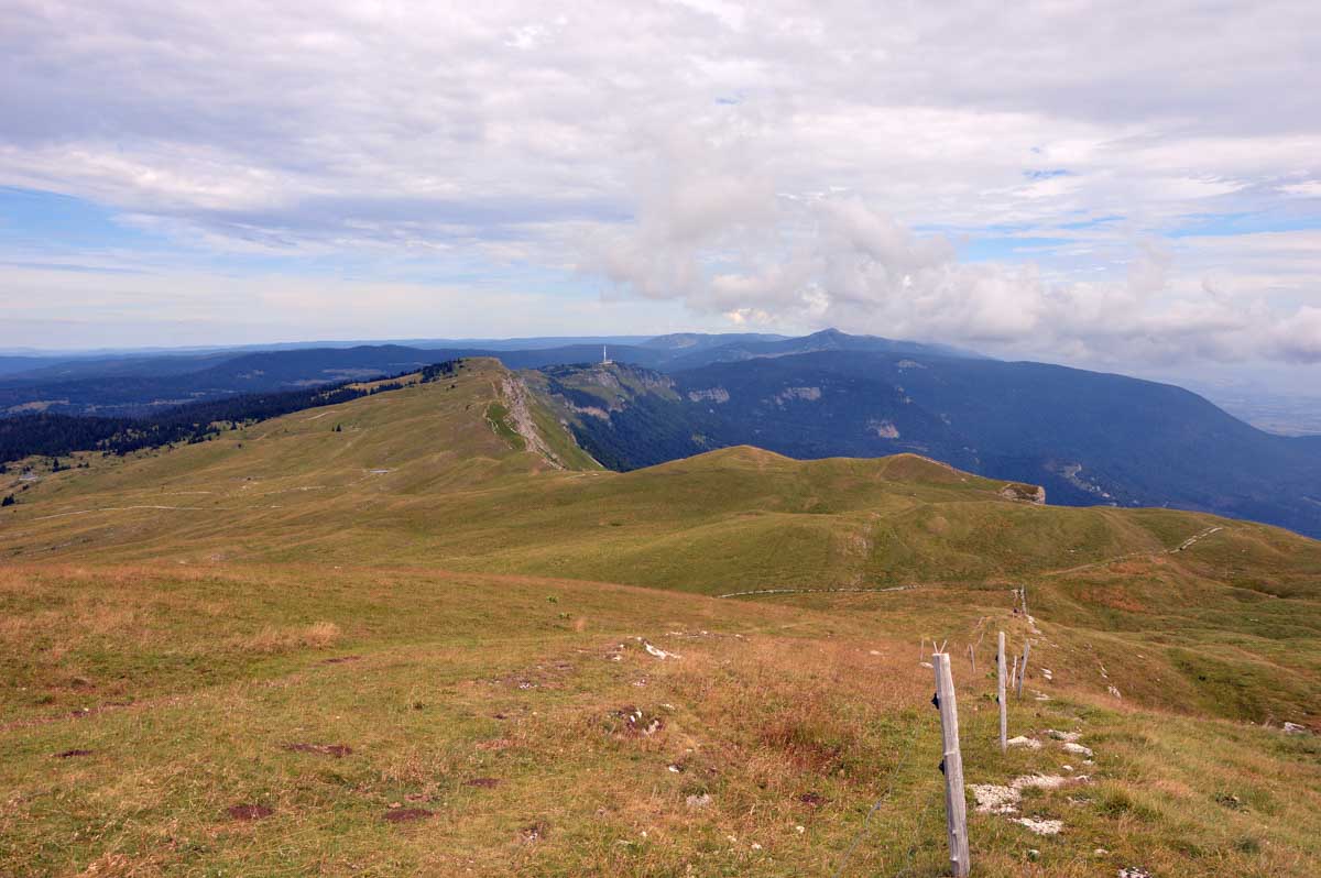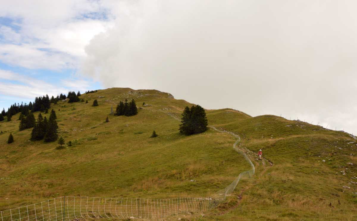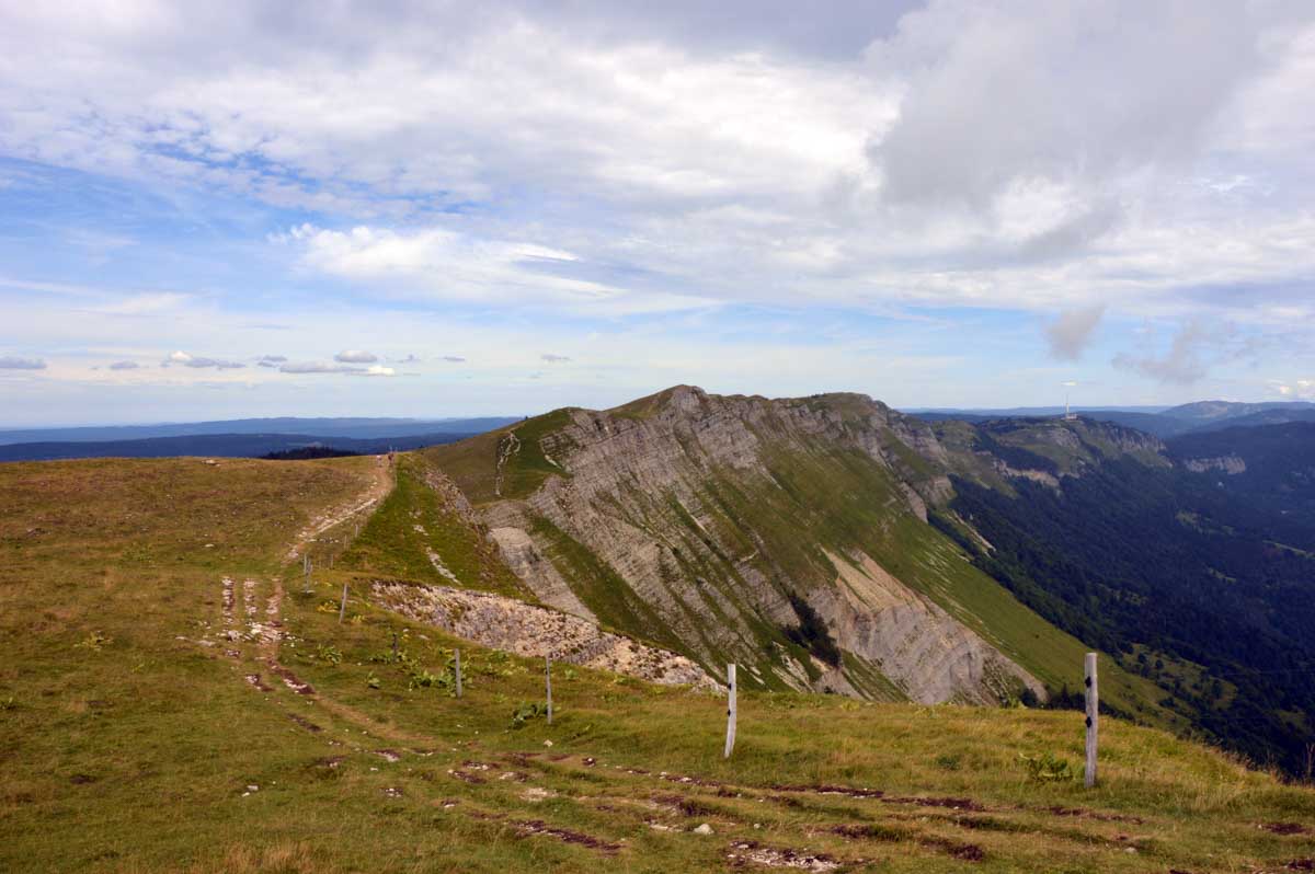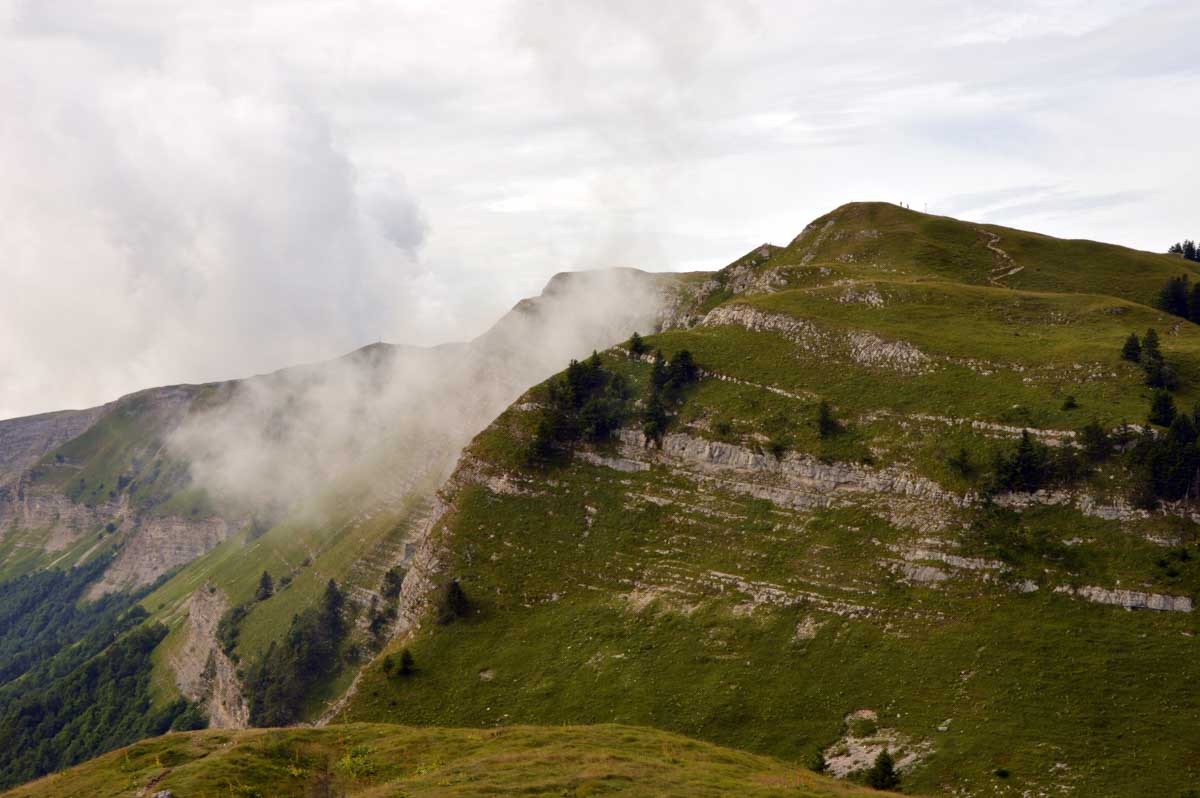 Tu montes, tu descends, tu montes, tu descends et à un moment tu es au Grand Montrond à 1614 mètres d’altitude, d’où tu vois le Petit Montrond à 1532 mètres mais personne n’y va, il y a une énorme antenne dessus. Et là tu redescends comme si tu voulais prendre de l’élan pour remonter, mais tu peux pas à cause des caillasses et de la terre humide. Et enfin, tu le vois, tu le vénères, tu l’adores car…
