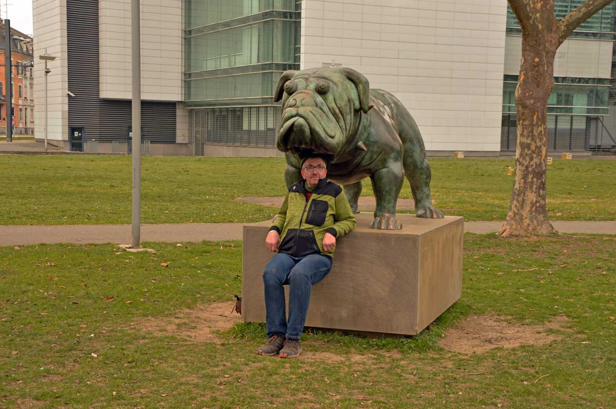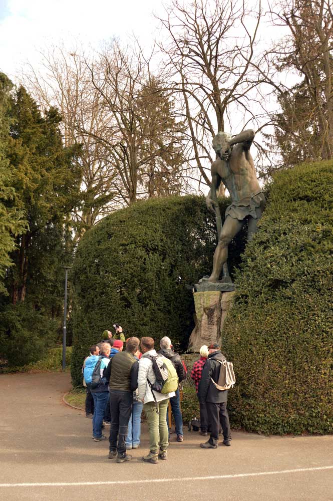 Puis ce sacré bonhomme, le Schweissdissi, moulé en Italie, montrait ses fesses à qui voulait les voir depuis 1906 Place de la Réunion, soit à l’évéché, soit à la mairie. Du coup, il a pudiquement été déménagé au Square du Tivoli en 1909. Je suis arrivée trop tard car depuis, ils ont planté une haie à l’arrière…