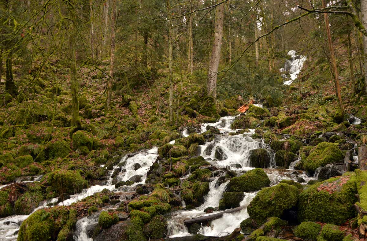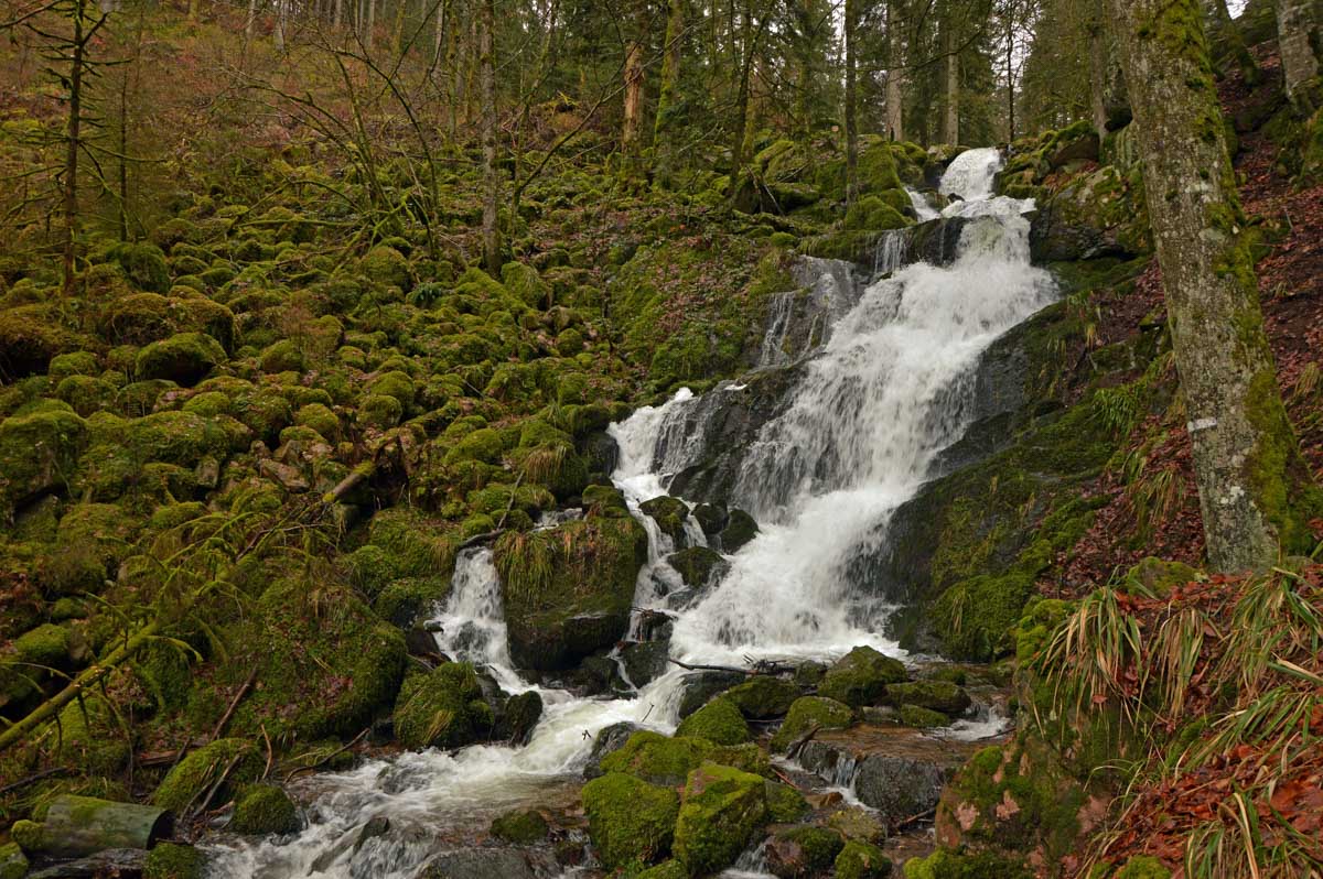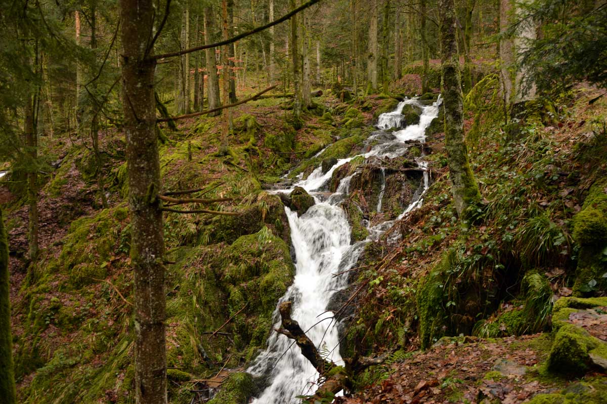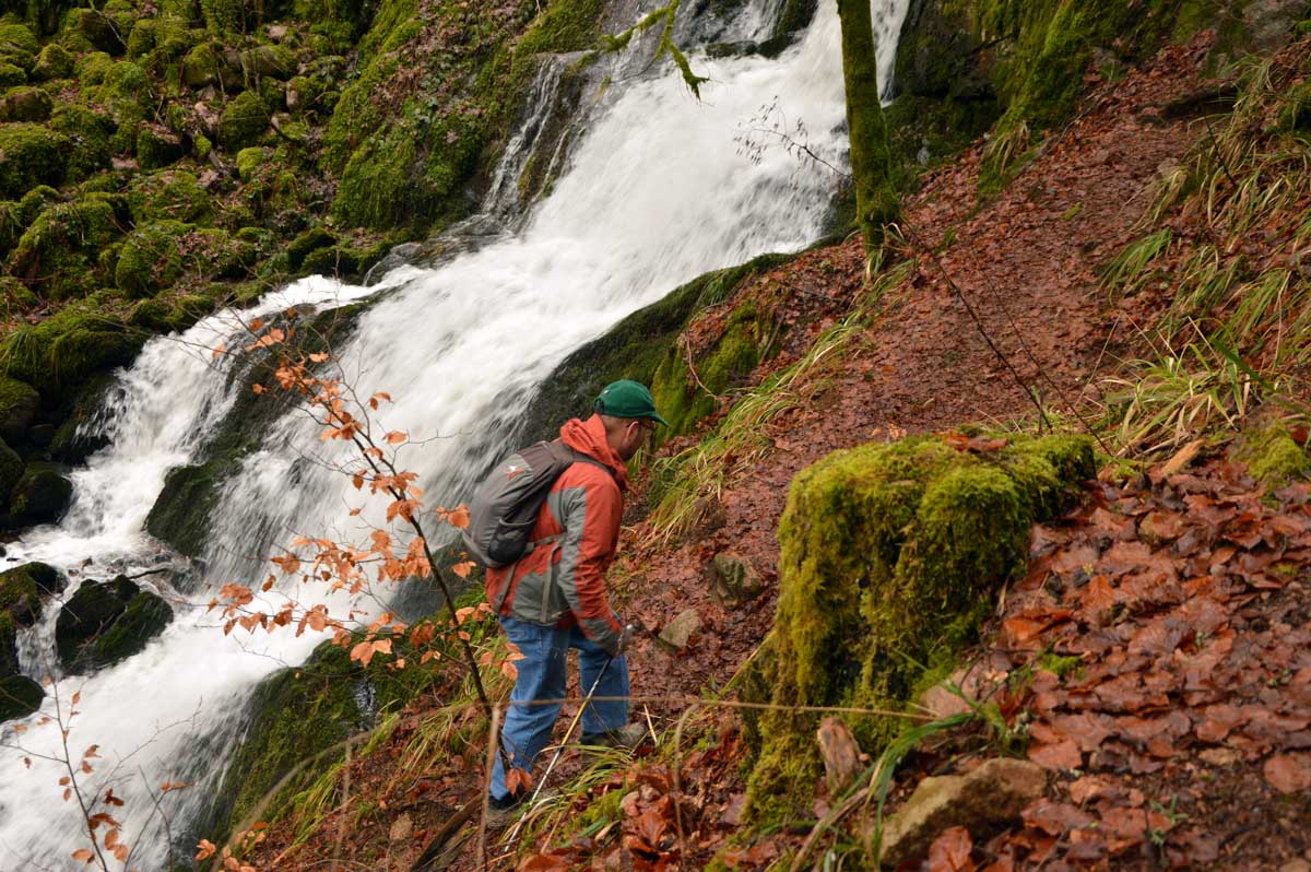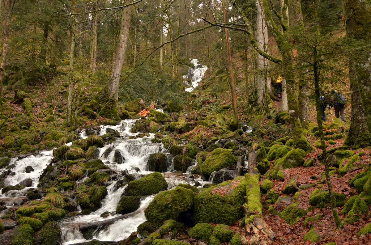 Donc j’ai pris mon courage à deux pieds et j’ai longé la Serva en montant alors qu’elle, elle descendait. Pas folle, la rivière ! Le jour où on fera un truc normal dans cette asso… bref j’ai pris sur moi jusqu’aux cascades de la Serva. Pleines d’eau, ça fait plaisir après les petits filets d’eau qu’on s’était habitués à voir en été en parlant de cascades. Là c’était une vraie cascade, puissante, débitante, virile quoi ! Le Niagara en moins américain et en plus vosgien.