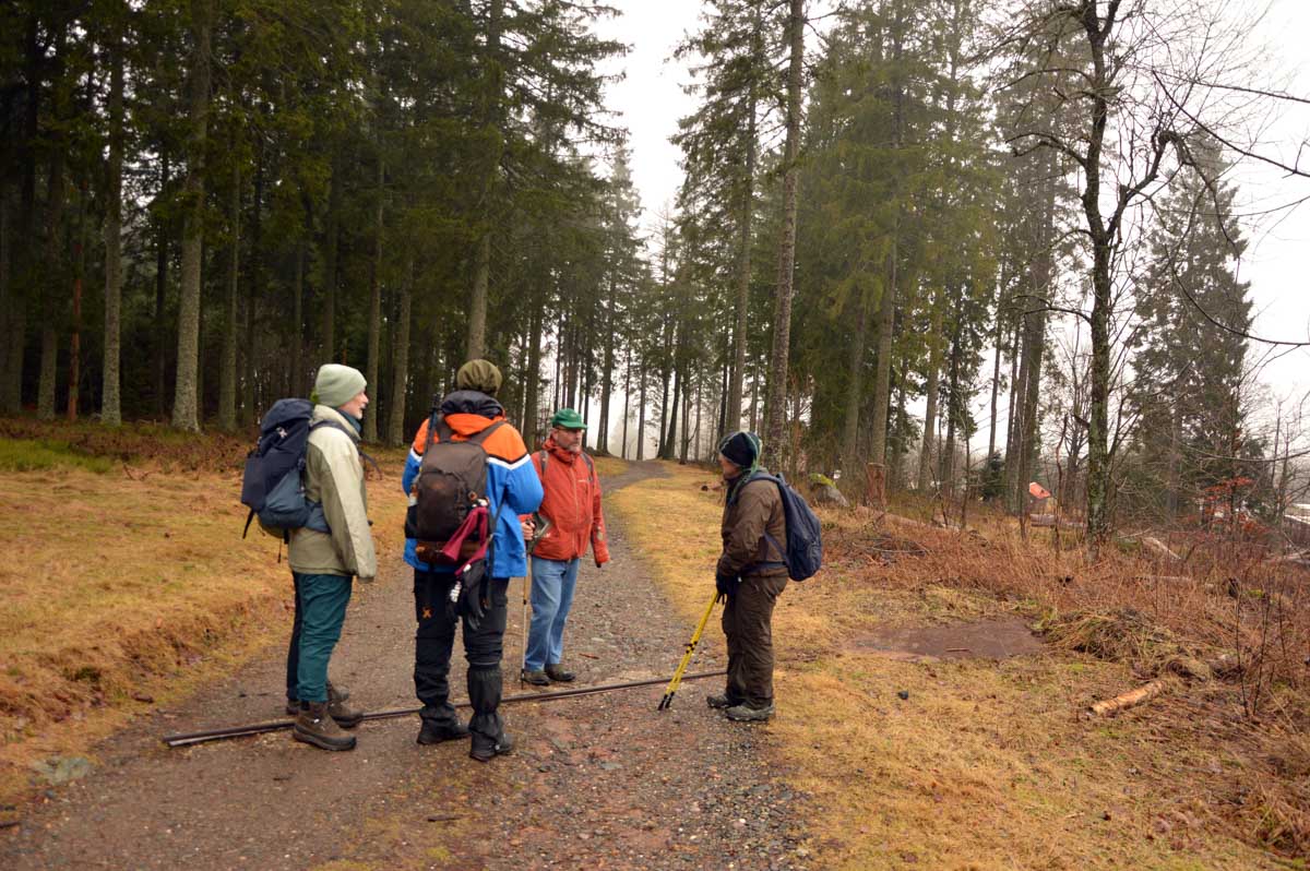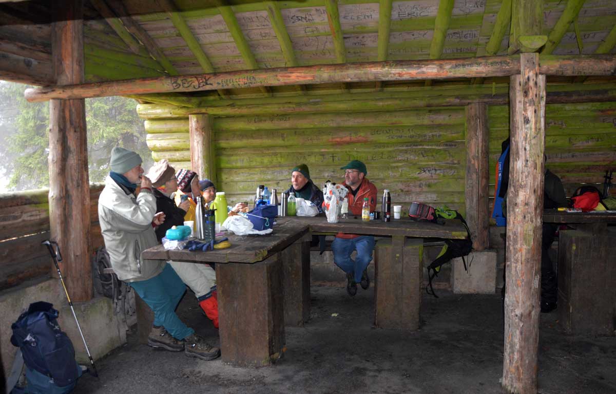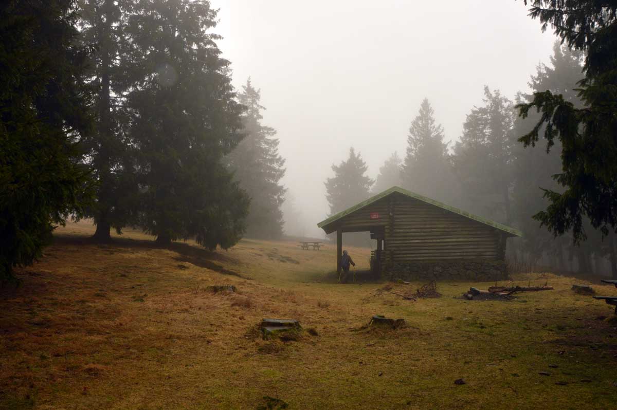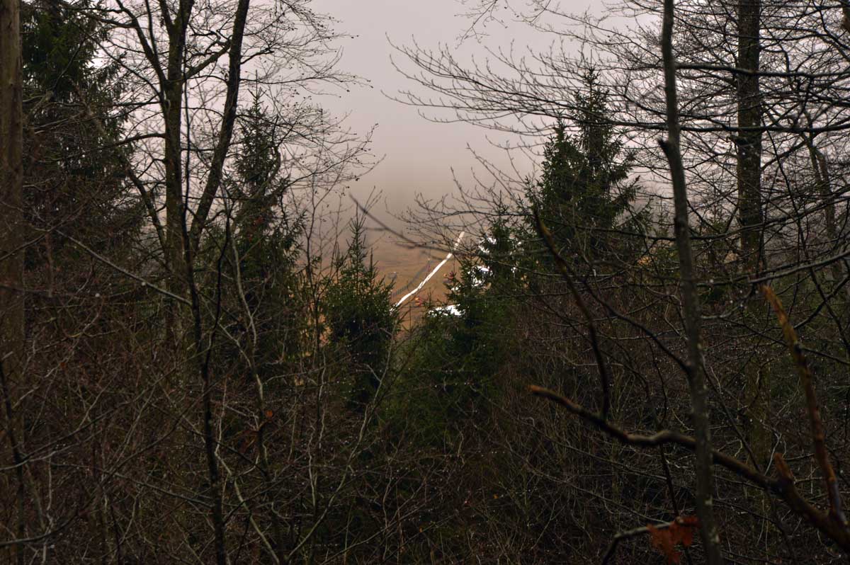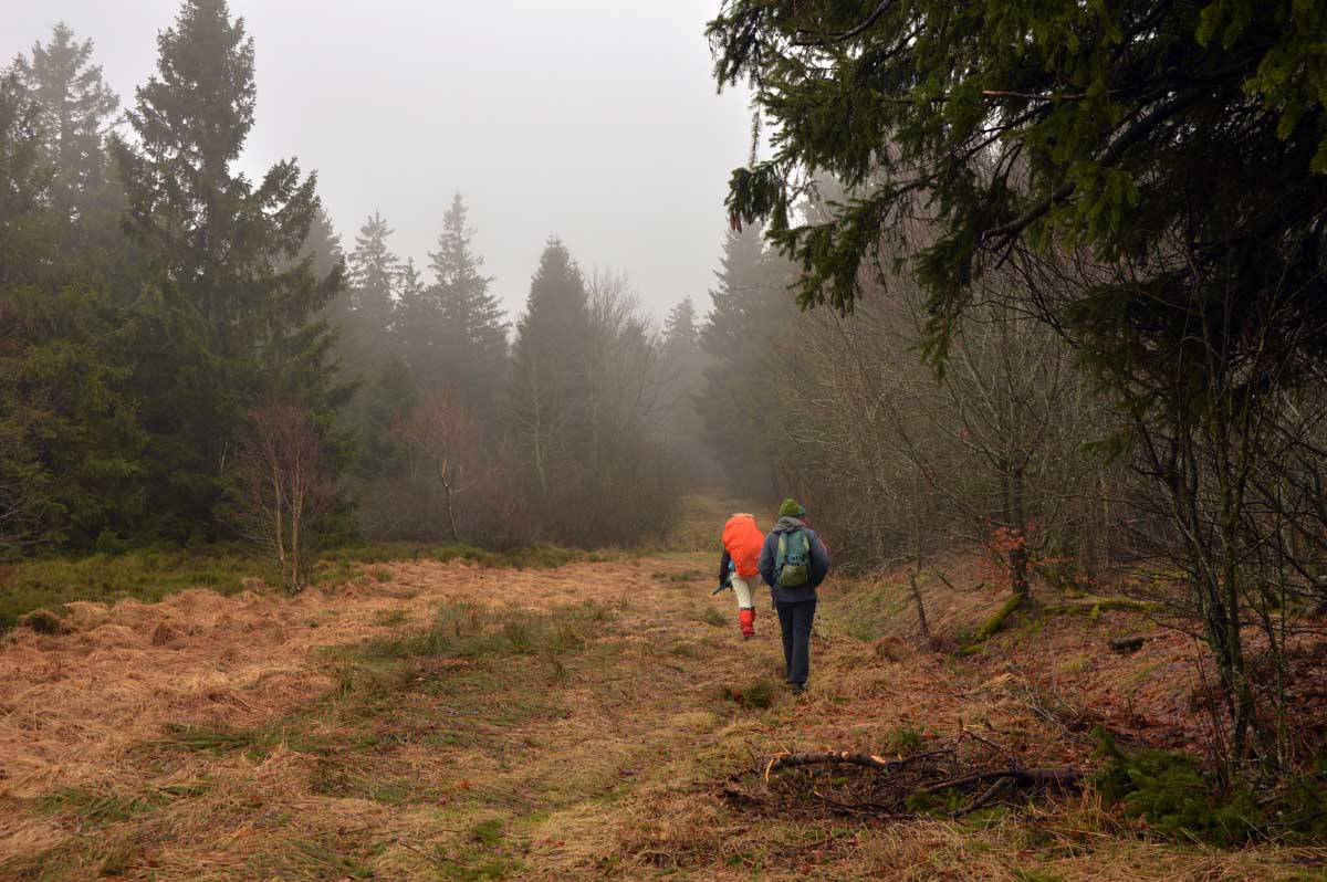 Bonne nouvelle, y’avait un abri là-haut, ce qui nous a évité de nous geler le tire-bouchon en ouvrant le pinard. Qui était bien frais, d’ailleurs ! Nous on était un peu moins frais après son absorption, mais comme il ‘agissait de tourner à peu de frais autour du Champ-du-Feu, sur le plateau, au frais, ça allait. Puis remarque, je risquais pas le vertige, vu le brouillard ! Finalement, voilà la descente cool pour revenir à Natzwiller et se prendre un café, tout en retrouvant la vue sur la Vallée.