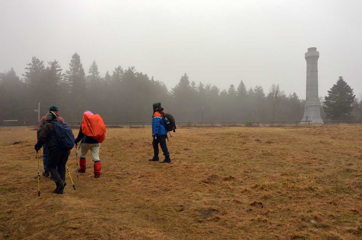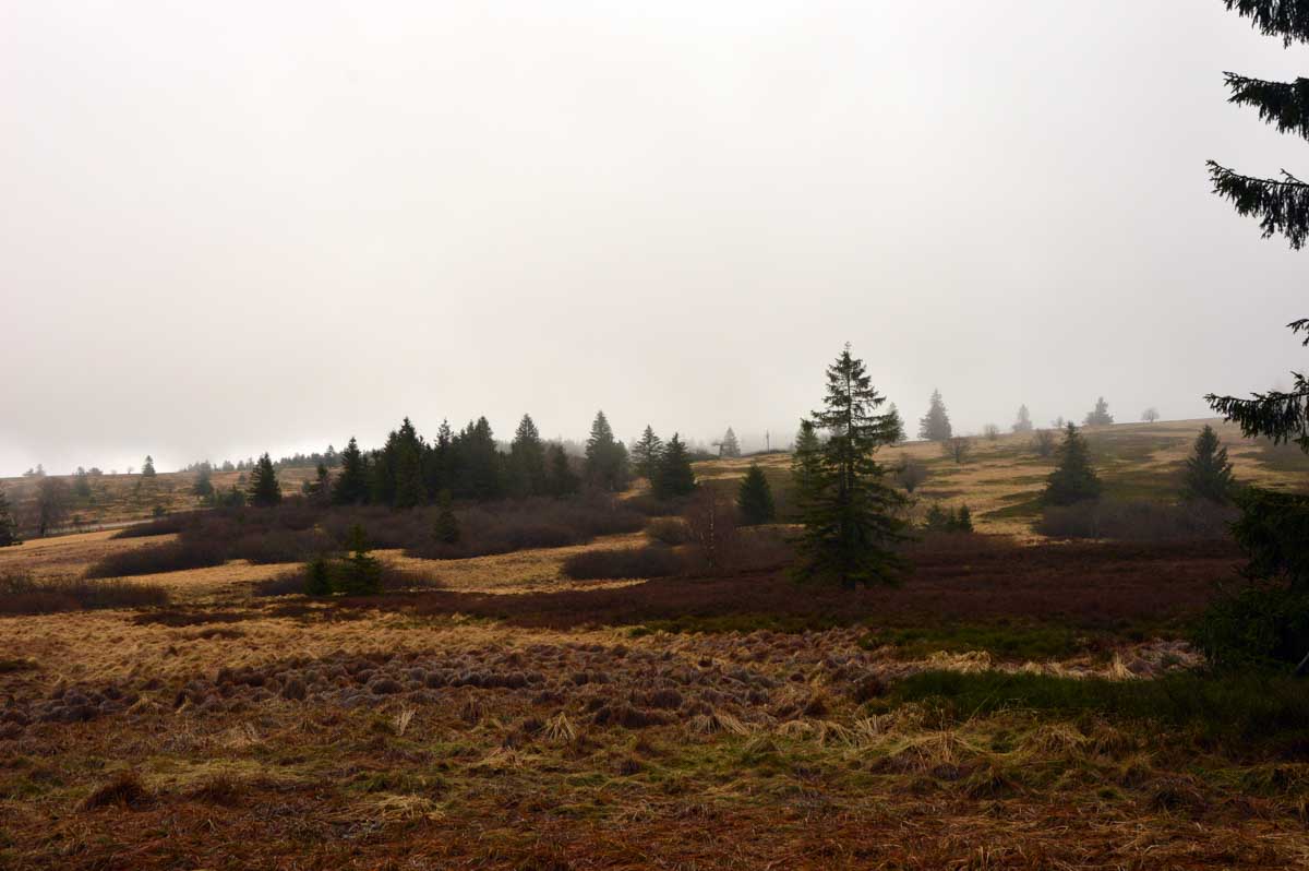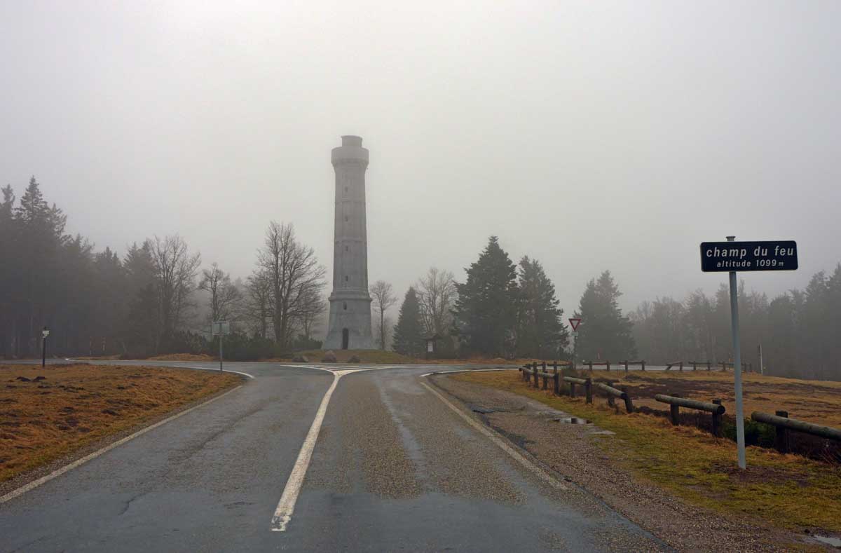 Donc j’en reviens au sommet du Bas-Rhin, le Champ-du-Feu. 1099 mètres. Ils n’auraient pas pu ajouter un peu de terre pour faire un chiffre rond ? Non… Juste une tour tellement blanche qu’on la voyait à peine dans le brouillard. Ah oui, parce que pour la vue, on repassera… Je vais t’y amener quelques brouettes de terre et on y arrivera, aux 1100 mètres ! Et la prochaine fois, on verra toute l’Alsace !