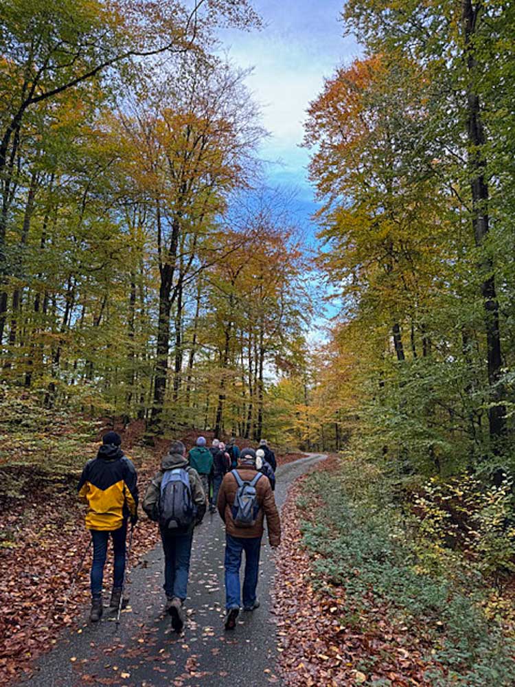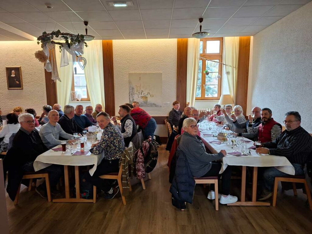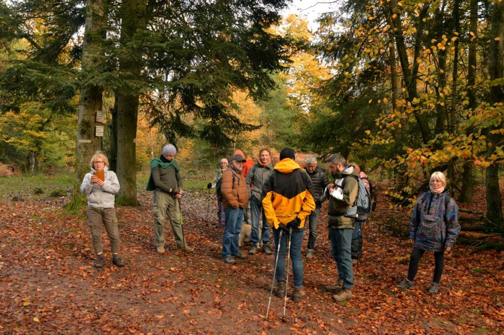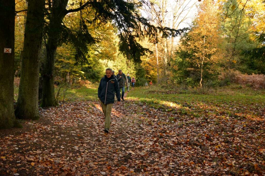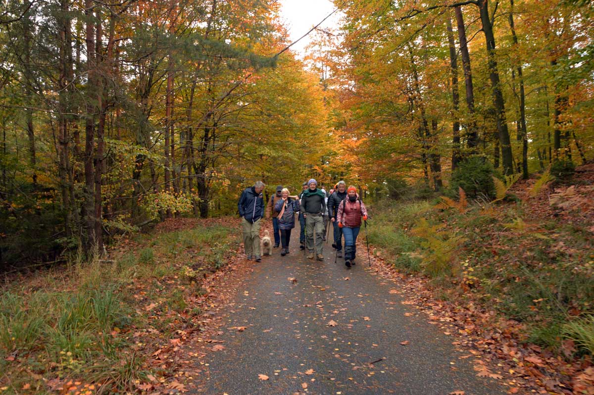 Assemblée Générale Extraordinaire (enfin moi j’ai trouvé ça plutôt banal), puis Assemblée Générale Ordinaire (ça se confirmait) et là j’ai commencé à ressentir une urgence physiologique. Les cafés commençaient à en avoir marre de côtoyer la baguette et il a fallu les éliminer. A peine je revenais dans la salle, hop, relevage de la Karina pour un nouveau tour aux commodités. Lorsqu’enfin la tuyauterie m’a laissée tranquille, l’AG était finie alors je sais pas trop ce qui s’est raconté mais on est allés manger et devine quoi ? Faire une promenade ! Ben tiens, on est une asso de rando, qu’ils disent. Alors pas question de se prélasser dans un fauteuil avec un bon digeo, non, non, faut aller marcher. J’en peux plus moi, de marcher ! Deux heures de balade vers le Michelskopf et son point de vue sur la plaine avec toujours les feuilles jaunes. Faudra un jour que je convertisse tout ça en calories dépensées, tiens. Et bien sûr en montagne. Pouvaient le construire en plaine, leur couvent ! A l’époque, Sainte-Karina-Iris au moins, édifiait ses habitations sur du plat, près des houblonnières ou éventuellement dans les vignes !