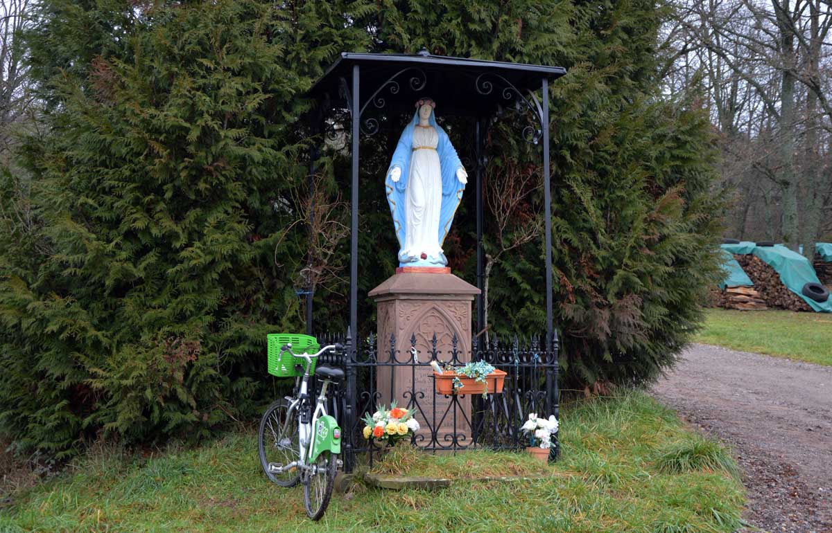 N’empêche que quand t’as vu une vierge, tu… Pas celle-là ! Celle à la sortie d’Urmatt, avec le vélo dans le champ de vision, elle est originale sous son petit abri en ferronnerie. C’est tout de même assez rare.