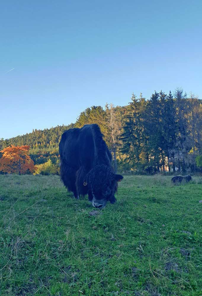 Accueil en fanfare au Rain-des-Chênes par une jeune femelle yak de deux mois et demi aussi turbulente que sociable, dont la passion semble être de courser les cyclistes et de se faire gratouiller par les randonneurs. Oui ? une question ? Comment s’appelle le petit d’un yak ? Aucune idée, alors la femelle c’est une yakette et le petit un yakon. Voilà.