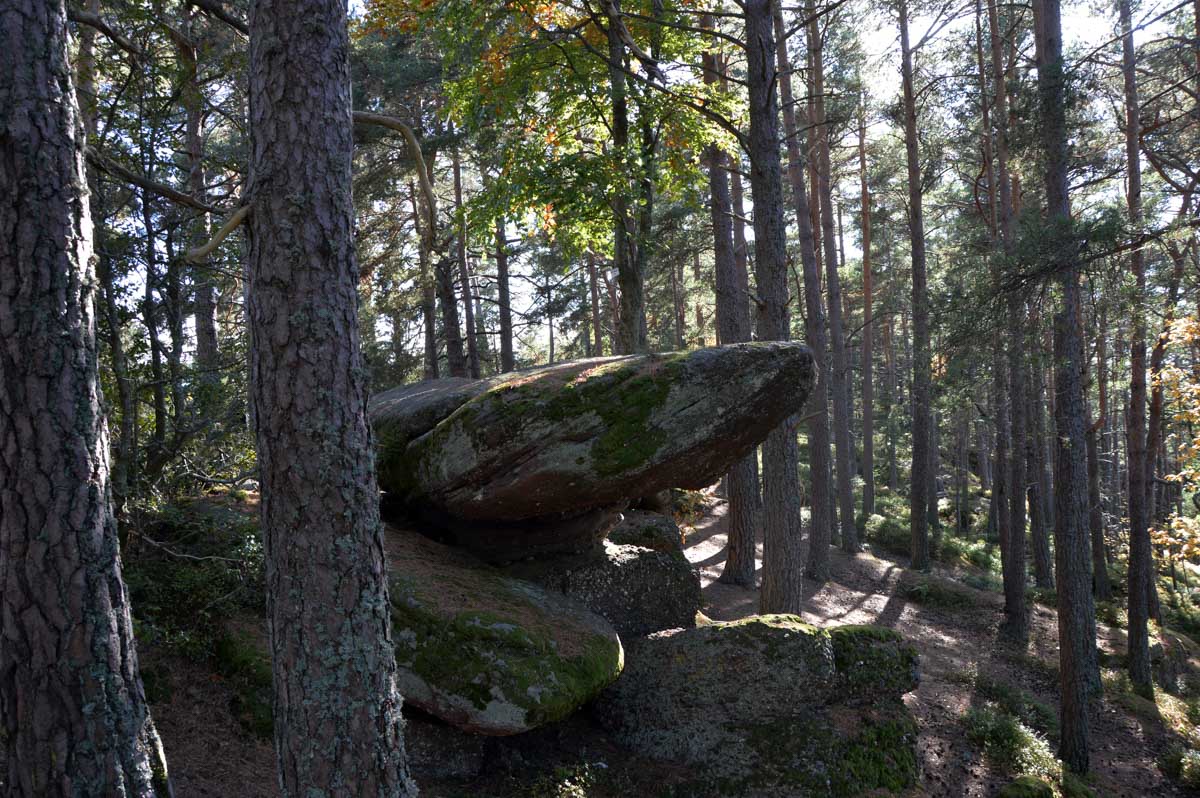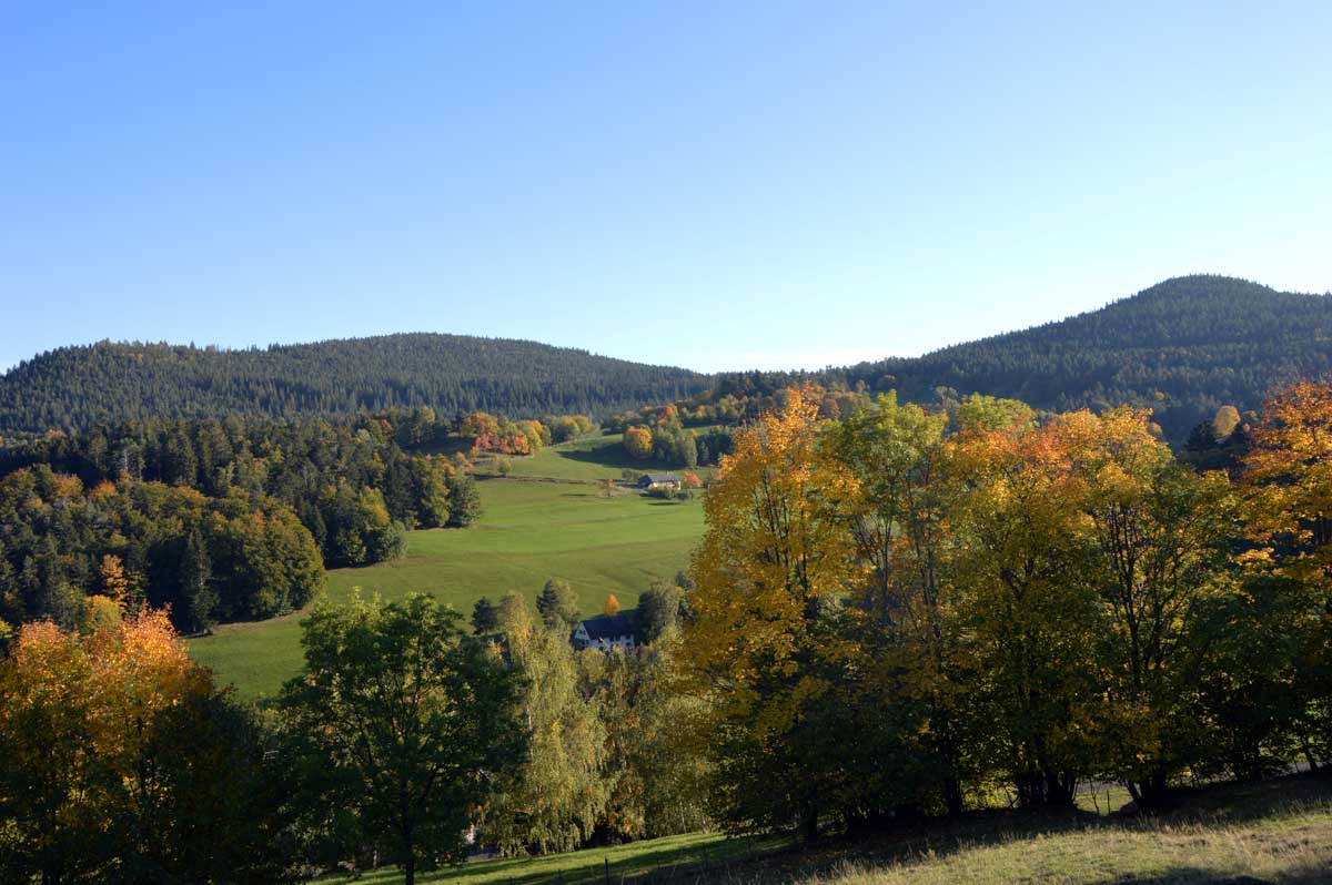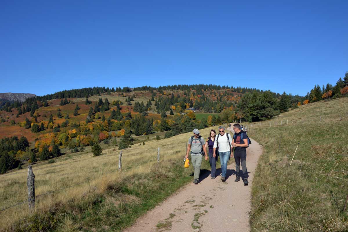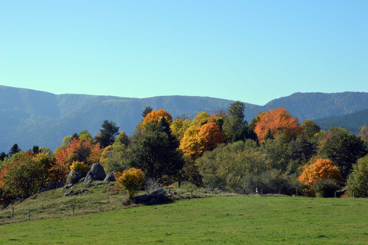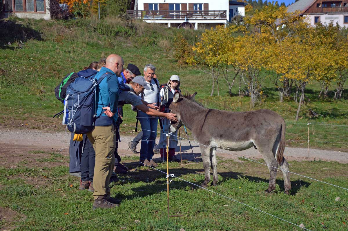 Alors superbe lumière d’automne par les Hautes-Huttes jusque sur la crête pour découvrir des rochers dont la Pierre Branlante, qui rappelle un peu… Excusez, le même pointilleux a une objection. On t’écoute ? Ah c’est la Pierre Tremblante ? Bon, au final c’est pareil, non ? C’était bien la peine d’intervenir. Du coup j’en étais où ? On marchait dans un superbe paysage automnal et l’autre m’a perturbé avec sa pierre dont on ne sait pas si elle frissonne ou pas. Bref donc, la forêt ici est particulière, avec ses arbres pas très hauts et ses fougères toutes jaunes. Quelques vaches, des chevaux et des ânes nous ont salués avant que… Quoi encore ? Une pointilleuse cette fois, oui on t’écoute !