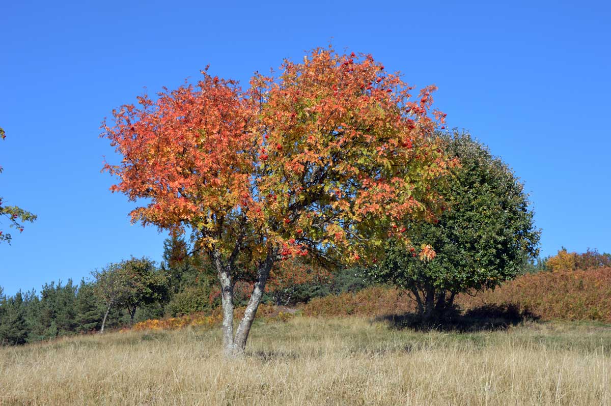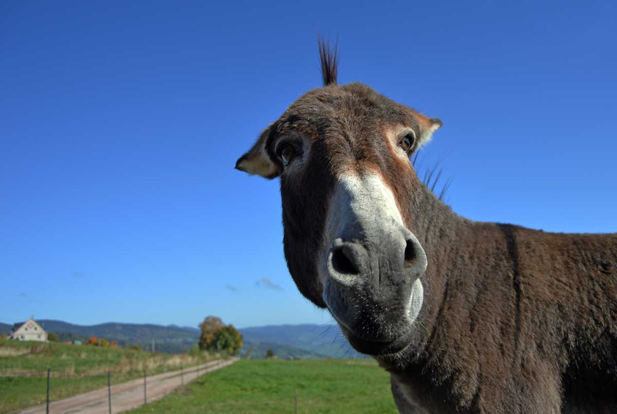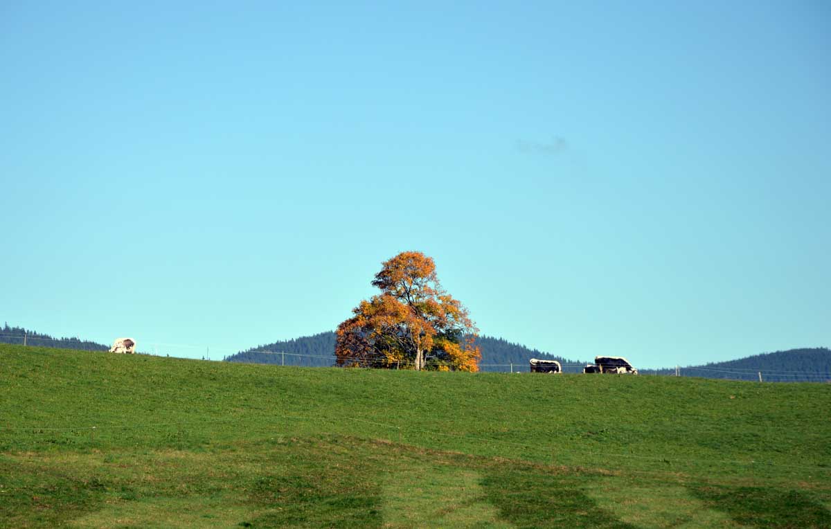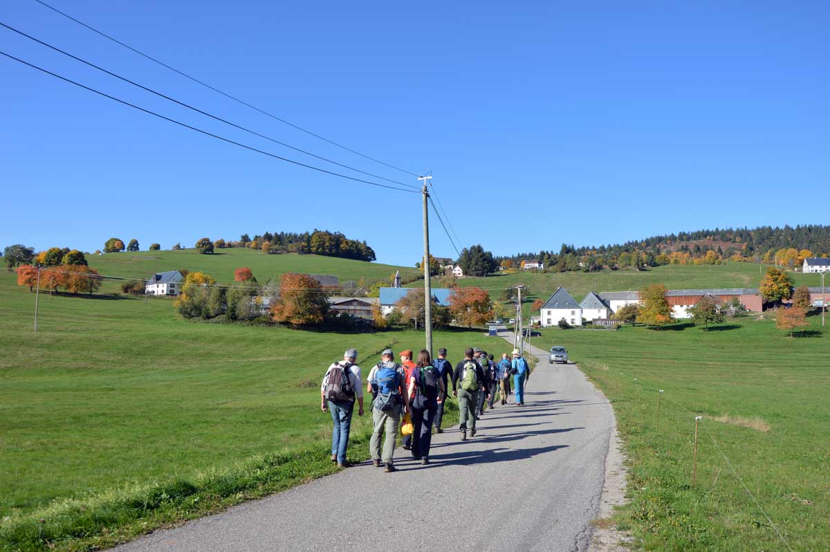 Alors superbe lumière d’automne par les Hautes-Huttes jusque sur la crête pour découvrir des rochers dont la Pierre Branlante, qui rappelle un peu… Excusez, le même pointilleux a une objection. On t’écoute ? Ah c’est la Pierre Tremblante ? Bon, au final c’est pareil, non ? C’était bien la peine d’intervenir. Du coup j’en étais où ? On marchait dans un superbe paysage automnal et l’autre m’a perturbé avec sa pierre dont on ne sait pas si elle frissonne ou pas. Bref donc, la forêt ici est particulière, avec ses arbres pas très hauts et ses fougères toutes jaunes. Quelques vaches, des chevaux et des ânes nous ont salués avant que… Quoi encore ? Une pointilleuse cette fois, oui on t’écoute !