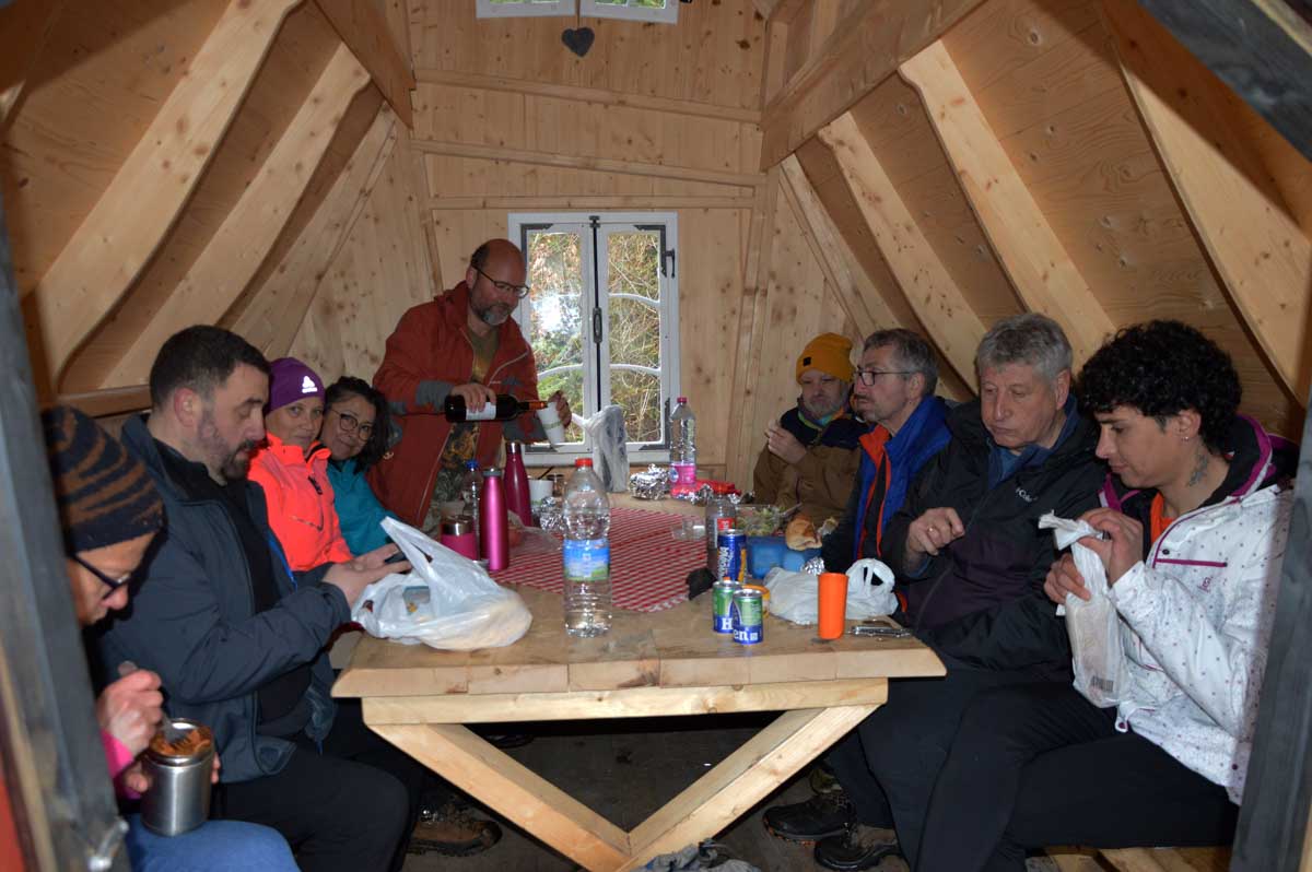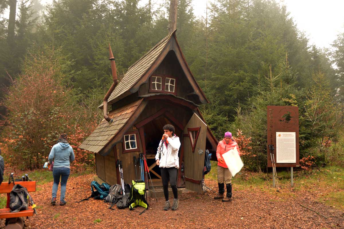 L’objectif était la maison de la sorcière, plantée dans une clairière comme si on venait de l’arracher à un conte. La sorcière doit souvent faire le ménage car l’intérieur est très propre et nous a permis de manger à l’abri. Remarque, vue la taille de son balai, j’suis pas étonnée. Nous étions en plein sur le Hexentanzplatz, la place où dansent les sorcières. Frissons garantis non parce que nous avions peur, mais parce qu’il faisait plutôt froid.