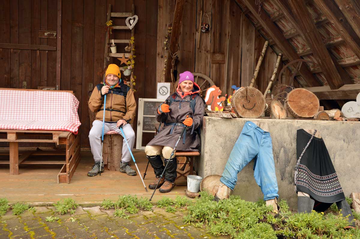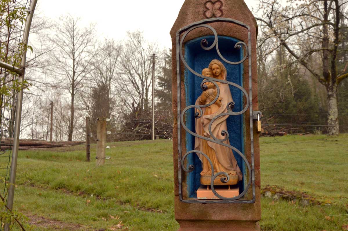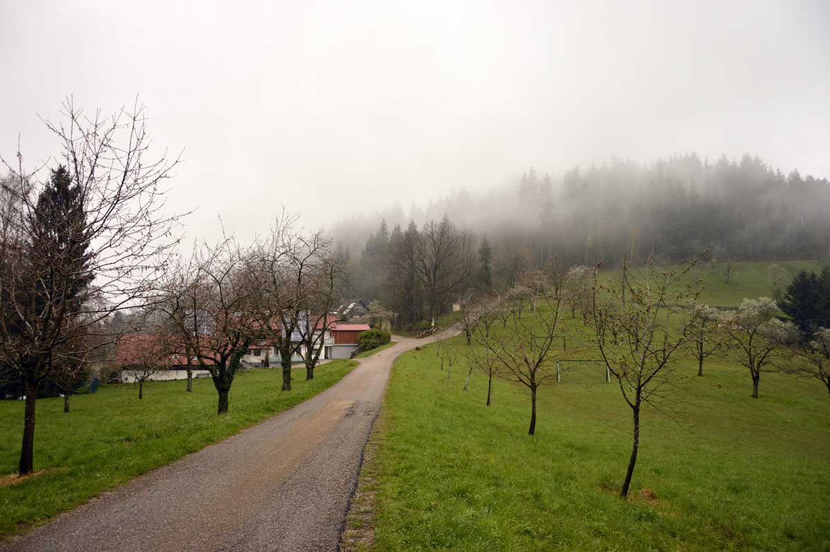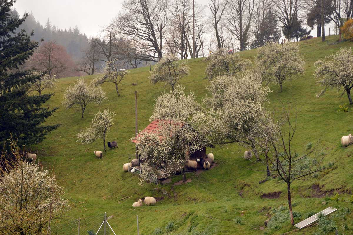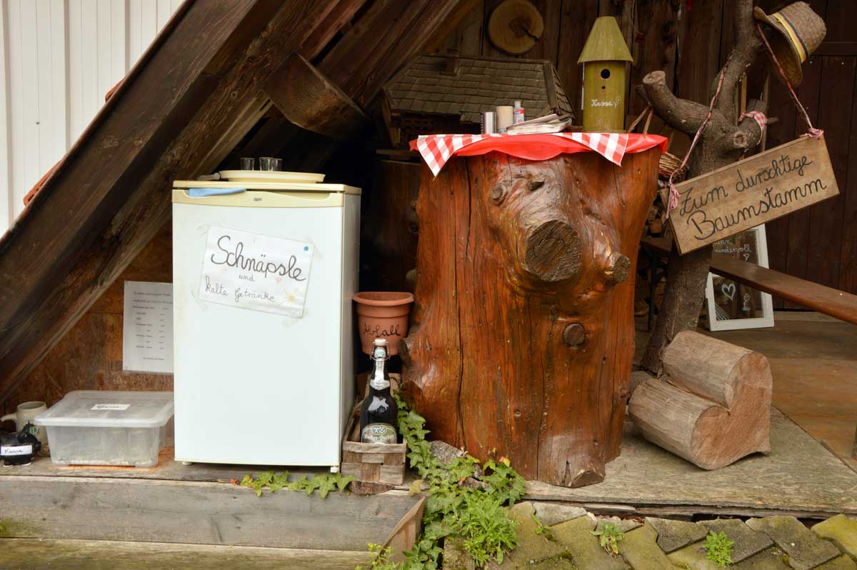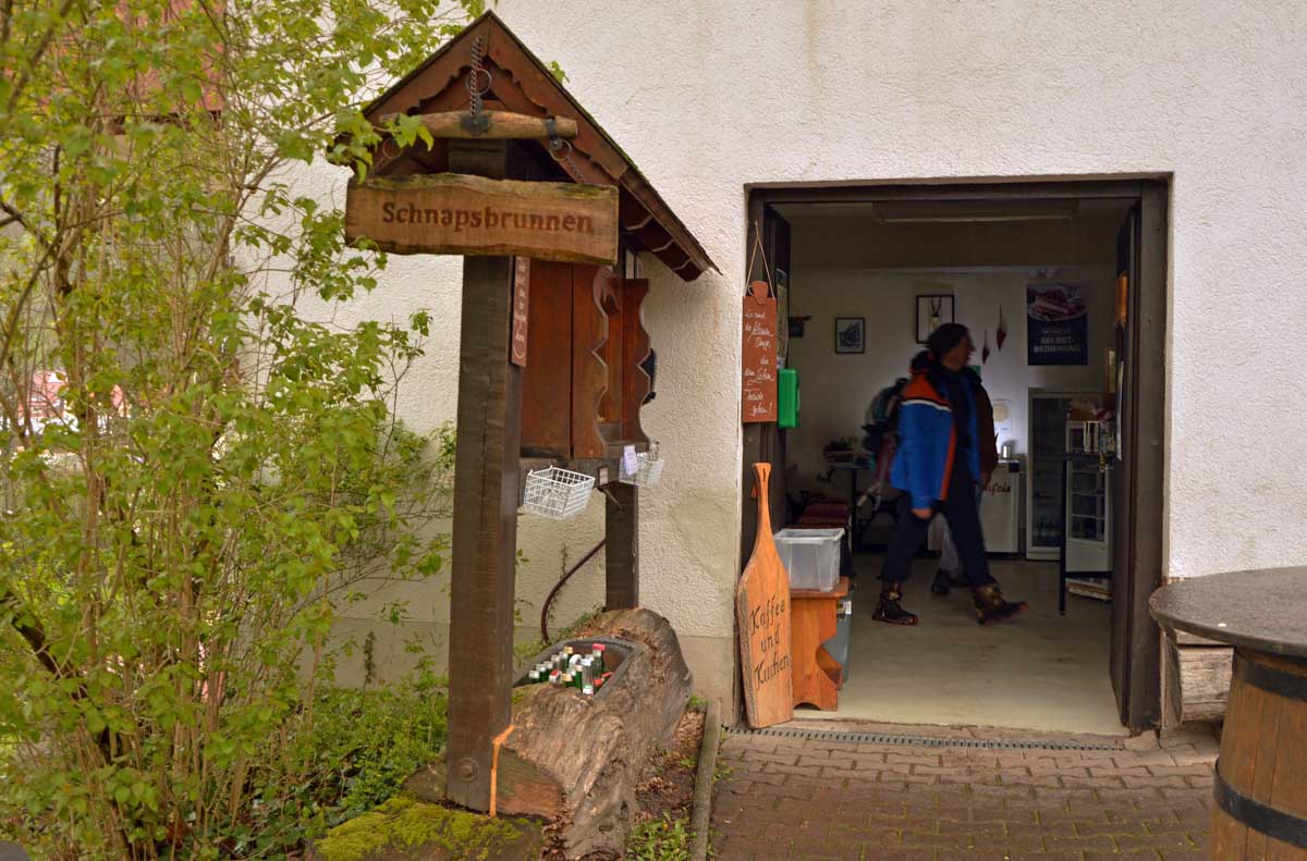 Dans cette région ensorcelée, nous pensions qu’on allait nous tendre la pomme de laquelle nous nous serions méfiés, poison oblige, mais pas du tout ! Nous sommes en Forêt-Noire et la tentation est venue des boissons variées, du miel, des plats de charcuterie et bien entendu du Kaffee-Kuchen, le tout au fil des Schnapsbrunnen, les fameuses fontaines à schnaps. On se sert, on met la somme annoncée dans une petite caisse, et déguste, Auguste !