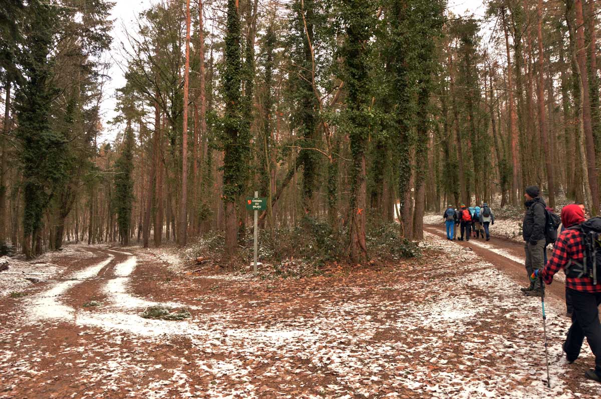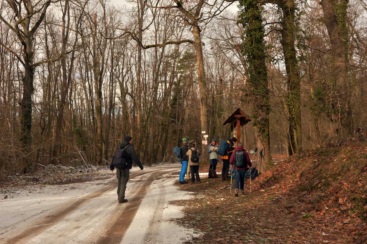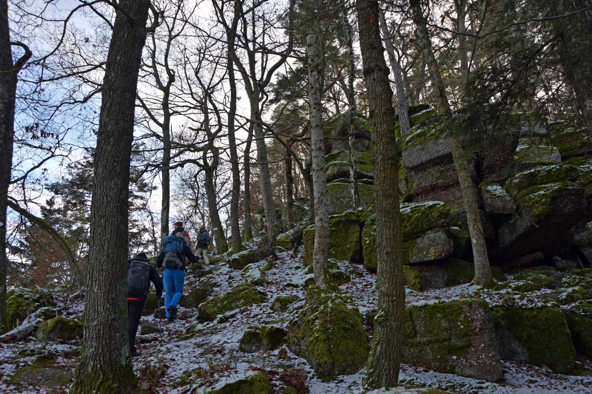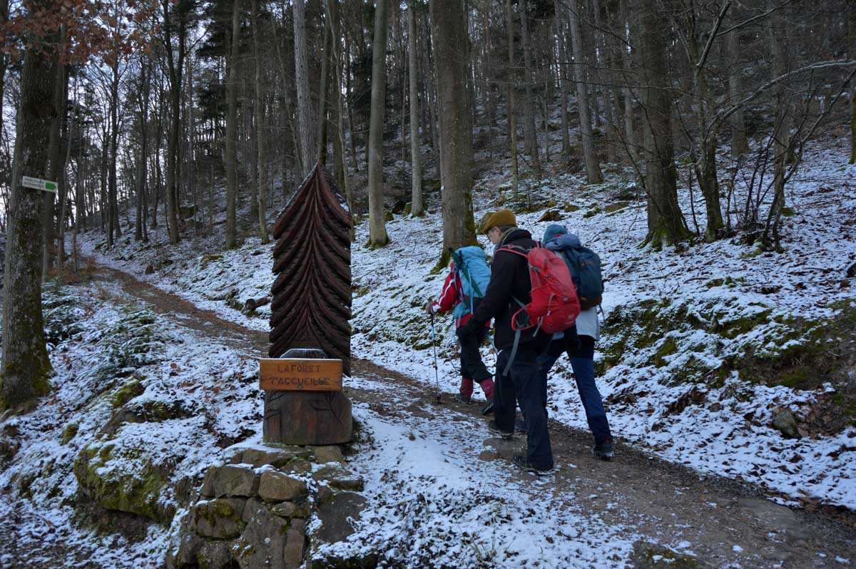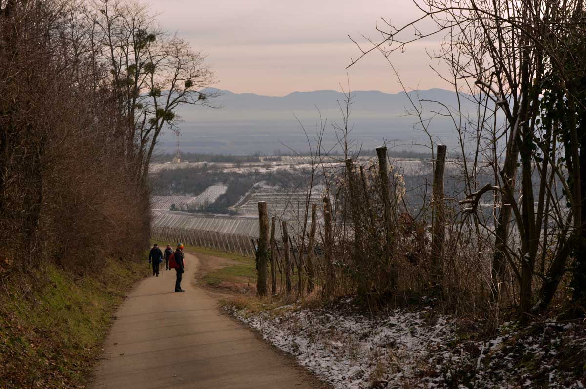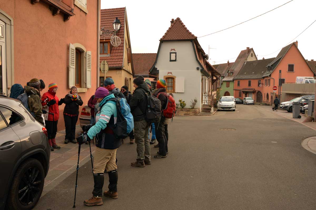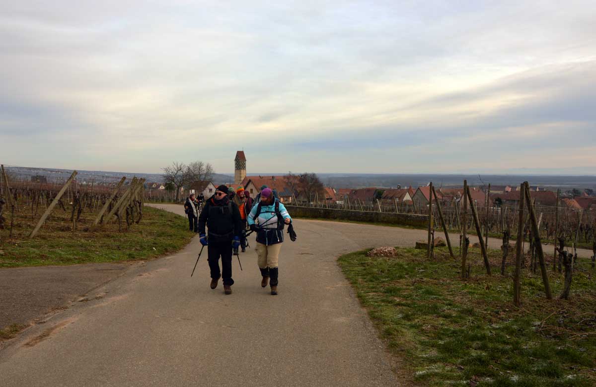 Au départ de Pfaffenheim, nous nous promenâmes au travers des vignes engourdies par le gel, nous humâmes l’air glacé et nous enfouîmes nos mains gantées au fond de nos poches. Bref on se caillait les miches et on se chauffait en bénissant la montée. C’était beau cela dit, le sol givré voire enneigé, le soleil, et une belle ambiance dans le groupe. On était treize, mais on n’allait quand même pas en refuser un pour être douze, ou embarquer un vigneron égaré pour nous retrouver à quatorze (encore que pour le vigneron…). Alors hop courage, on a évité de passer sous une échelle ou de croiser un chat noir, et ça a été.