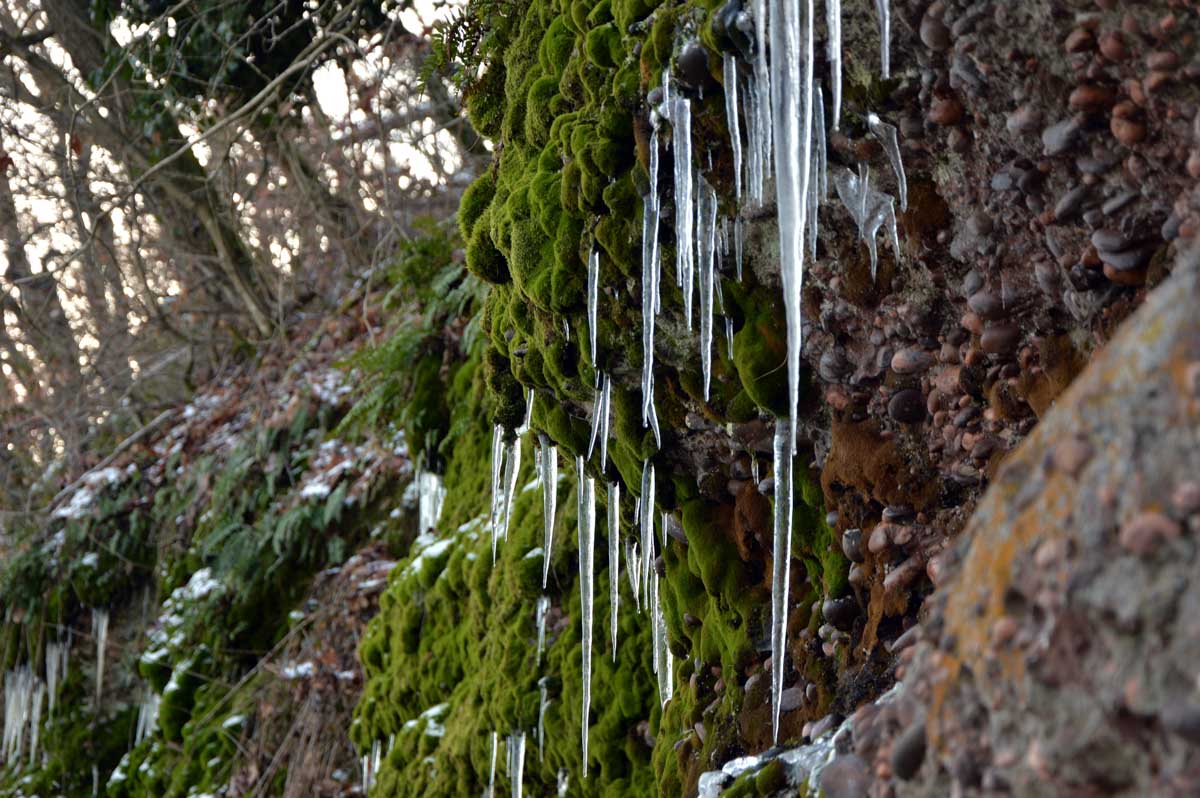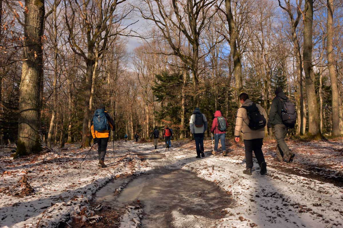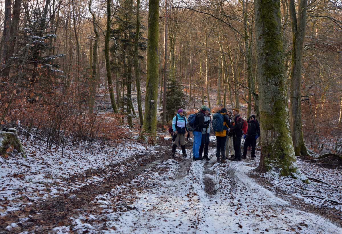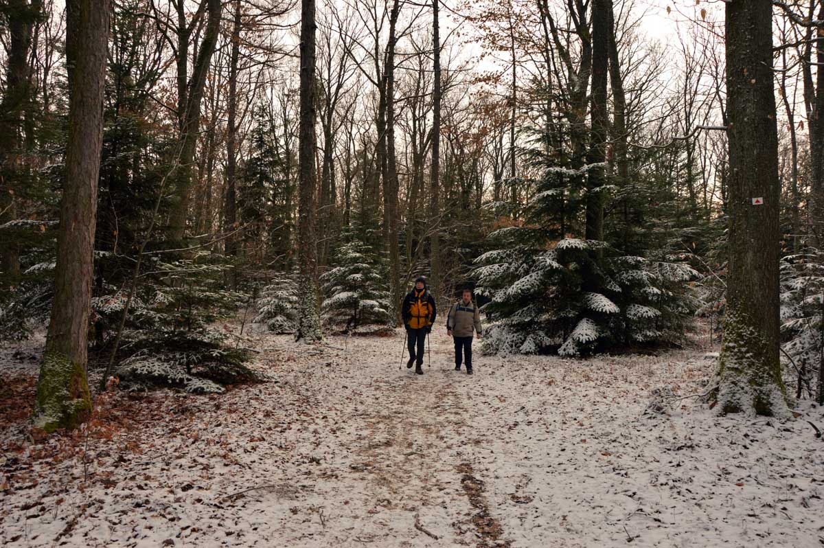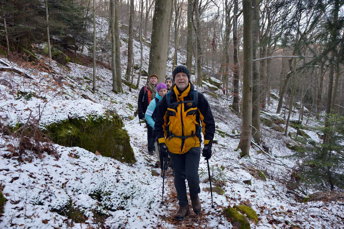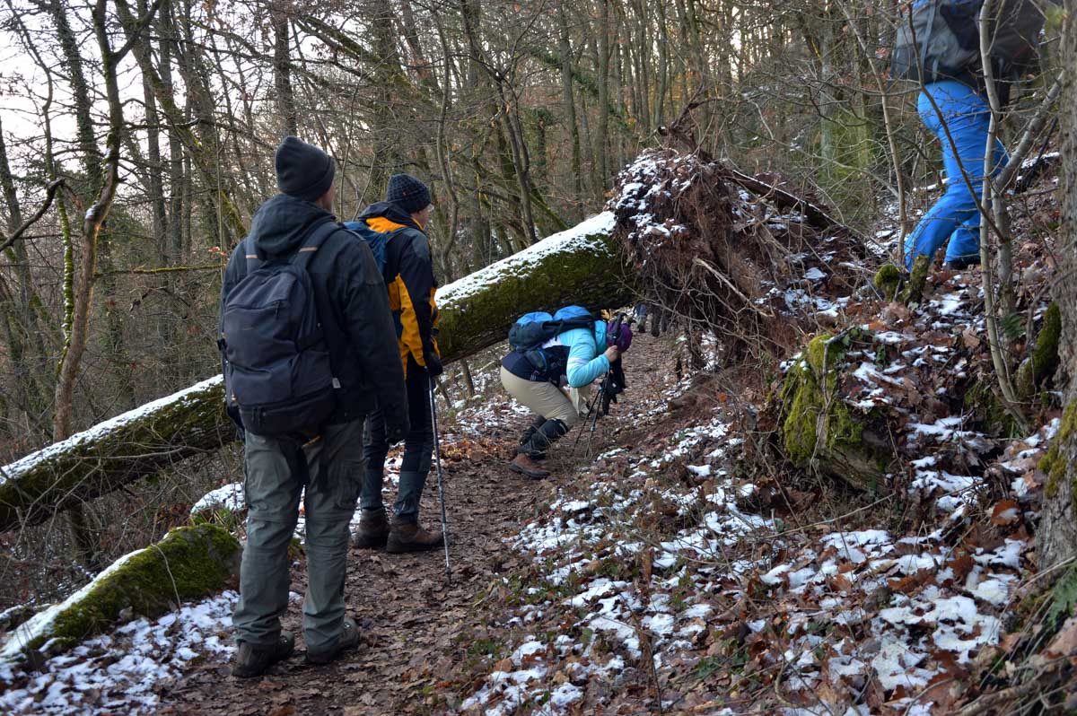 Au départ de Pfaffenheim, nous nous promenâmes au travers des vignes engourdies par le gel, nous humâmes l’air glacé et nous enfouîmes nos mains gantées au fond de nos poches. Bref on se caillait les miches et on se chauffait en bénissant la montée. C’était beau cela dit, le sol givré voire enneigé, le soleil, et une belle ambiance dans le groupe. On était treize, mais on n’allait quand même pas en refuser un pour être douze, ou embarquer un vigneron égaré pour nous retrouver à quatorze (encore que pour le vigneron…). Alors hop courage, on a évité de passer sous une échelle ou de croiser un chat noir, et ça a été.