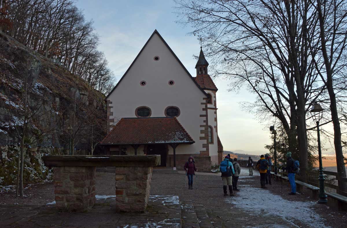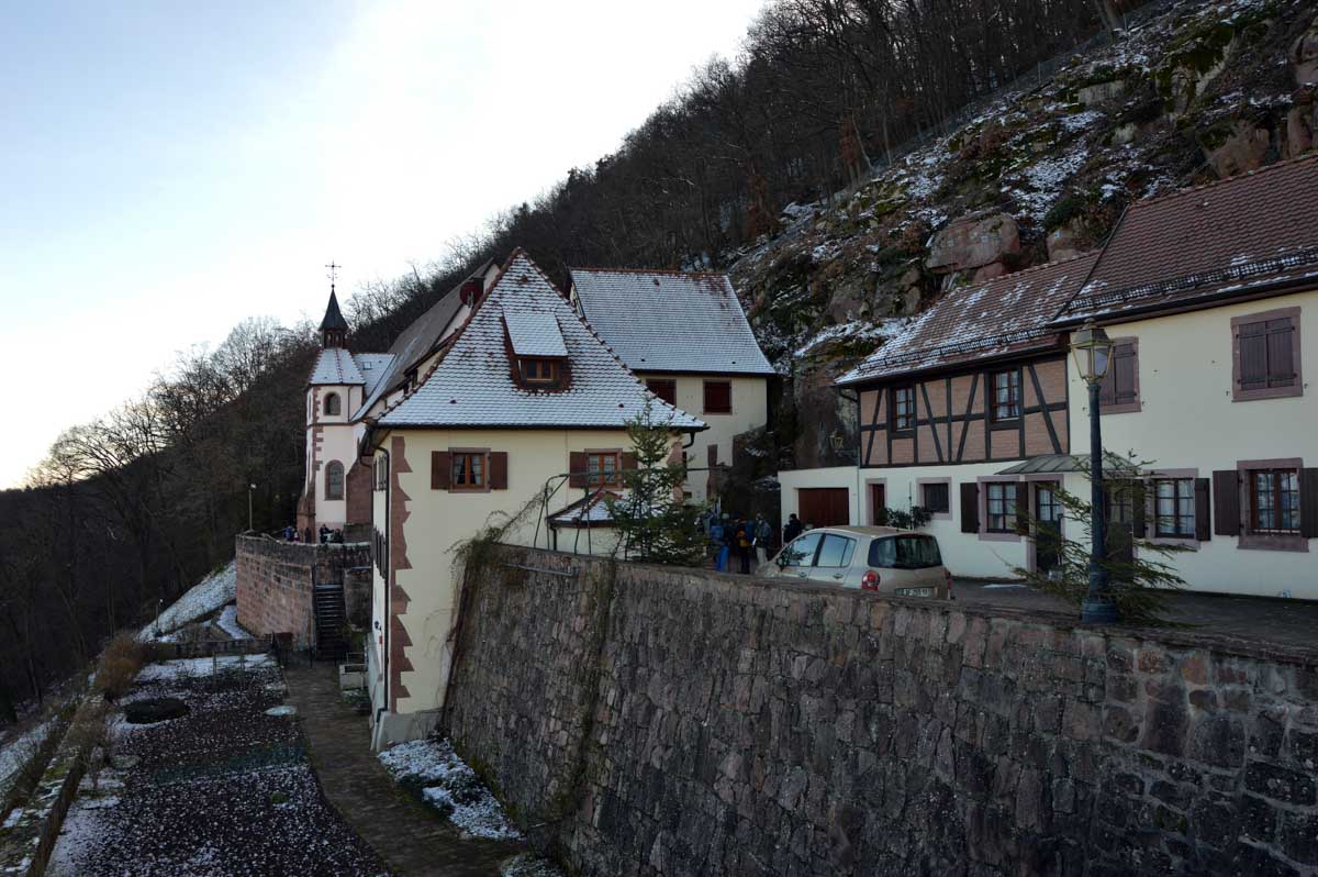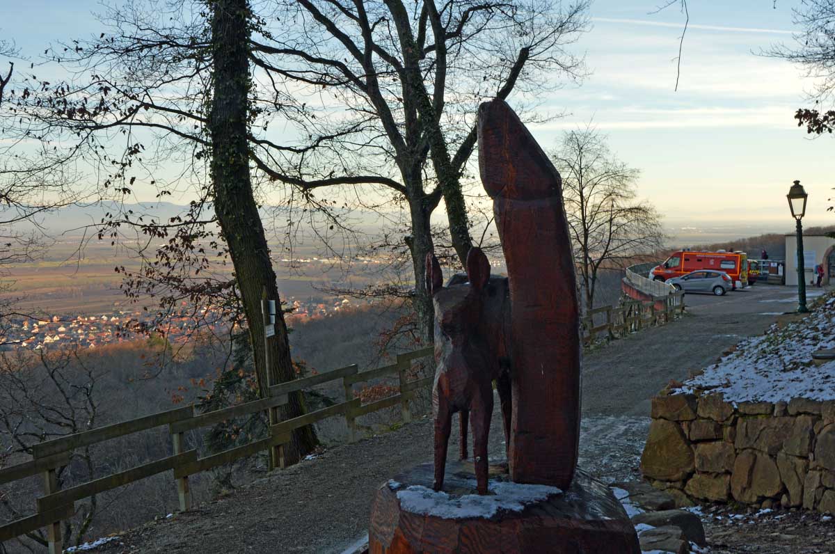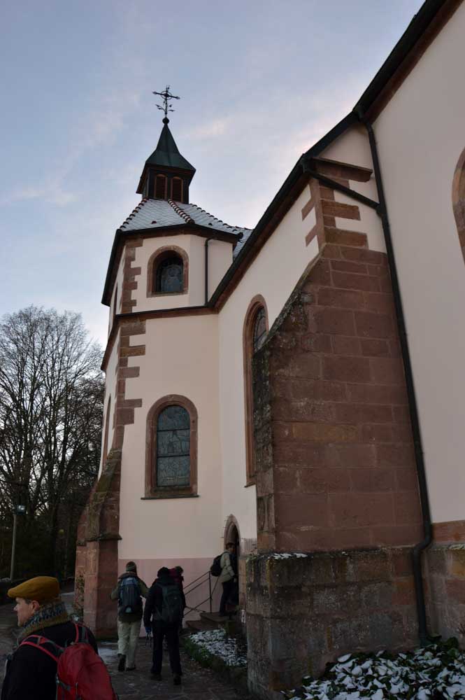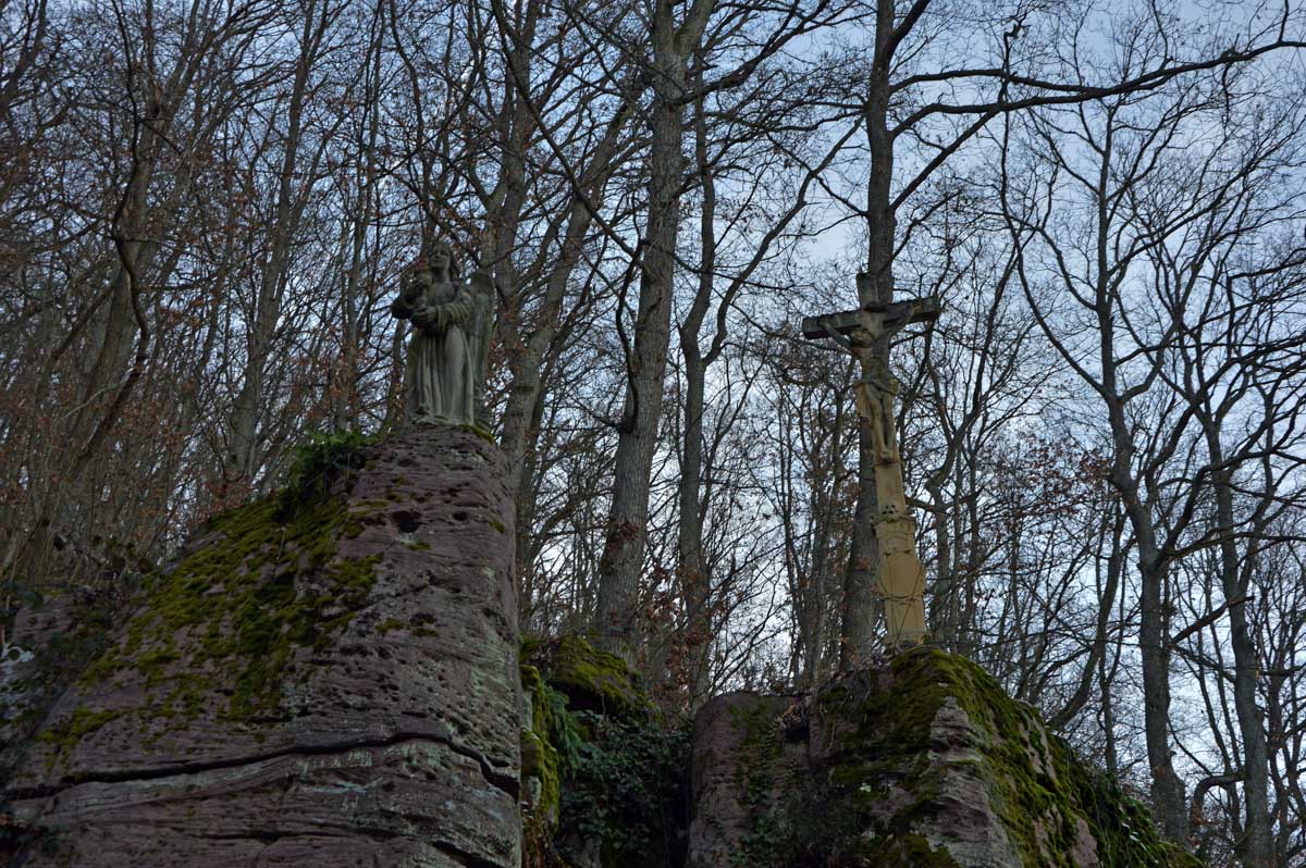 En pratique, je me suis gelé la zone australe sur le rocher, j’ai eu le pantalon trempé en convertissant le givre en eau, et je suis rentrée avec une cystite. Elle est belle l’énergie du haut-lieu, à mon avis les druides avaient déjà tout épuisé ! Heureusement je me suis réconfortée avec un chocolat chaud chez les sœurs de Saint-Joseph et Saint-Marc, à Notre-Dame du Schauenberg, lieu de pèlerinage depuis 1483, pour se souvenir de la guérison miraculeuse d’une princesse par un ermite (on ne sait pas comment il l’a guérie, je n’ose y penser).