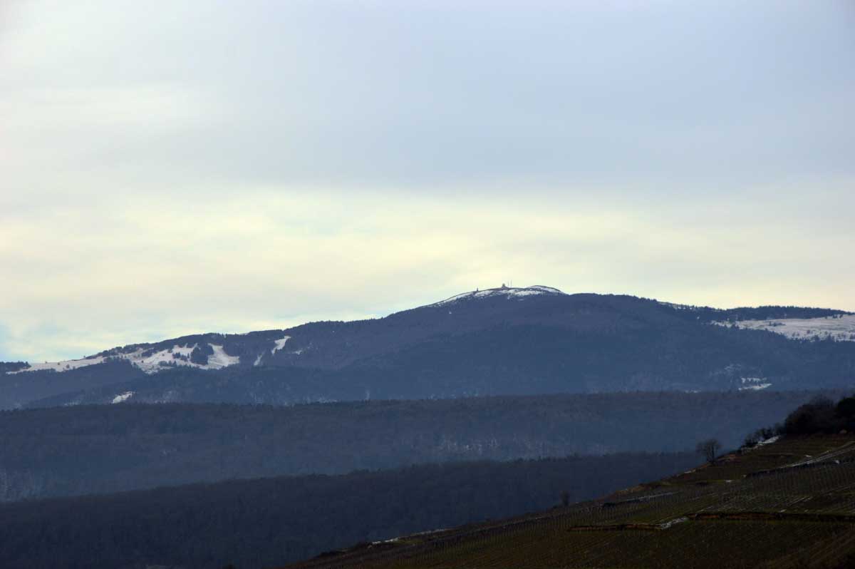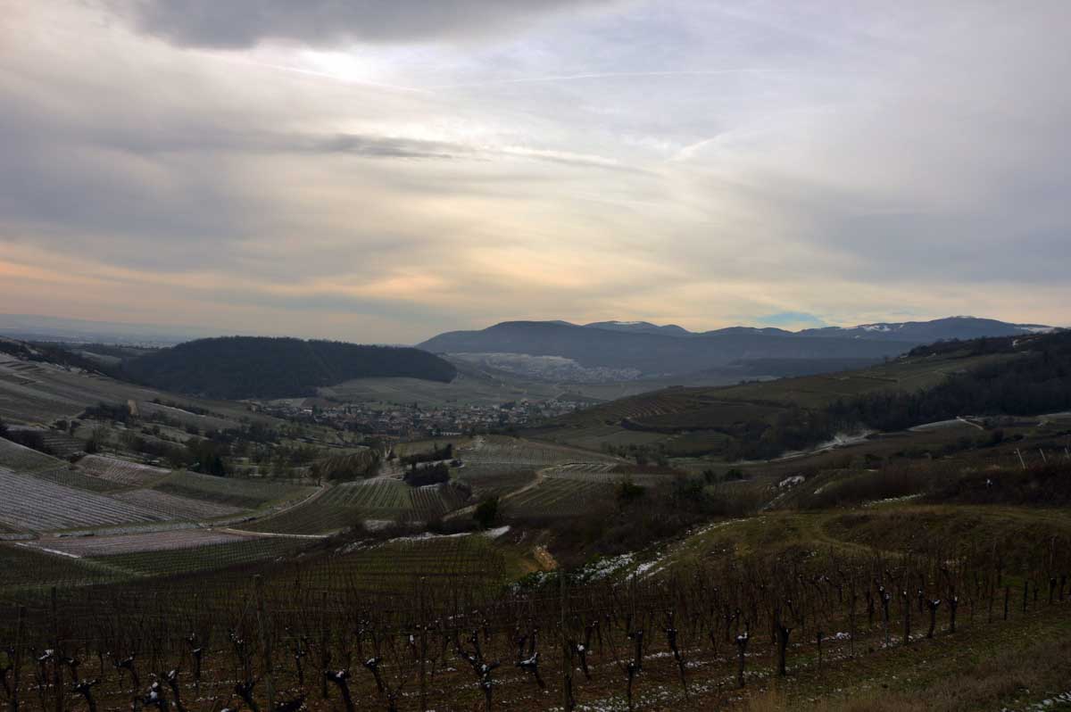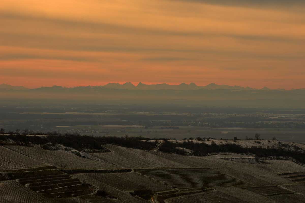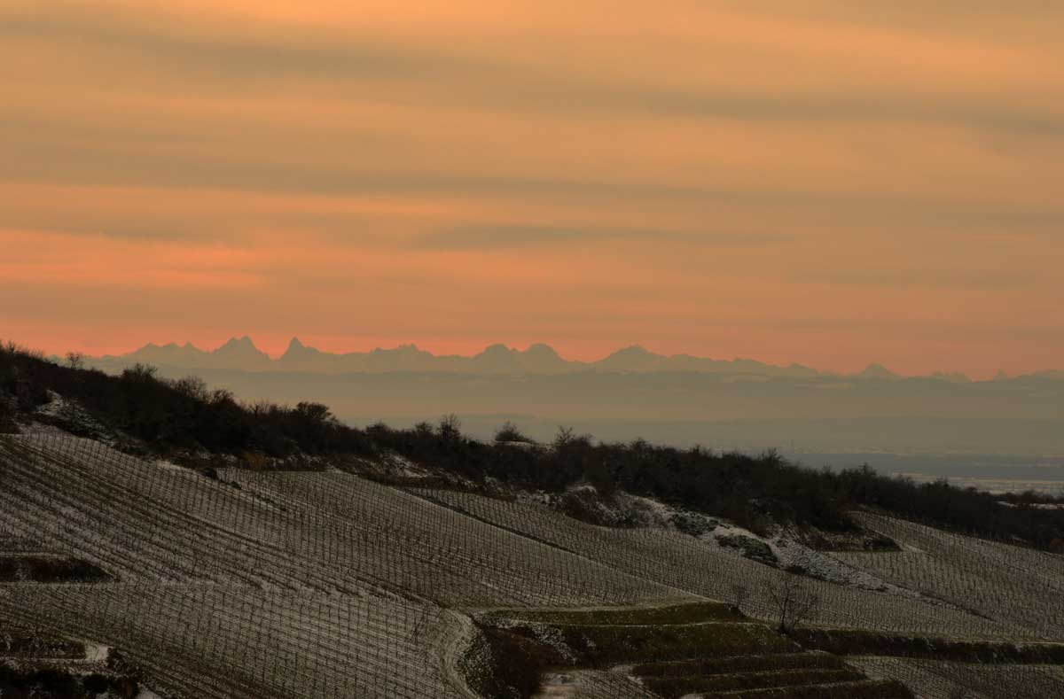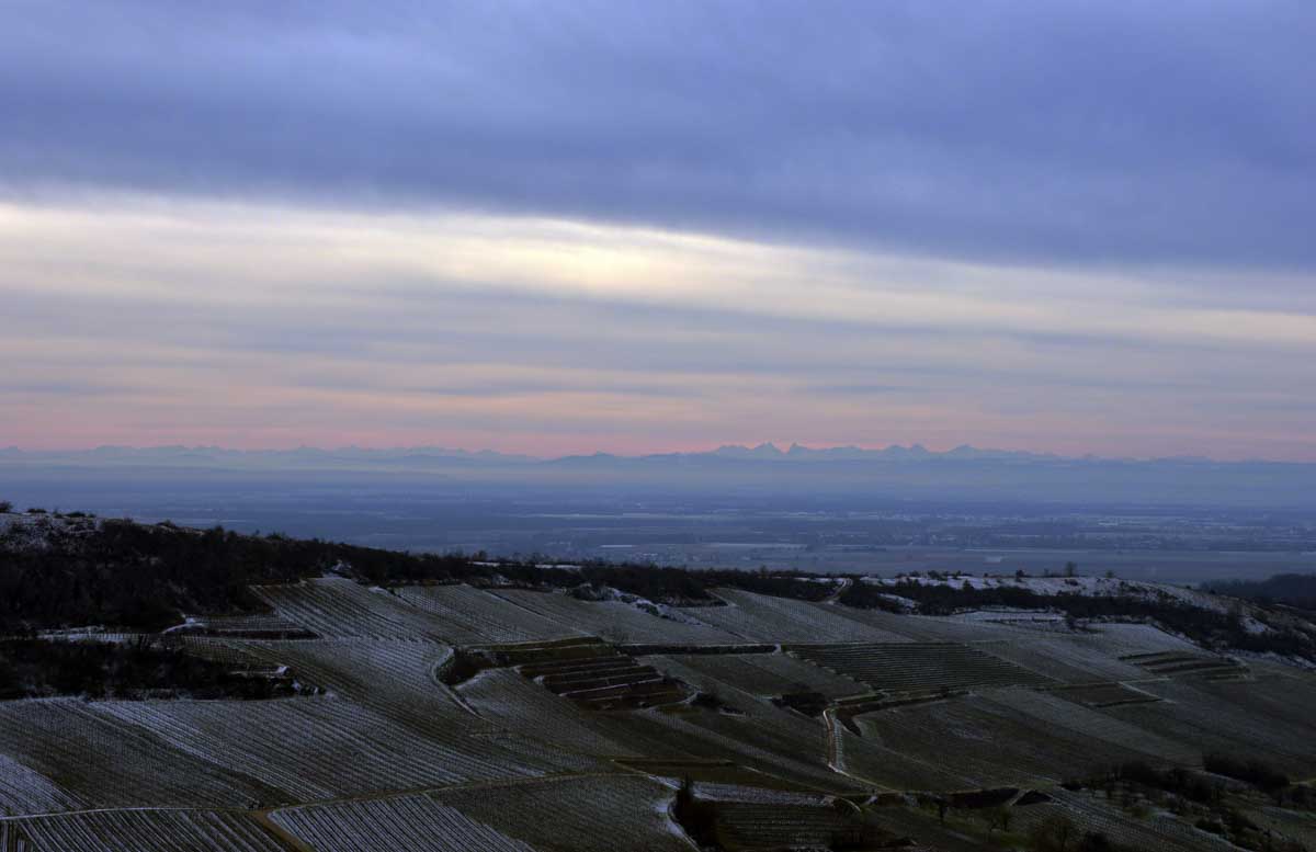 Avant le plaisir tellurique, j’ai joui du panorama sur la Forêt-Noire avec le Belchen et le Feldberg. J’ai d’abord cru que les Allemands avaient tout déneigé, mais en fait non, il n’avait simplement pas neigé. Panorama complété par l’autre, encore plus fantastique, sur les Alpes Bernoises. La Jungfrau, le Mönch et l’Eiger, tout là-bas qu’on dirait une dentition de requin qu’aurait pas une bonne mutuelle pour la garder en bon état. Et au premier plan, nos vignes toujours aussi assoupies dans le givre.