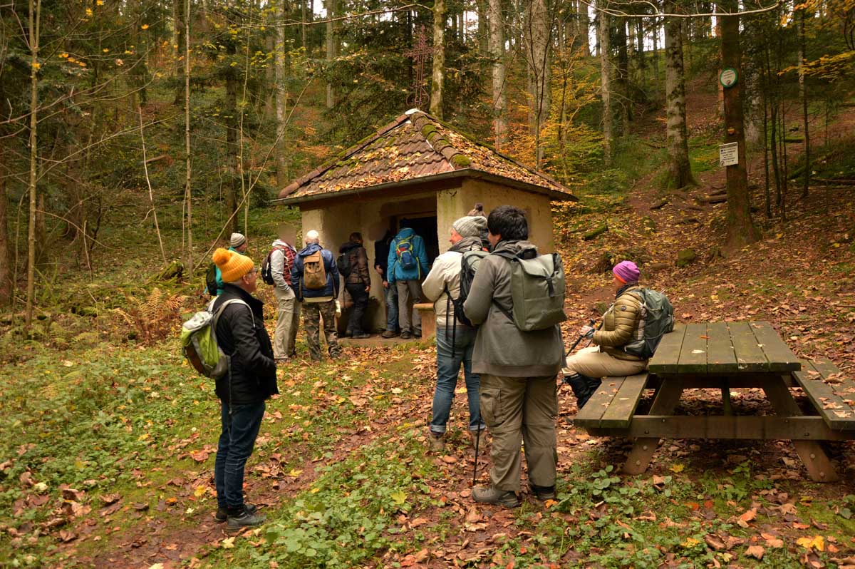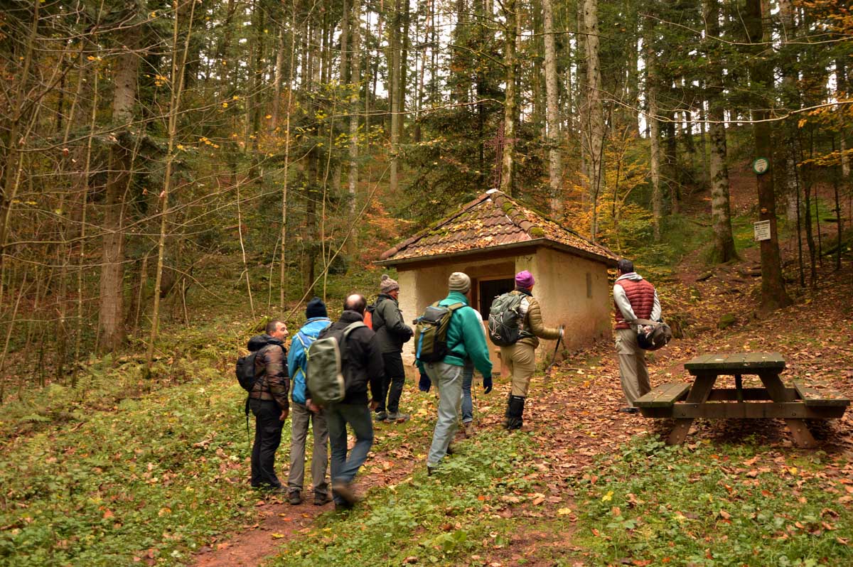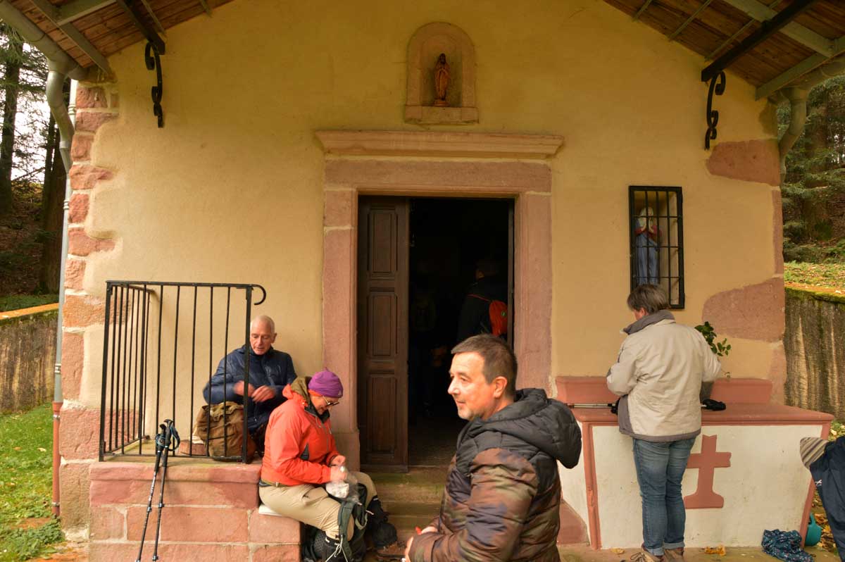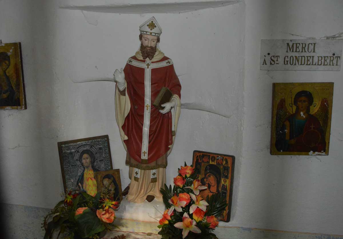 Mais quand même, le Gondelbert, c’est l’un des fondateurs de l’Abbaye de Senones au 7ème siècle. On lui a attribué une chapelle en pleine forêt. Enfin une chapelle… Un truc carré avec une croix dessus, moi tu me fais une chapelle Sainte-Karina-Iris comme ça, je te la renvoie pour que tu me la recommences. Mais bon, au moins il y a une statue de Gondelbert à l’intérieur, et même un ex-voto.