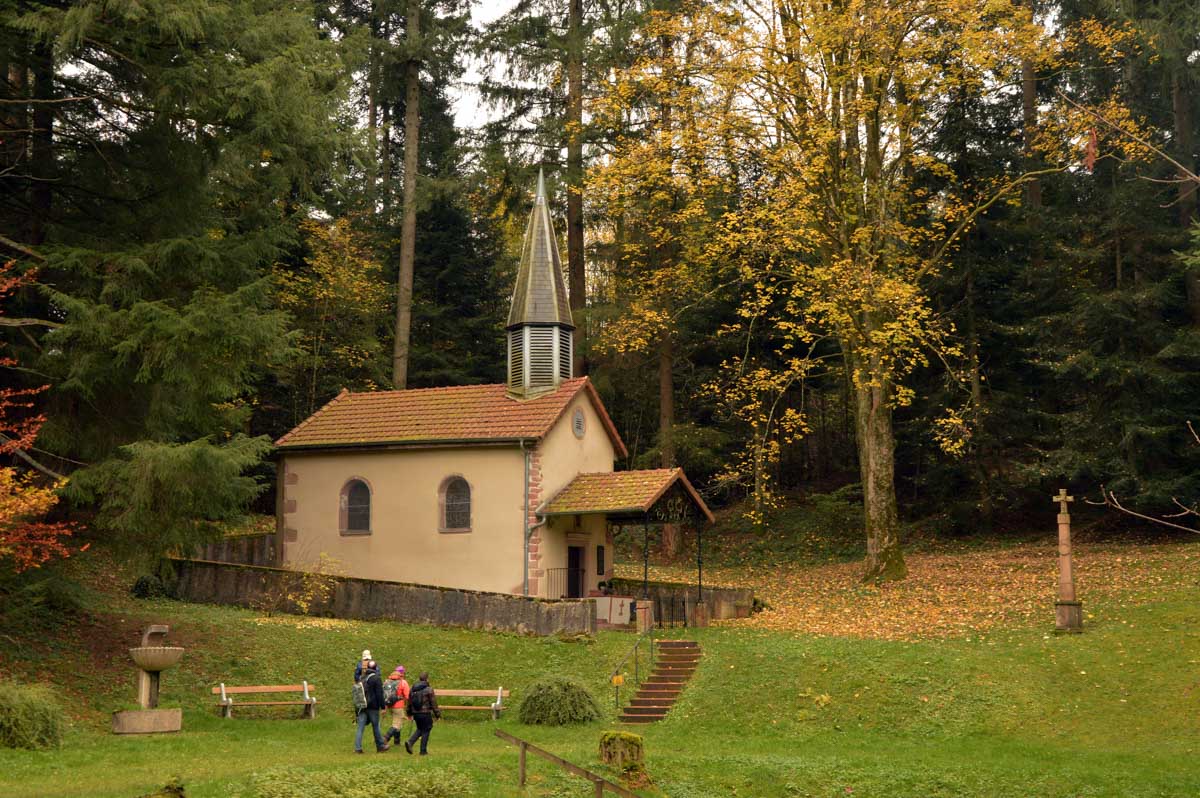 Mais entre temps, notre Fave traverse Provenchères. Et c’est là qu’on l’attendait ! Puis montée tranquille vers la chapelle Saint-Gondelbert. Un Gondelbert, j’en connais pas non plus. T’imagines en soirée ? Salut moi c’est Karina-Iris. Enchanté, moi c’est Gondelbert. Là je pouffe, je m’esclaffe (rassure-toi ça fait pas mal), je glousse, je me gausse malgré mes courbes (cherche pour celle-là), je me gondole, oh pardon Gondelbert mais vas voir tes parents pour qu’ils te rebaptisent. Et encore t’as échappé à Goudembert qui est un dérivé. Franchement, je compatis.