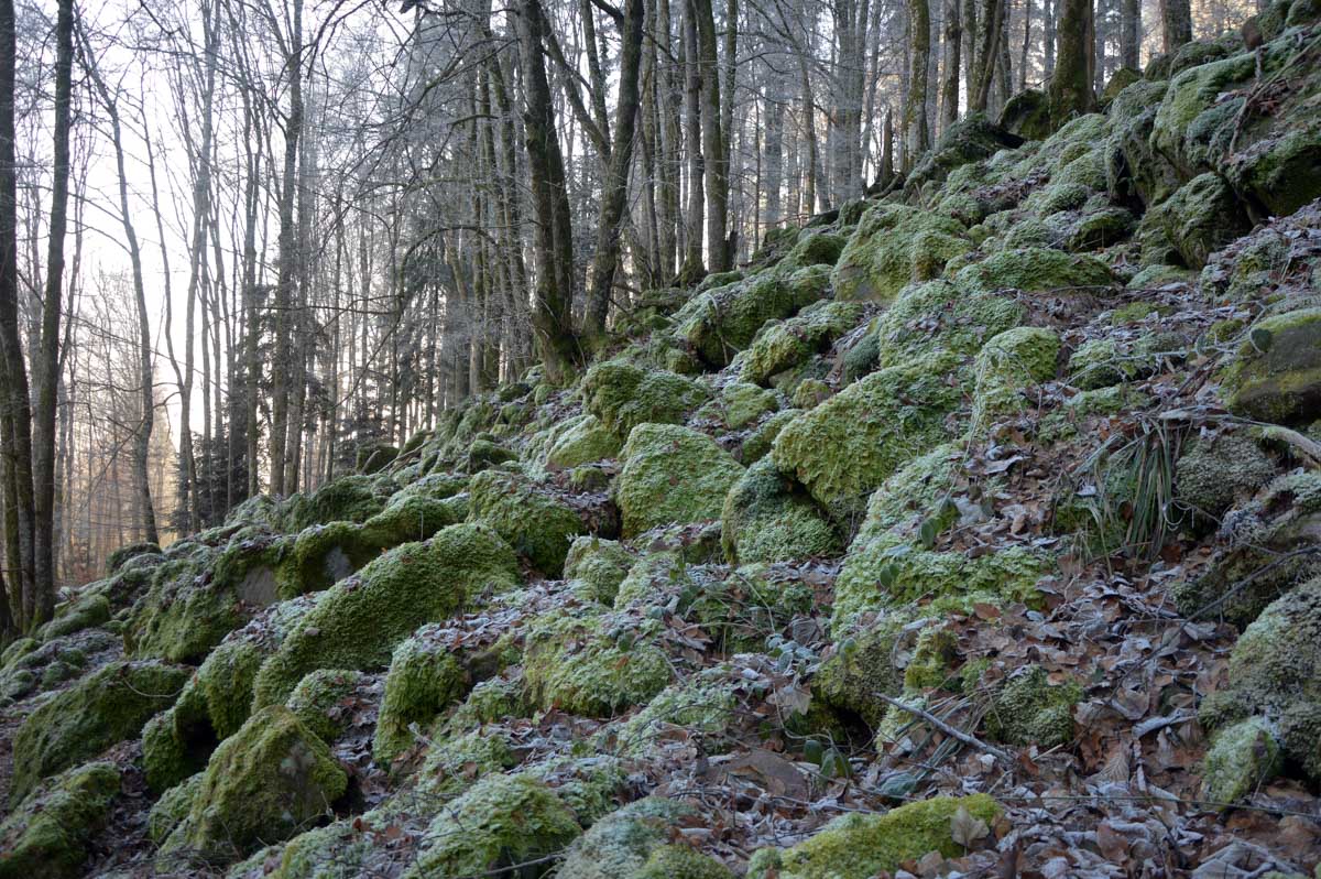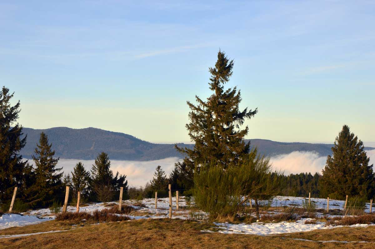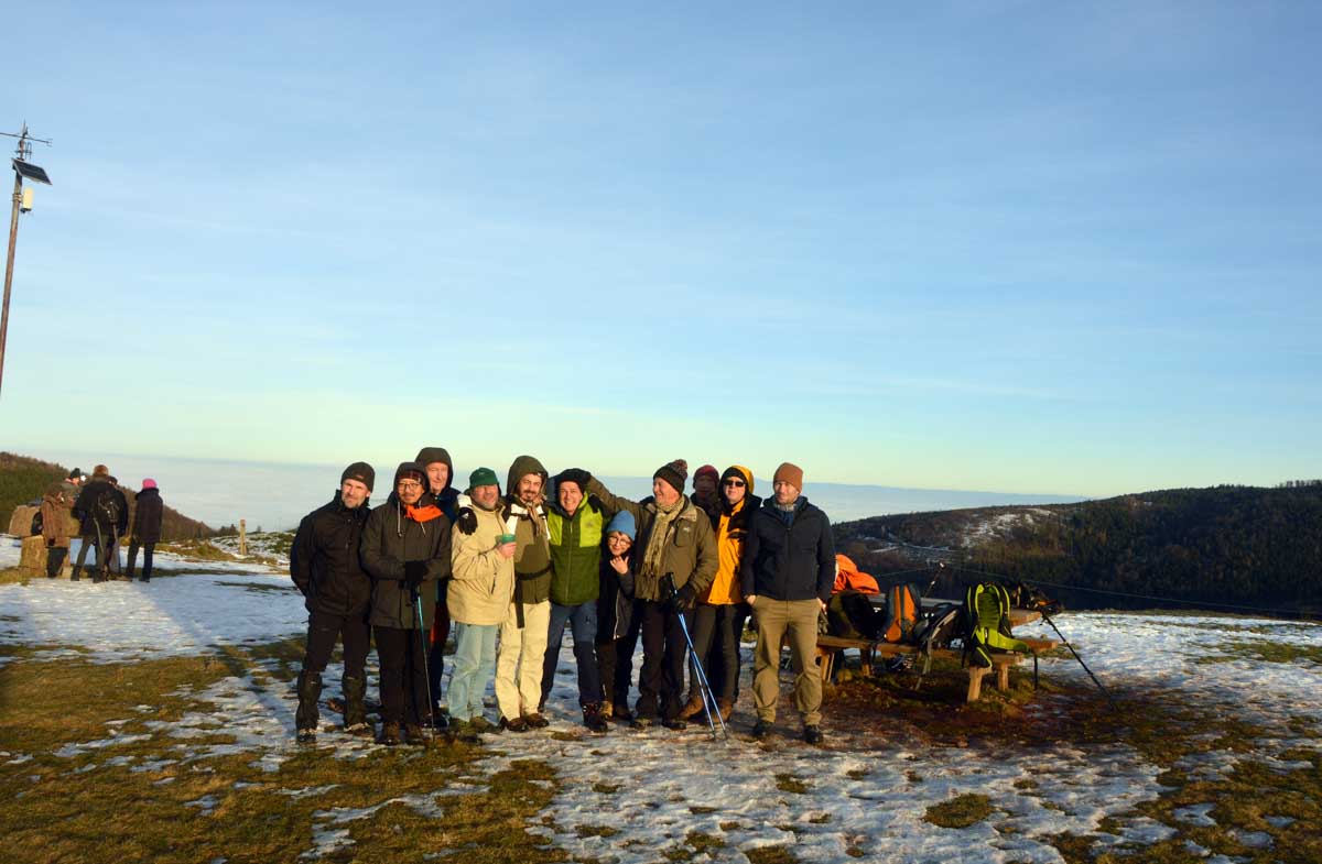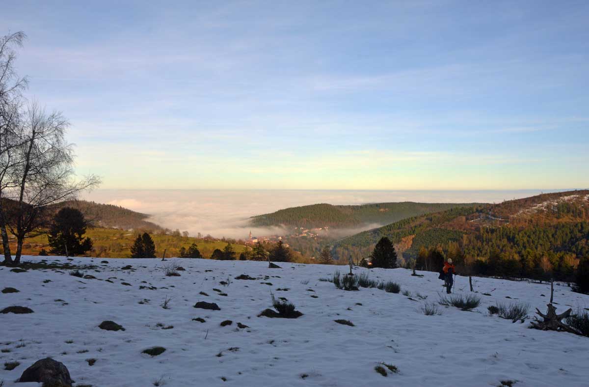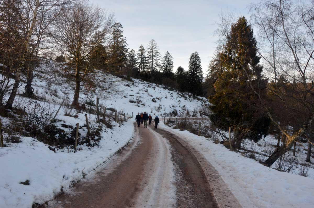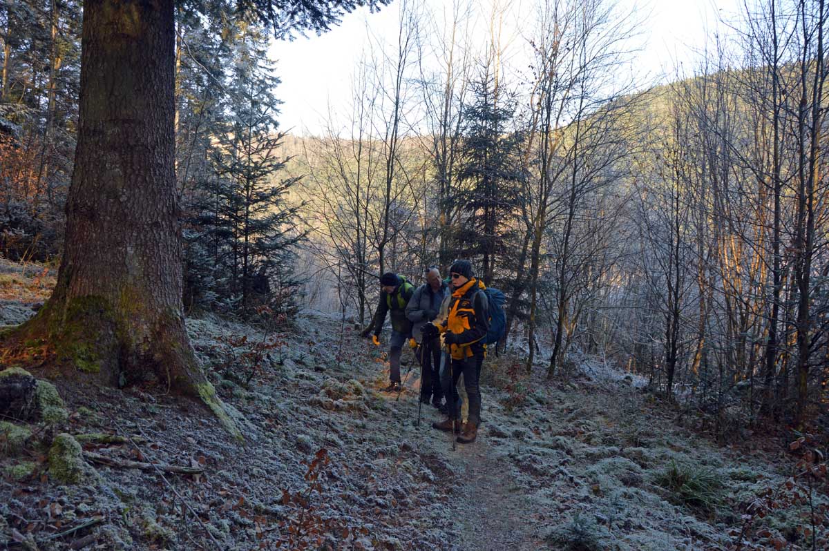 Direction Grendelbruch avant une marche dans l’ombre de la forêt. Encore une belle idée ça, marcher à l’ombre dans ce froid, sous les arbres gelés ! M’enfin bon, je râle pas, je me retiens, tout va bien. Finalement, c’était pas si irréfléchi que ça puisque comme on contournait un sommet, on a fini par se retrouver sur la face sud et donc un peu moins au froid.