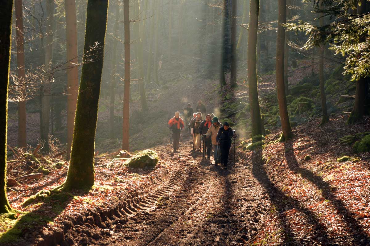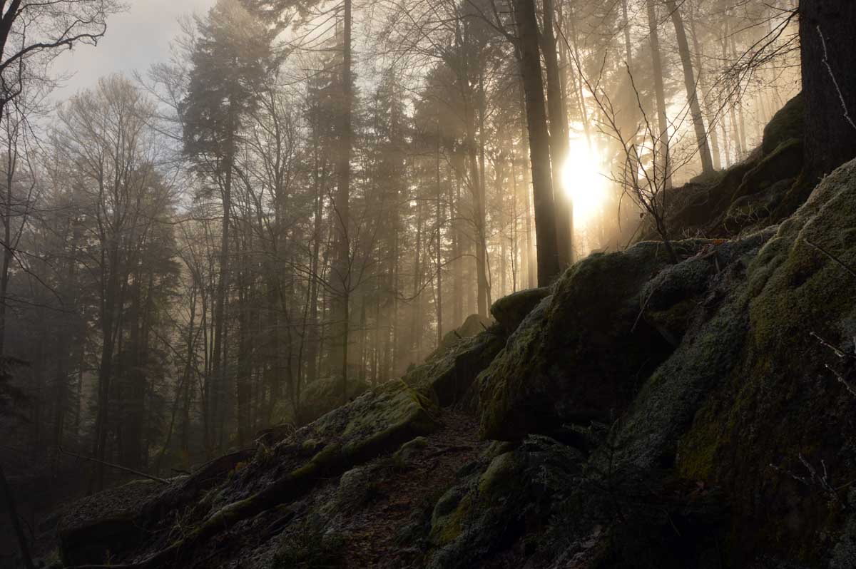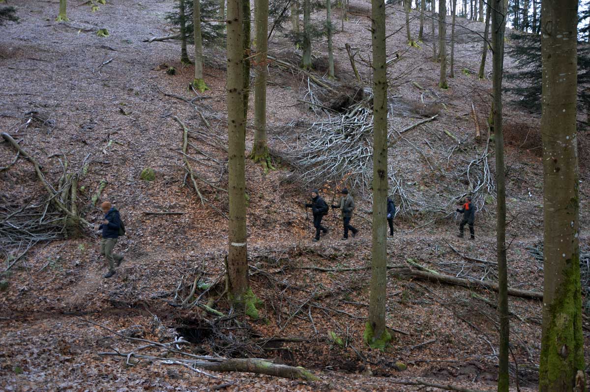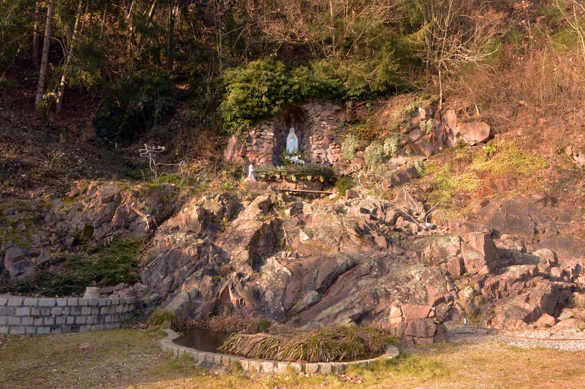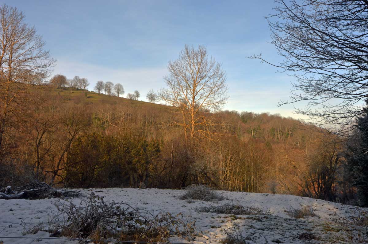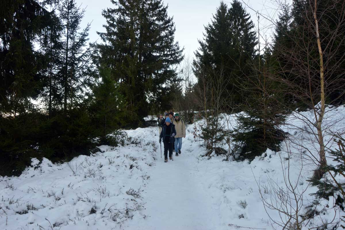 Direction Grendelbruch avant une marche dans l’ombre de la forêt. Encore une belle idée ça, marcher à l’ombre dans ce froid, sous les arbres gelés ! M’enfin bon, je râle pas, je me retiens, tout va bien. Finalement, c’était pas si irréfléchi que ça puisque comme on contournait un sommet, on a fini par se retrouver sur la face sud et donc un peu moins au froid.